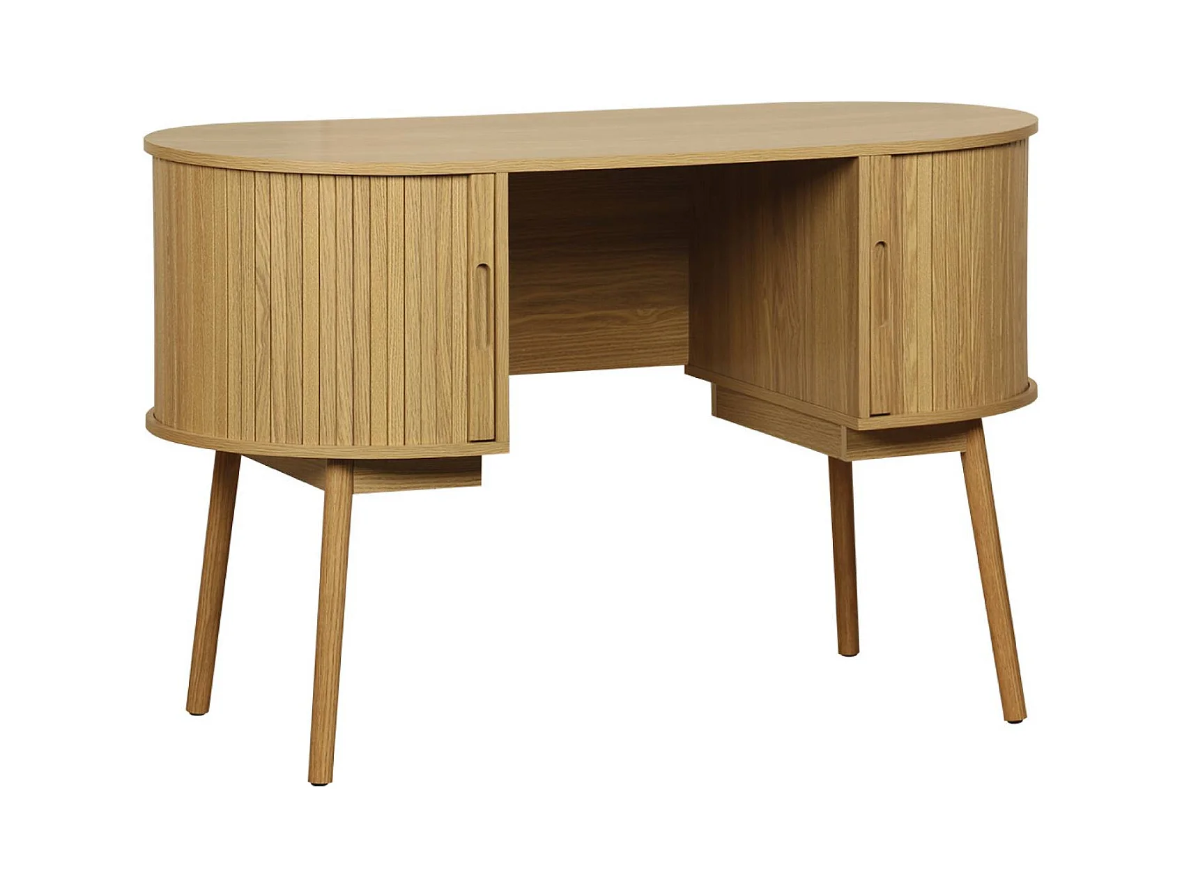 Bureau ovale décor bois rainuré avec deux espaces de rangement. L 120 x P 55 x H 77 cm