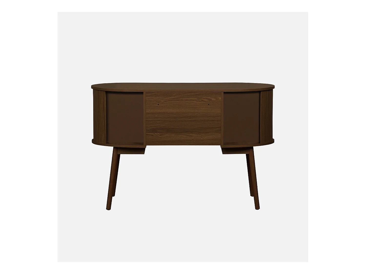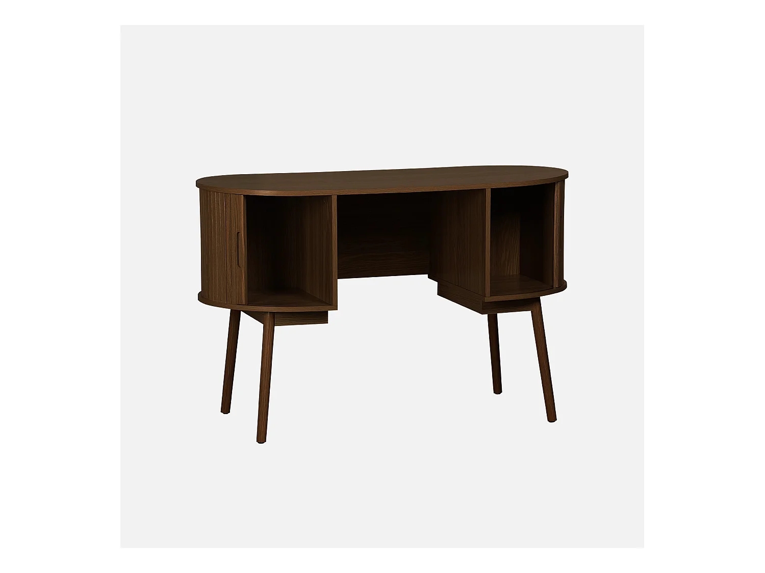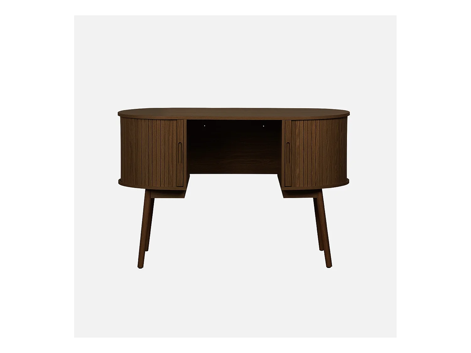 Bureau ovale décor bois rainuré avec deux espaces de rangement. L 120 x P 55 x H 77 cm