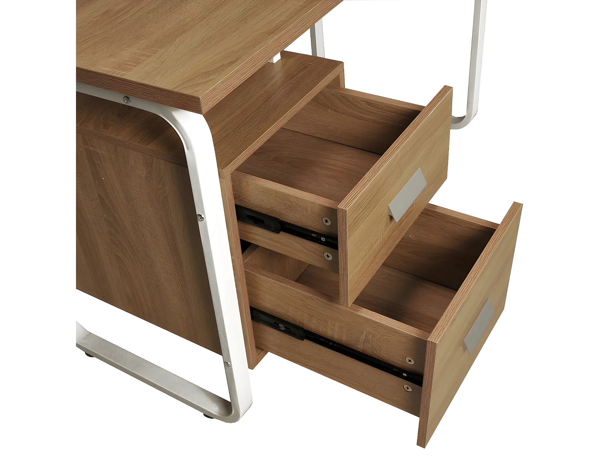 Bureau d'angle bureau informatique multimédia multi-rangement métal panneaux particules aspect chêne clair blanc