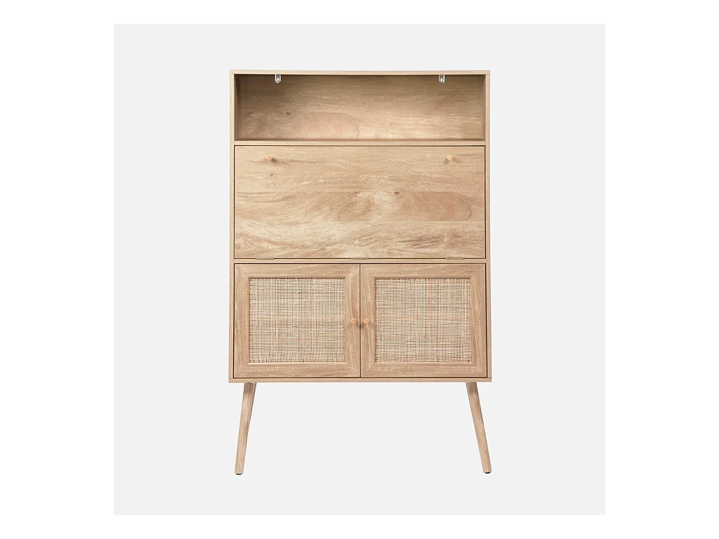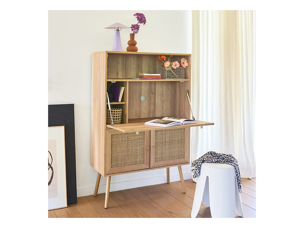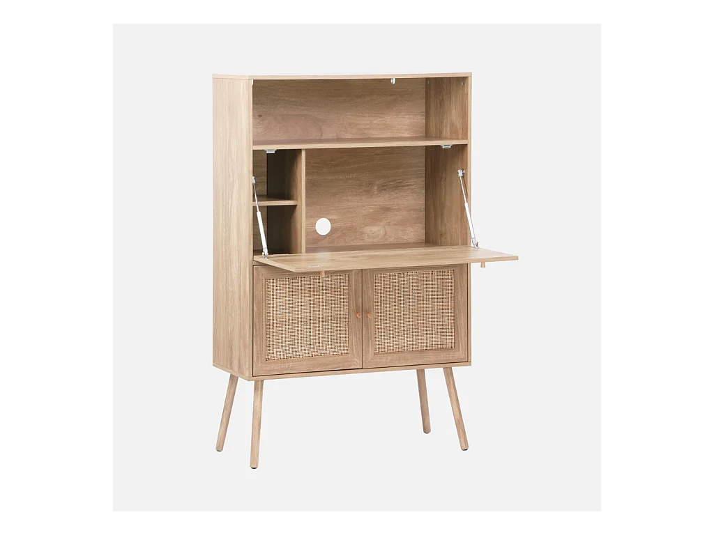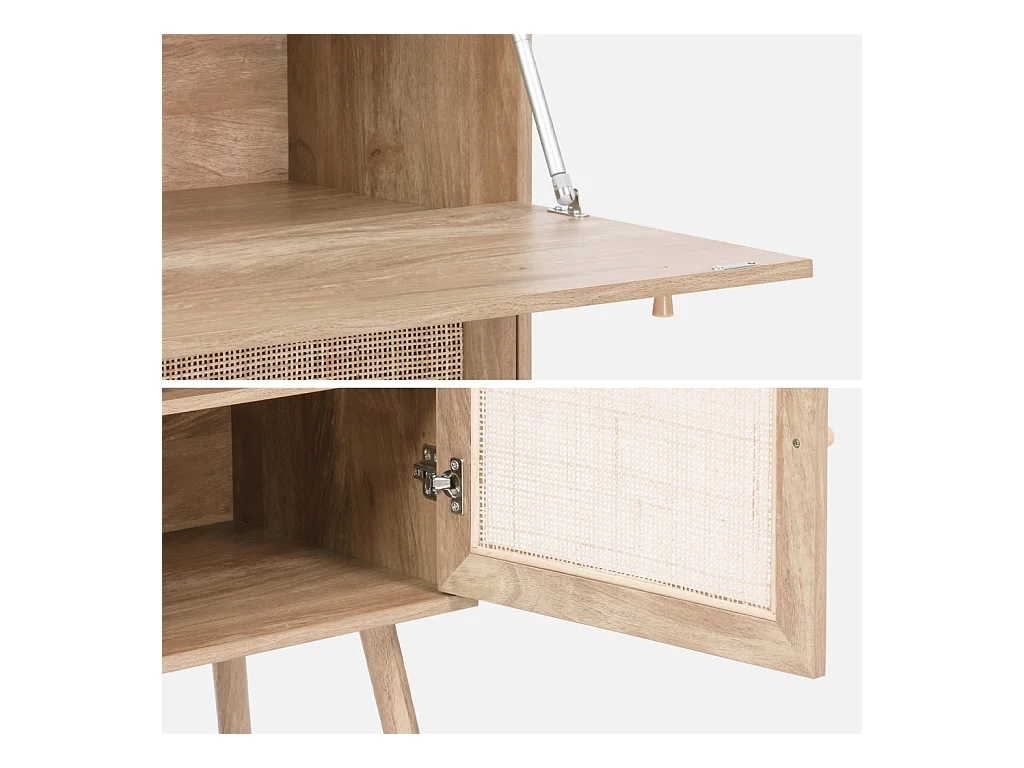 Bureau secrétaire. 2 portes en cannage. étagères. décor bois. pieds en bois de sapin