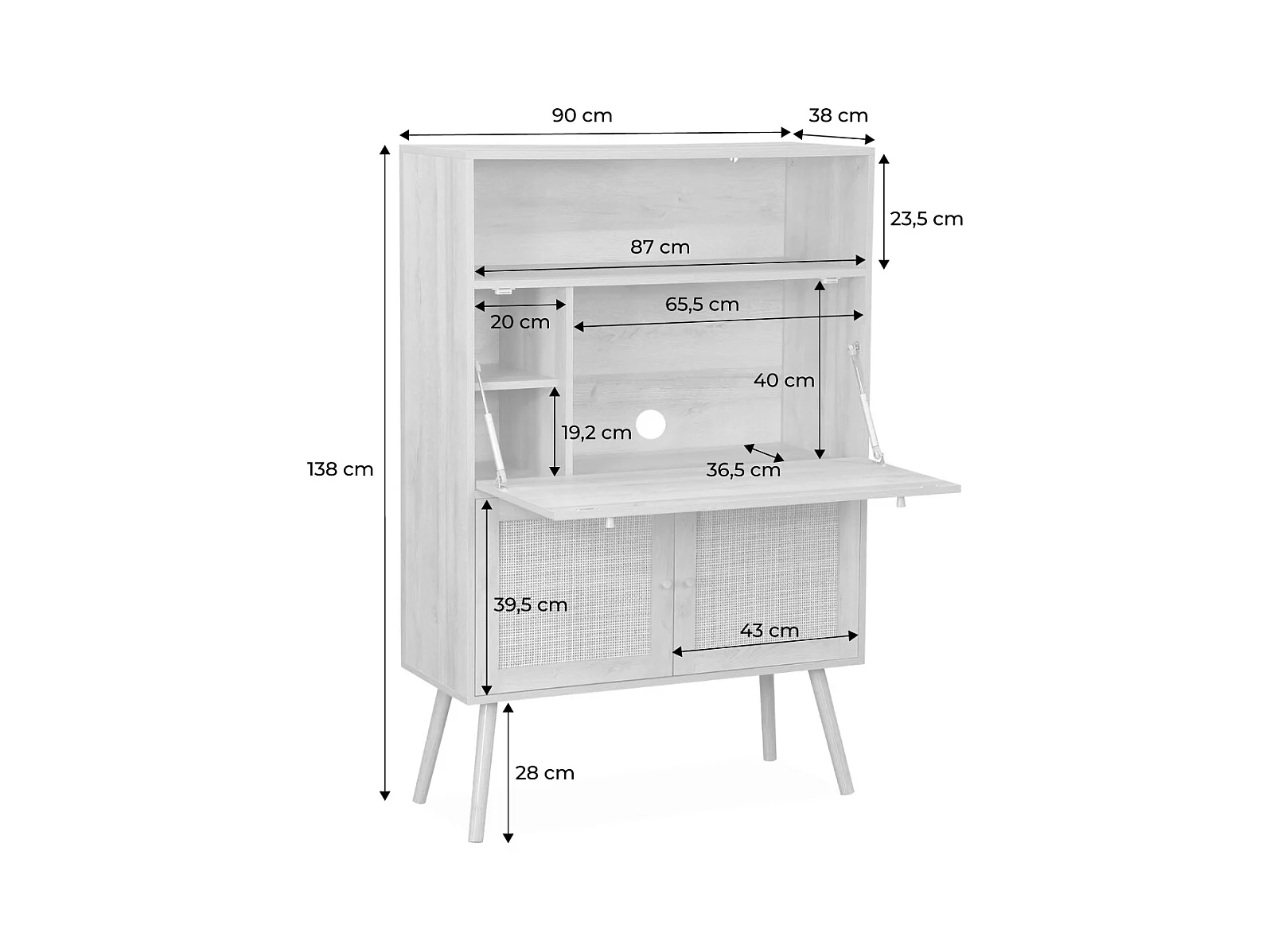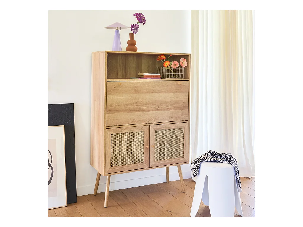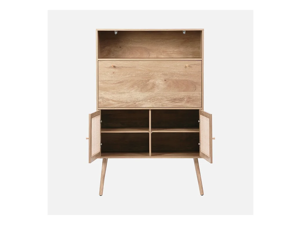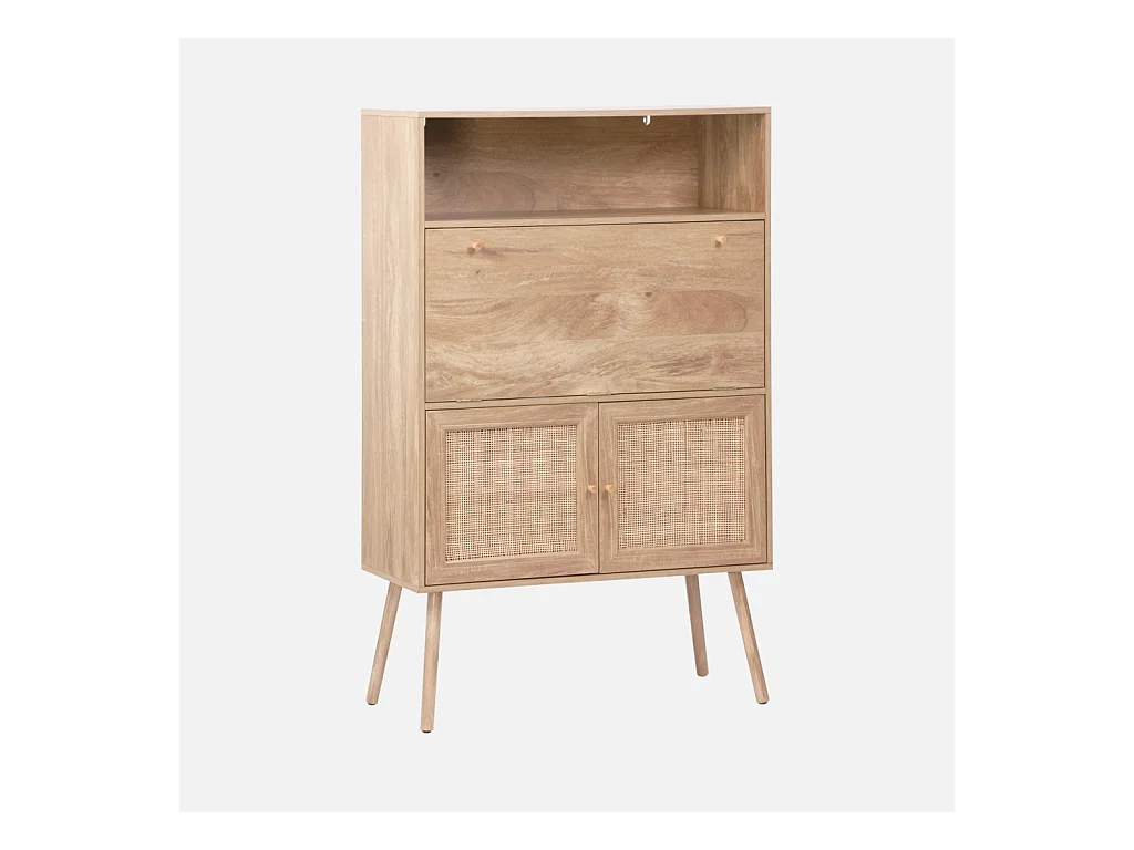 Bureau secrétaire. 2 portes en cannage. étagères. décor bois. pieds en bois de sapin