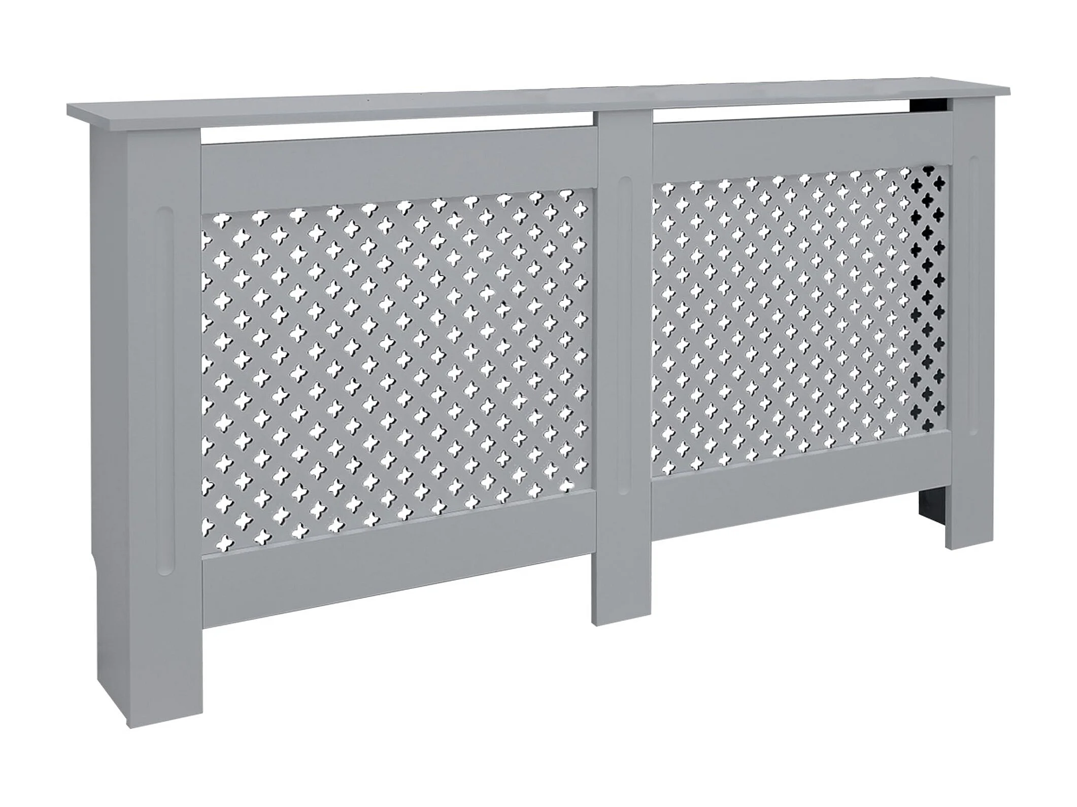 Cache-radiateur 152x19x82 cm gris à lattes croisées avec une surface d'étagère habillage robuste en bois MDF matériel de montage mural inclus