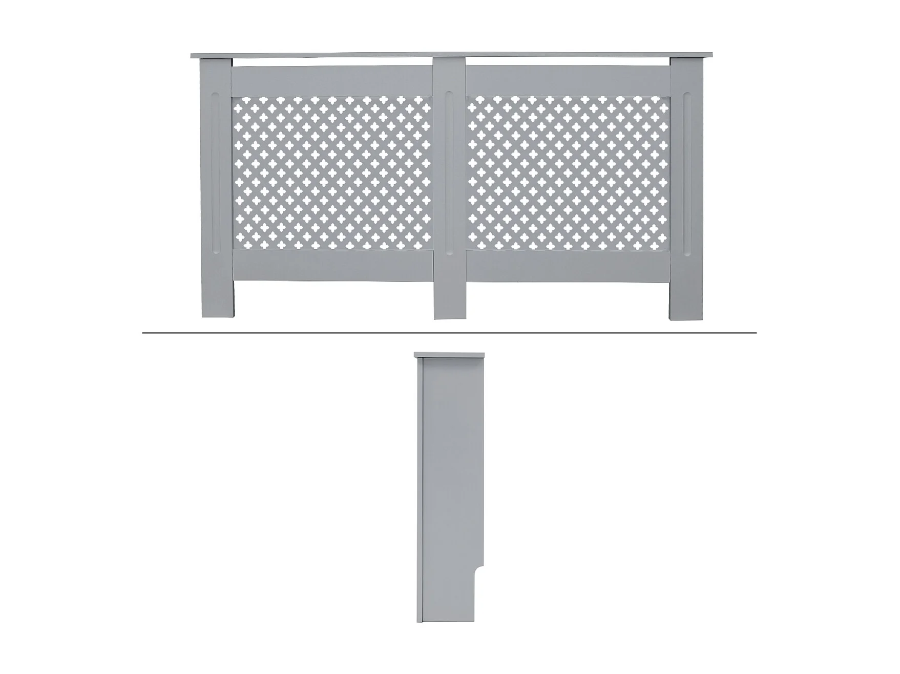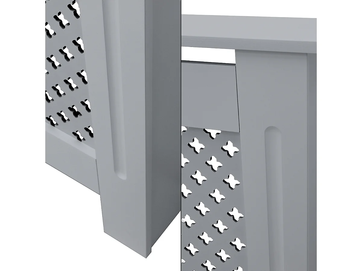 Cache-radiateur 112x19x82 cm gris à lattes croisées avec une surface d'étagère habillage robuste en bois MDF matériel de montage mural inclus