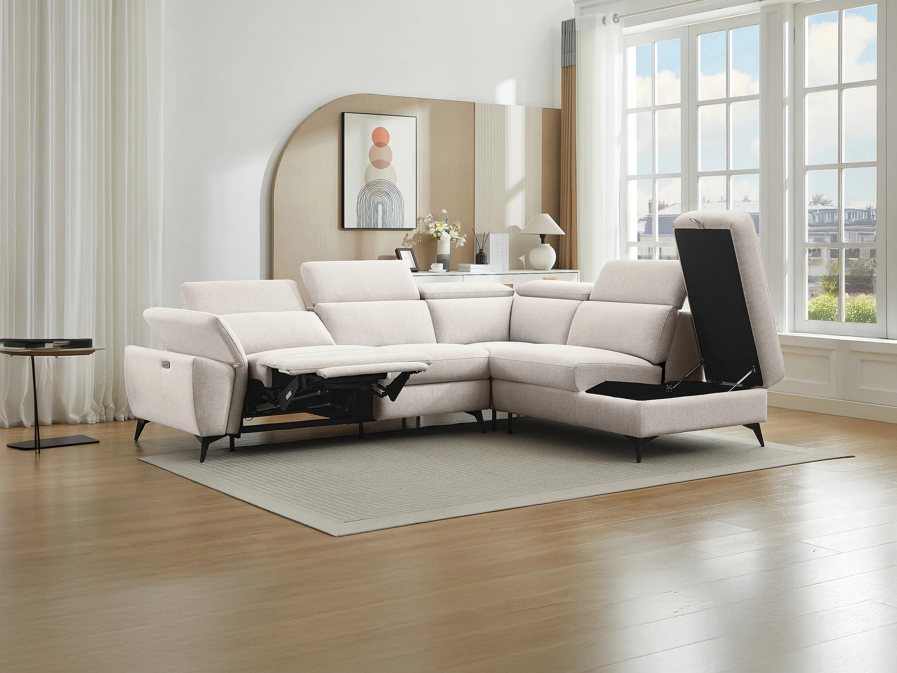 Canapé d'angle droit relax électrique en tissu chiné beige CADILO