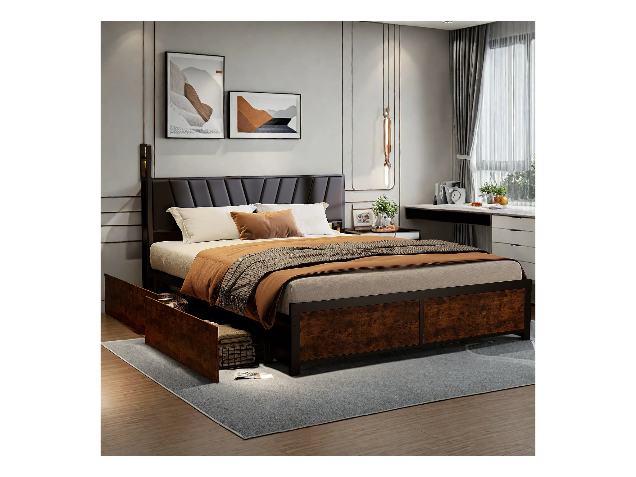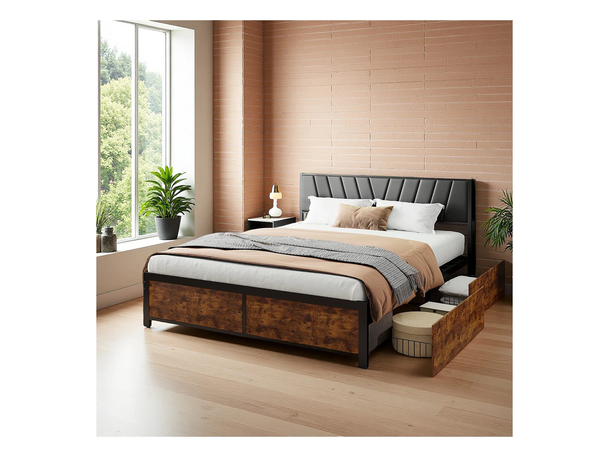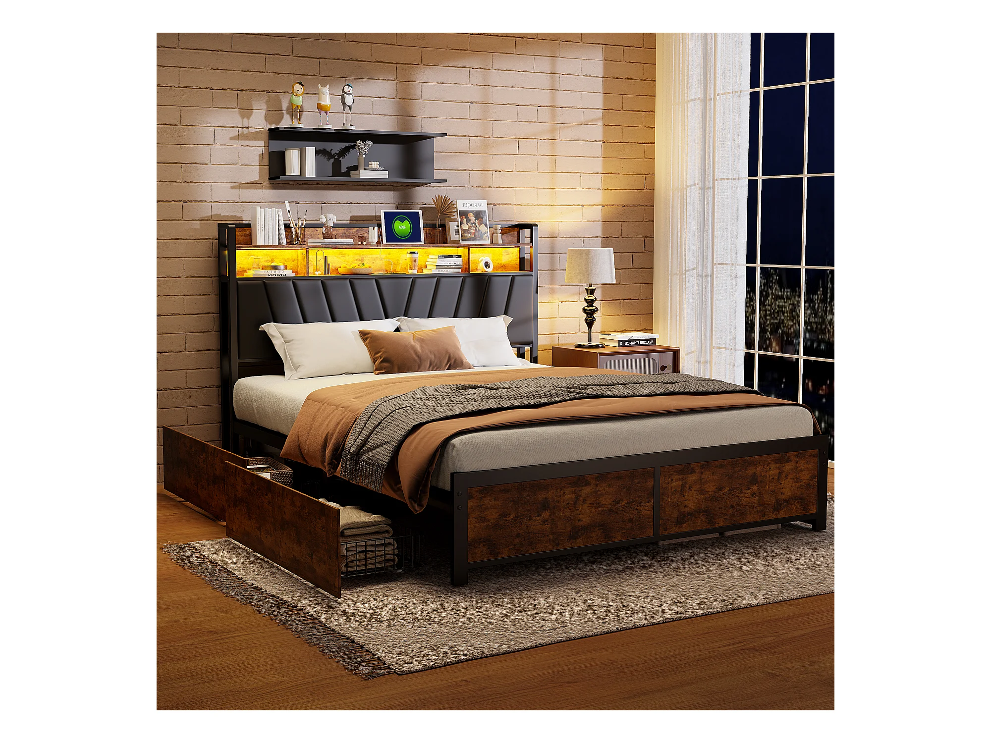 Cadre de Lit Double 160x200 cm avec Tiroirs Coulissants et LED, en Métal Noir et Bois – Parfait pour Chambre d'Adultes, USB