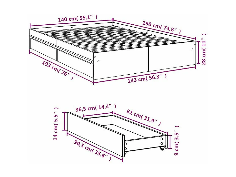 Cadre de lit et tiroirs chêne fumé 140x190 bois d'ingénierie