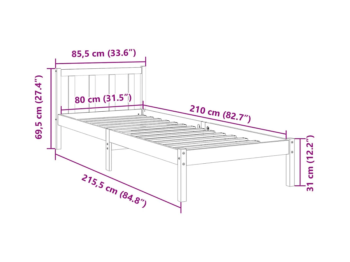 Cadre de lit extra long sans matelas 80x210 cm bois massif pin