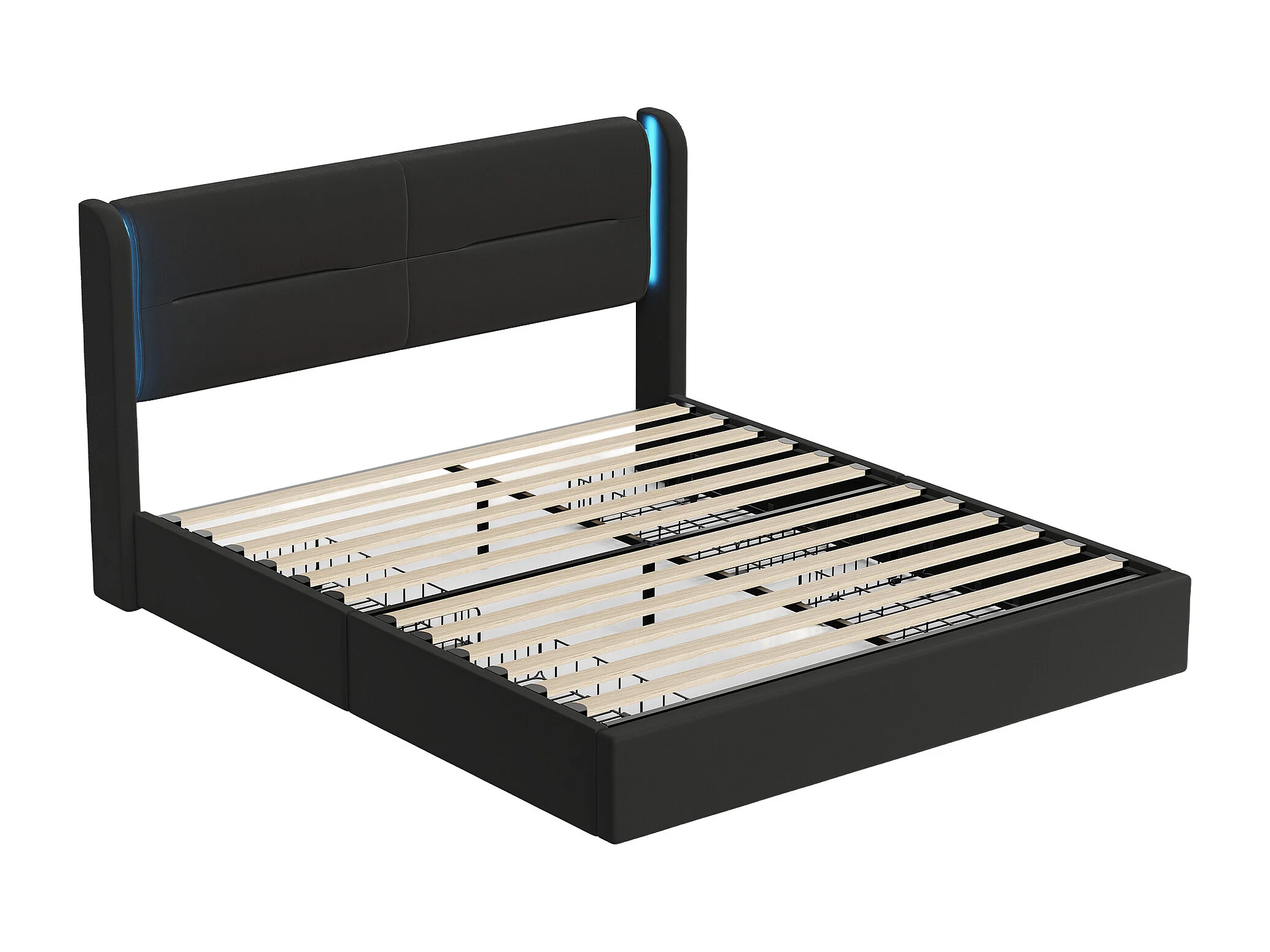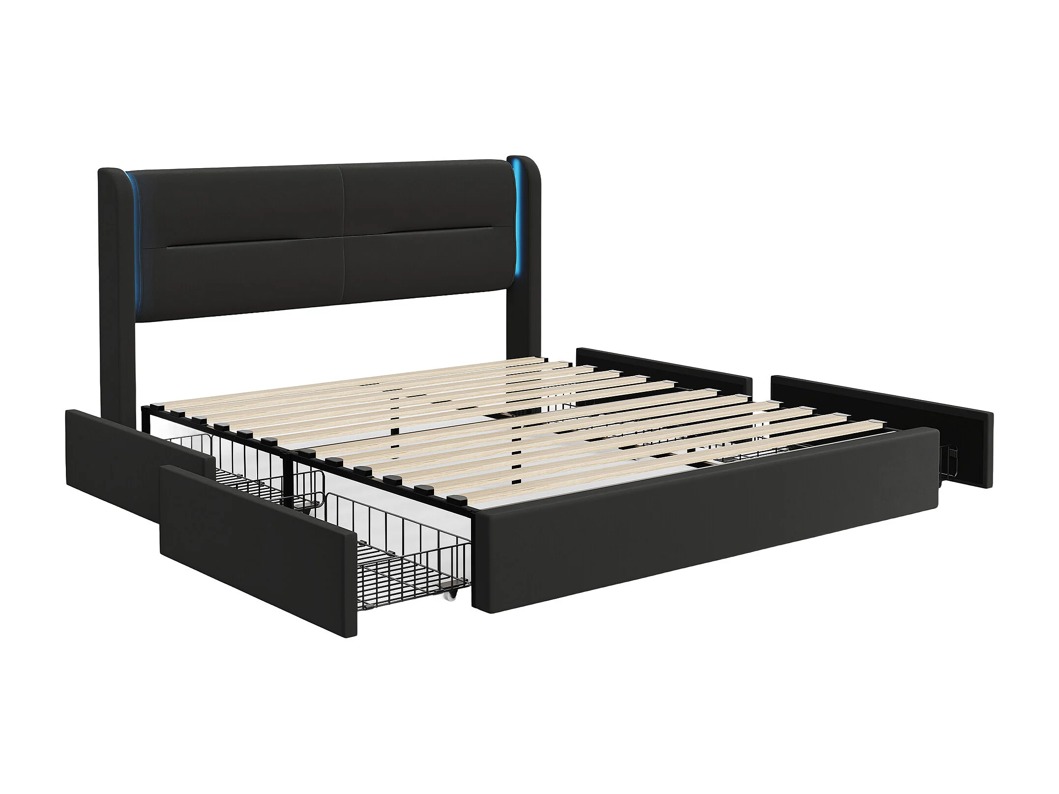 Cadre de lit moderne 140x200 cm avec tête de lit LED, 4 tiroirs pratiques, rembourrage épais, doubles ports USB et ailes latérales confortables, noir.