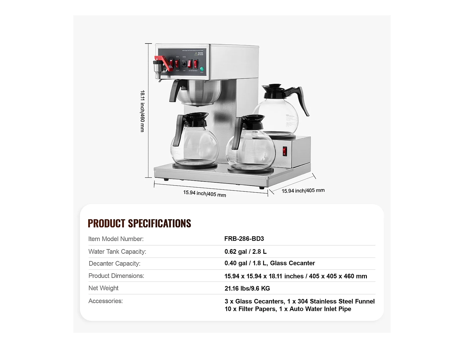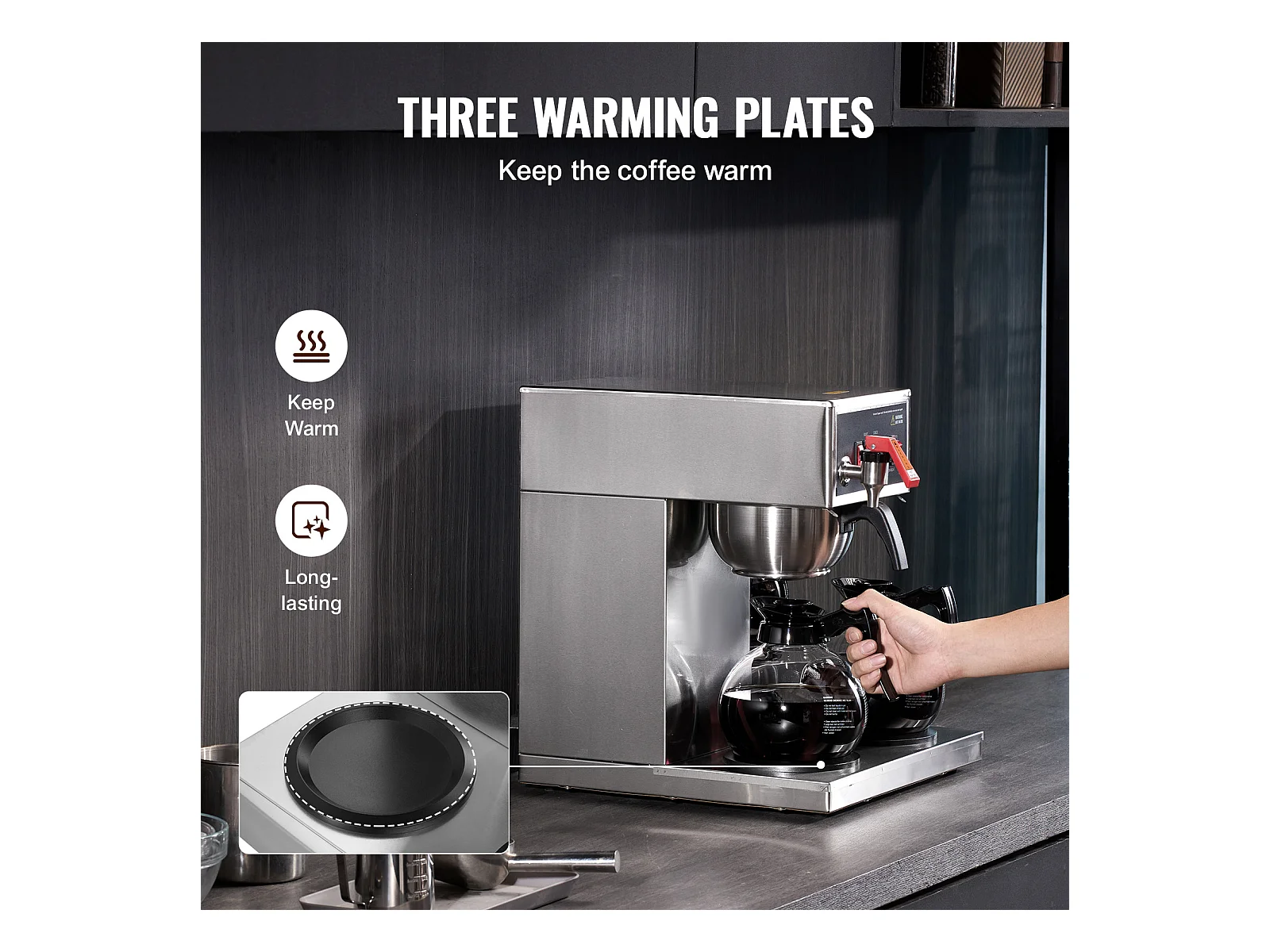 Cafetière à Filtre SucceBuy Commerciale 12 Tasses avec 3 Carafes et Réchauds, Prise d'Eau Automatique pour Restaurant, Bureau, Café