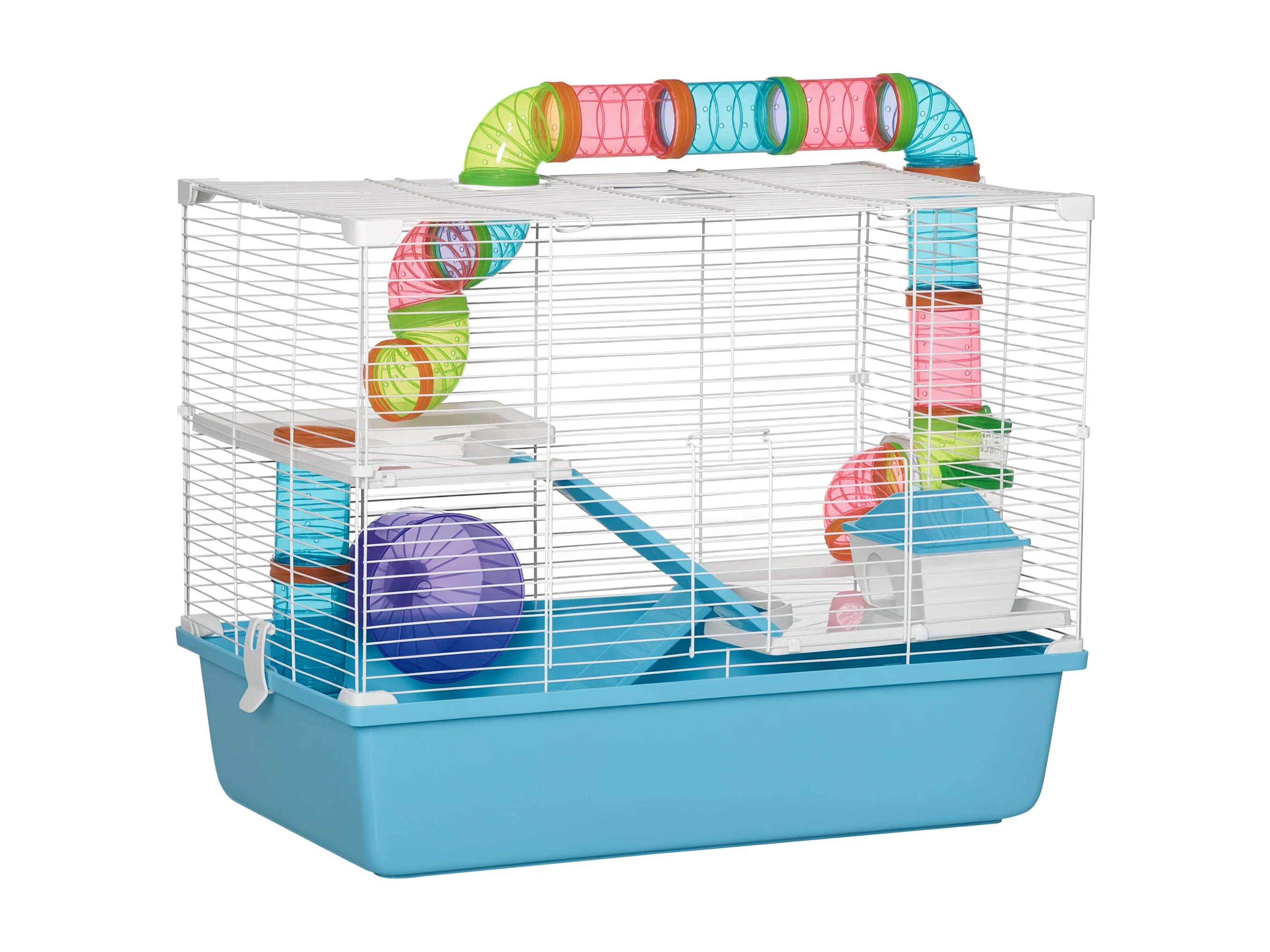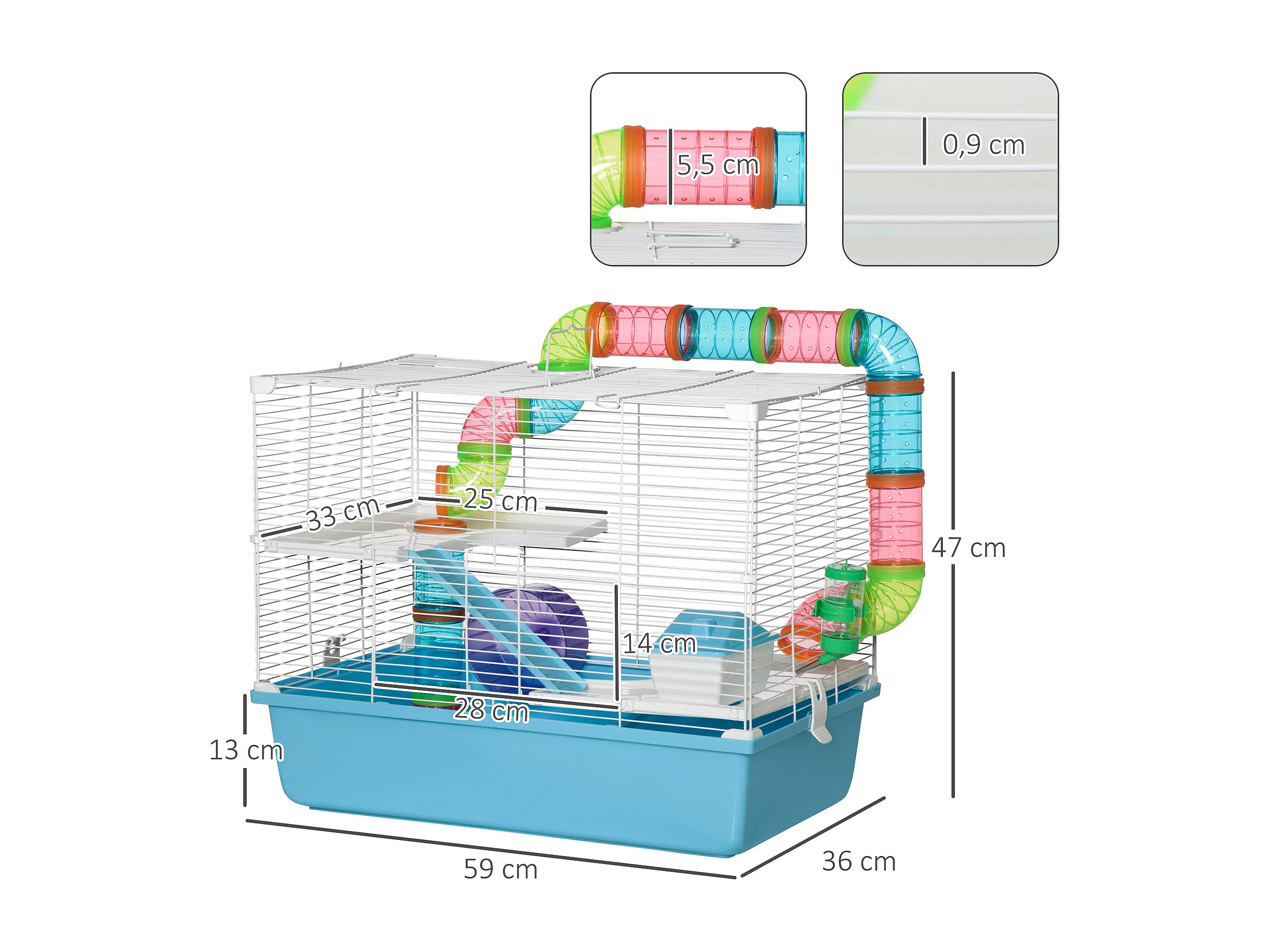 Cage à hamsters 3 niveaux - tunnel, abreuvoir, roue, maisonnette, échelles - dim. 59L x 36l x 47H cm - métal PP bleu blanc