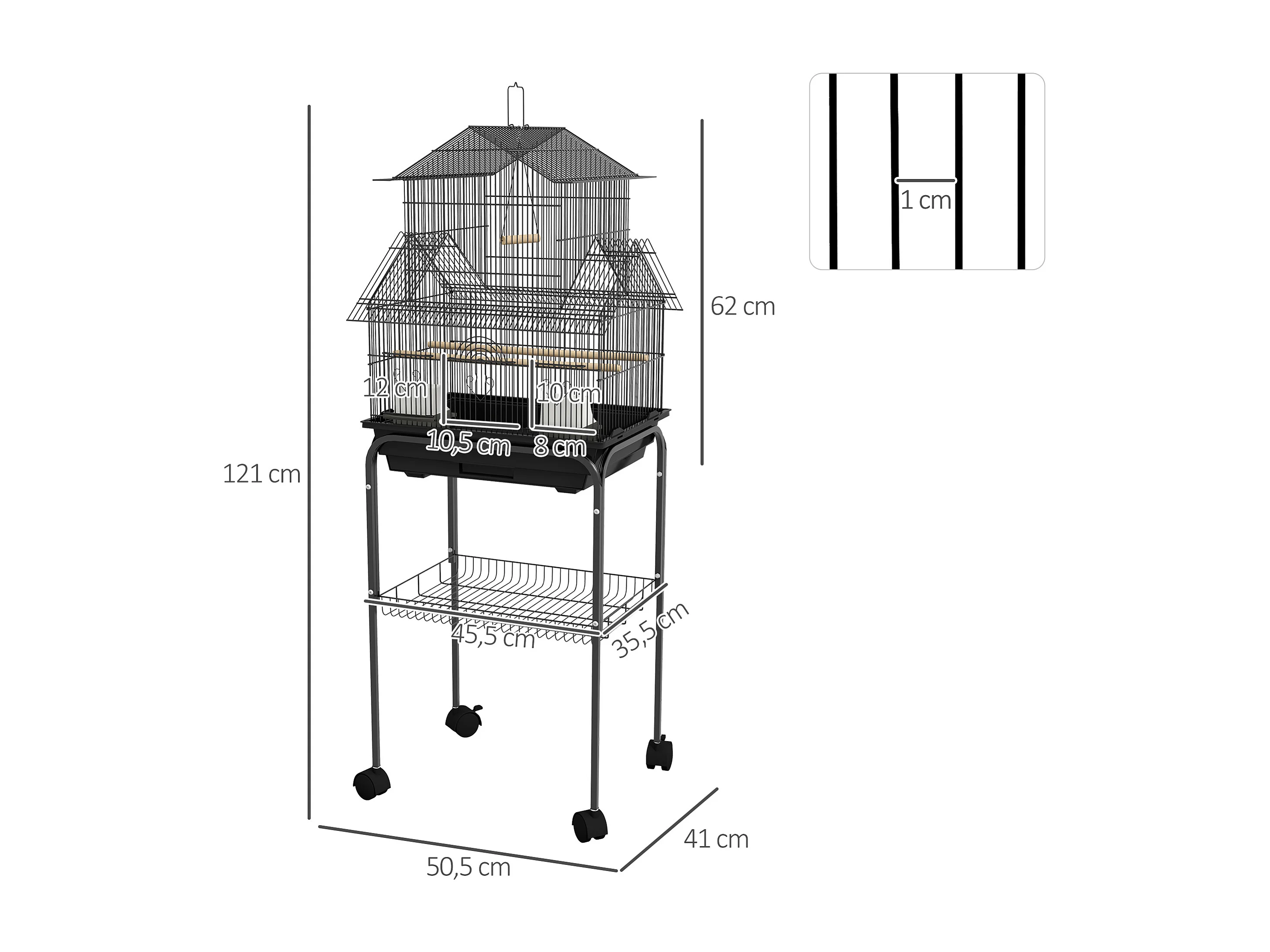 Cage à oiseaux sur pied volière avec 2 mangeoires perchoirs plateau amovible poignée et roulettes - 50 x 58 x 137-145 cm noir