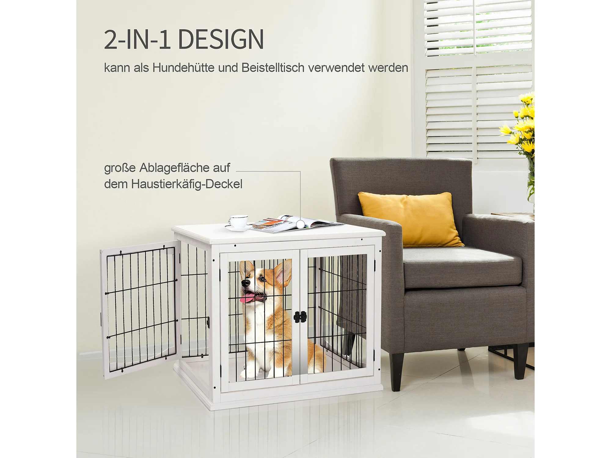 Cage de transport pour chien, design moderne avec 2 portes, MDF et métal, blanc (58.5x81x66 cm)