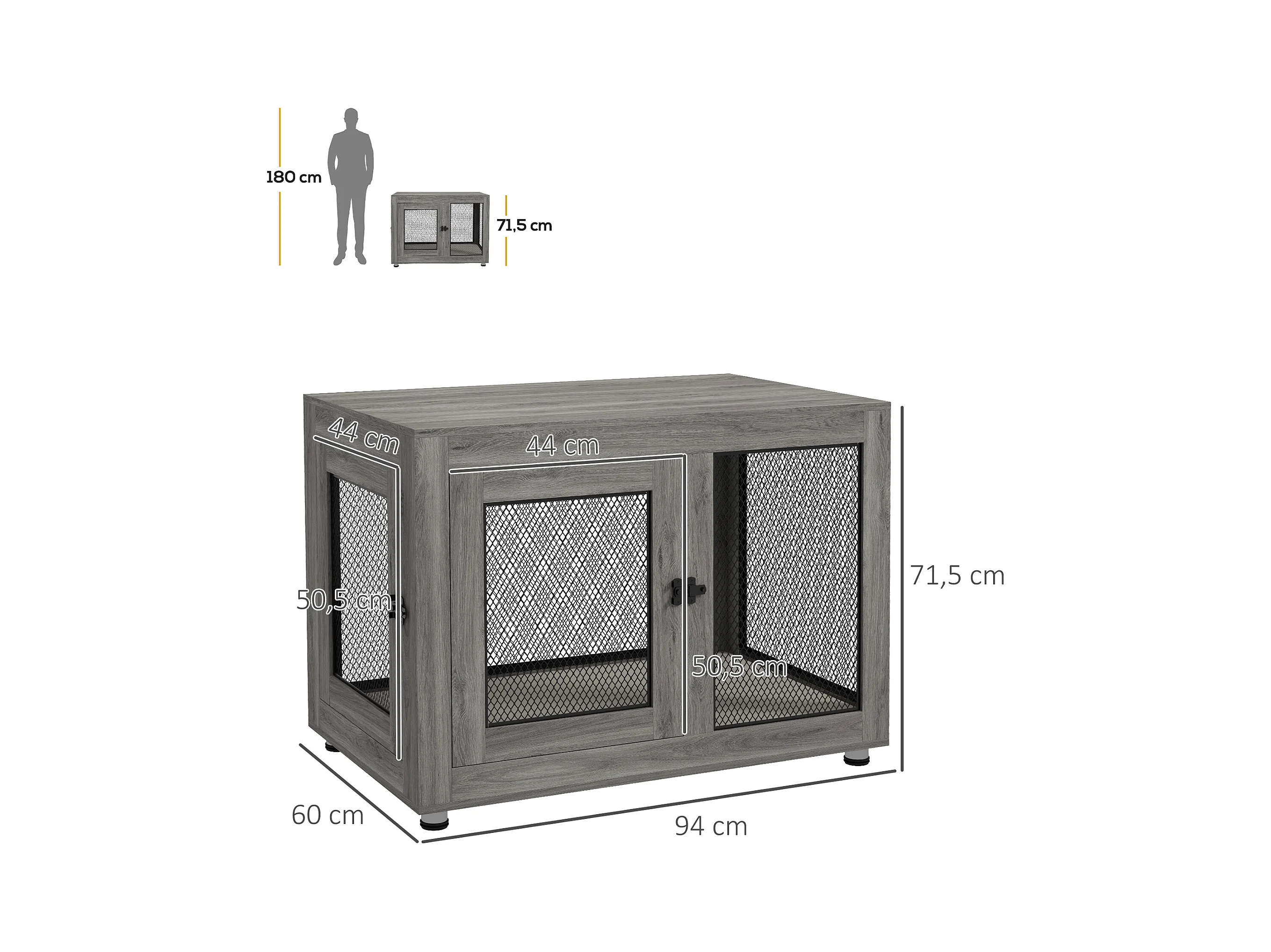 Cage pour chien à 2 portes, design robuste et confortable, contreplaqué, gris, avec coussin lavable et pieds réglables (94x60x71.5cm)