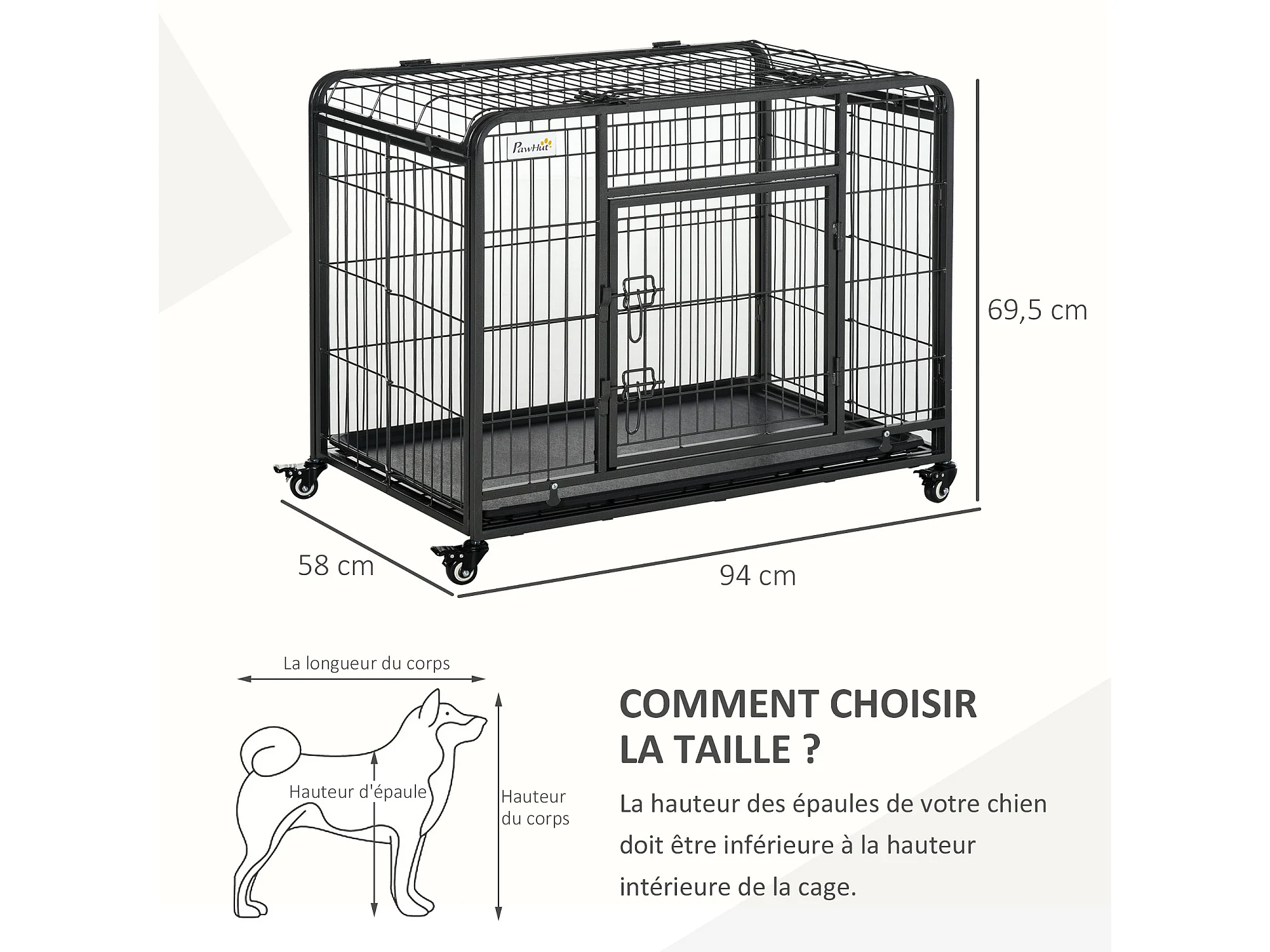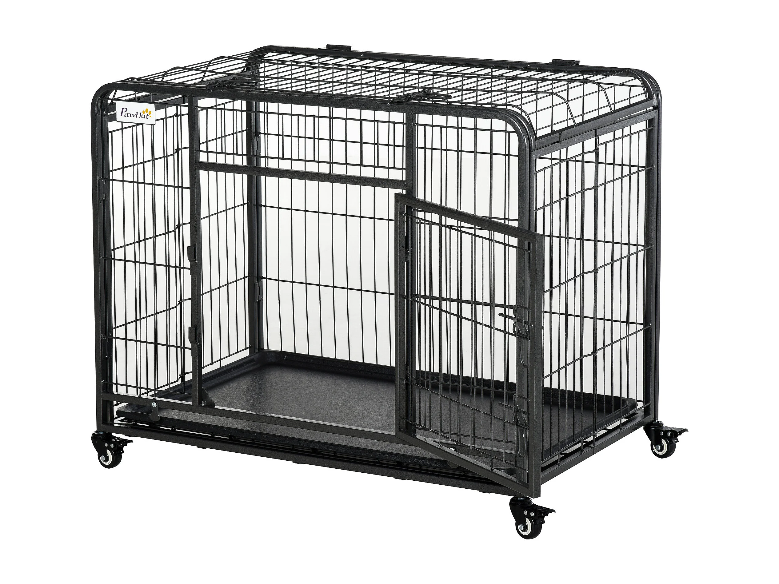 Cage pour chien pliable cage de transport sur roulettes 2 portes verrouillables plateau amovible dim. 94L x 58l x 69H cm métal gris noir