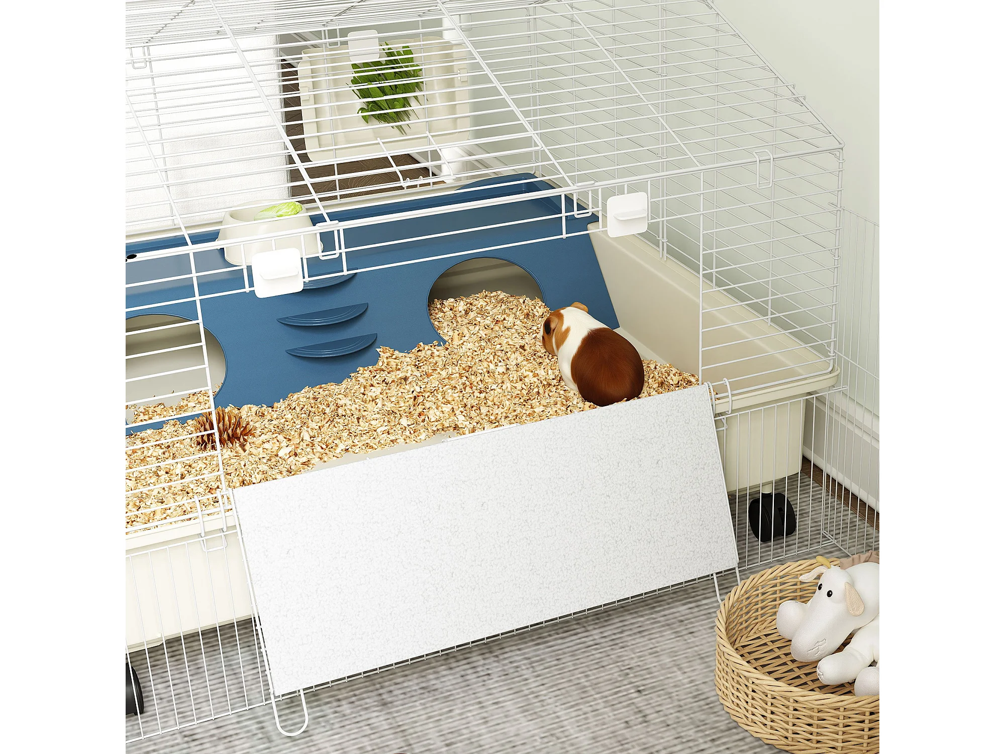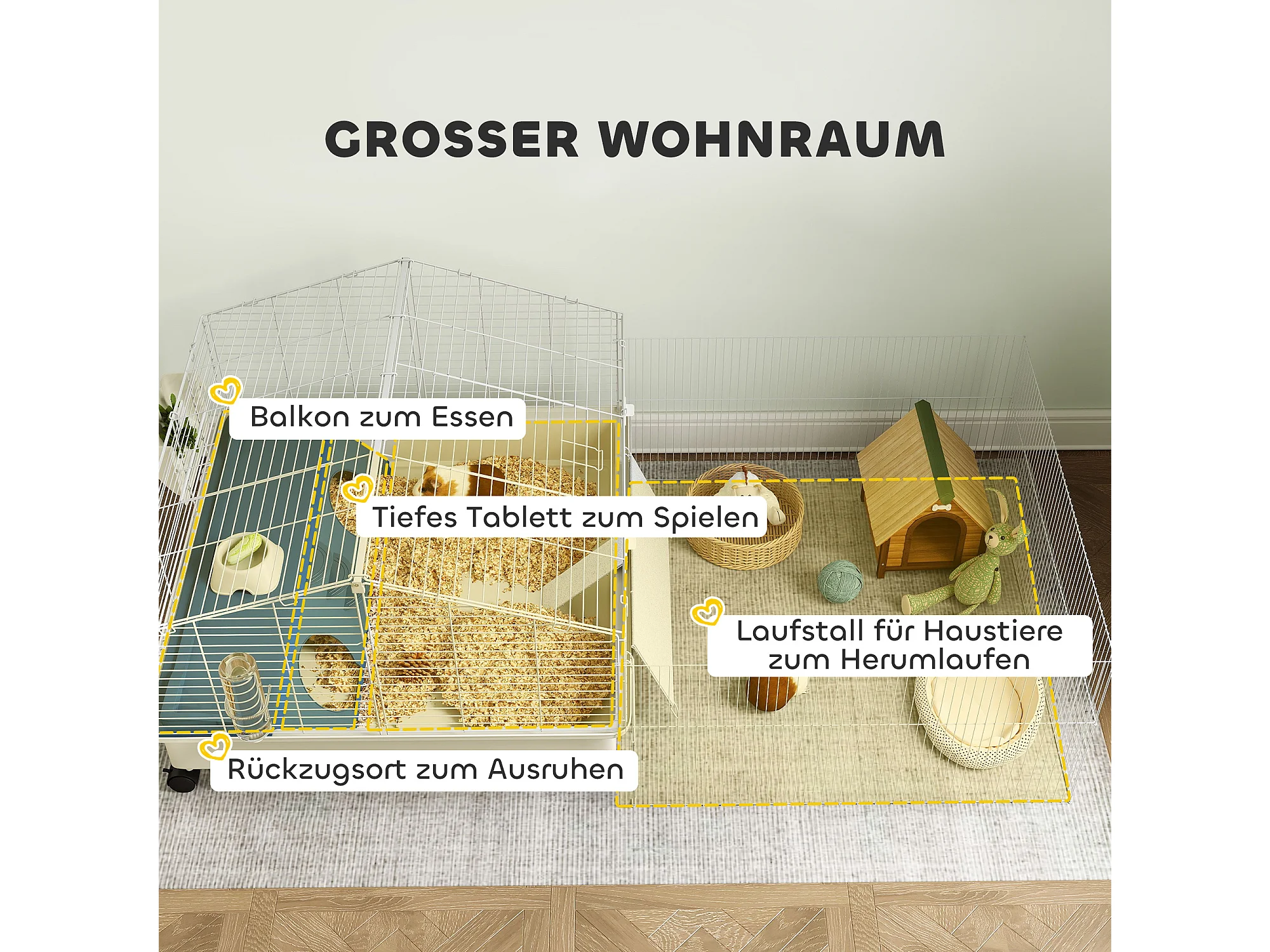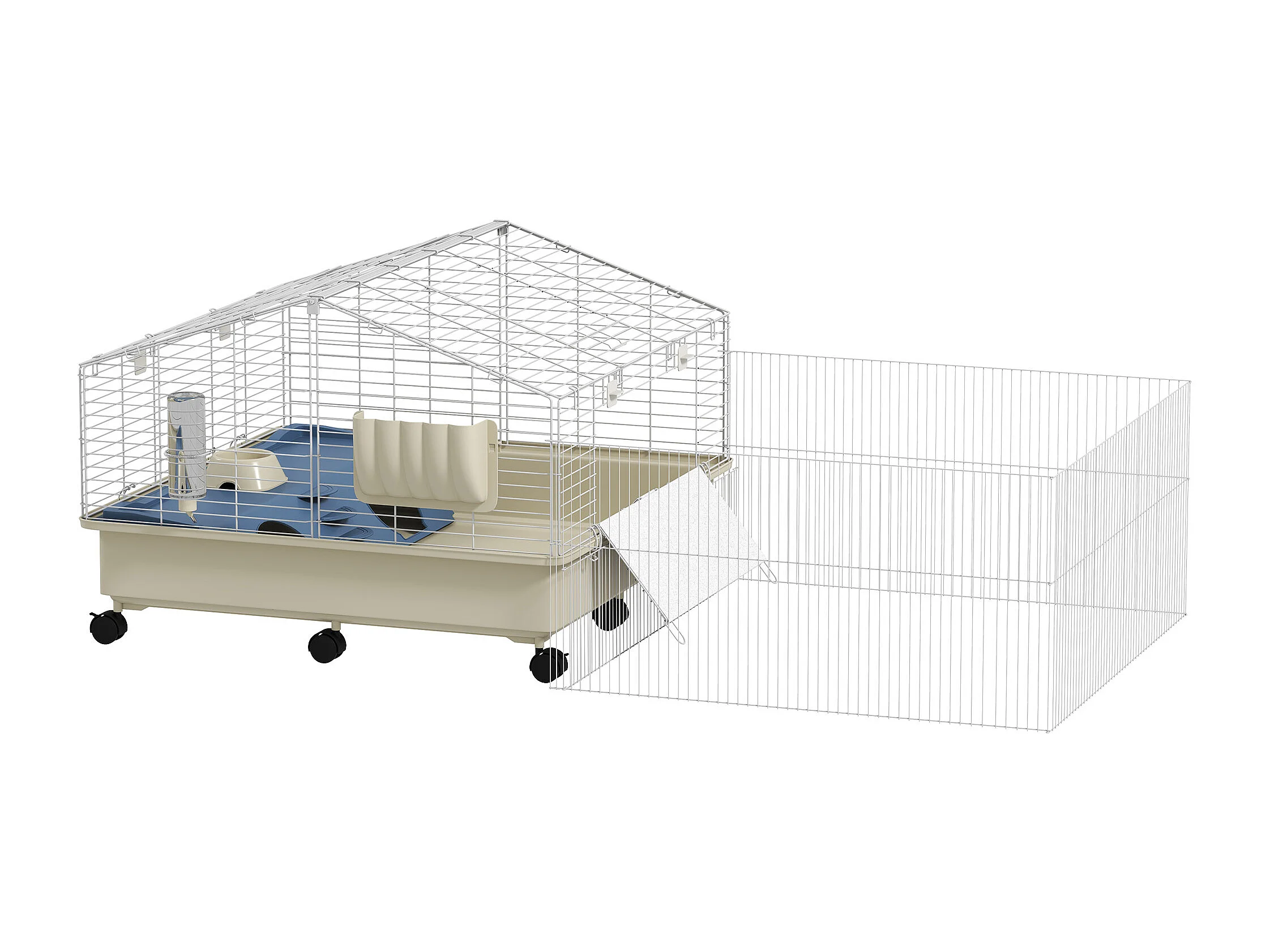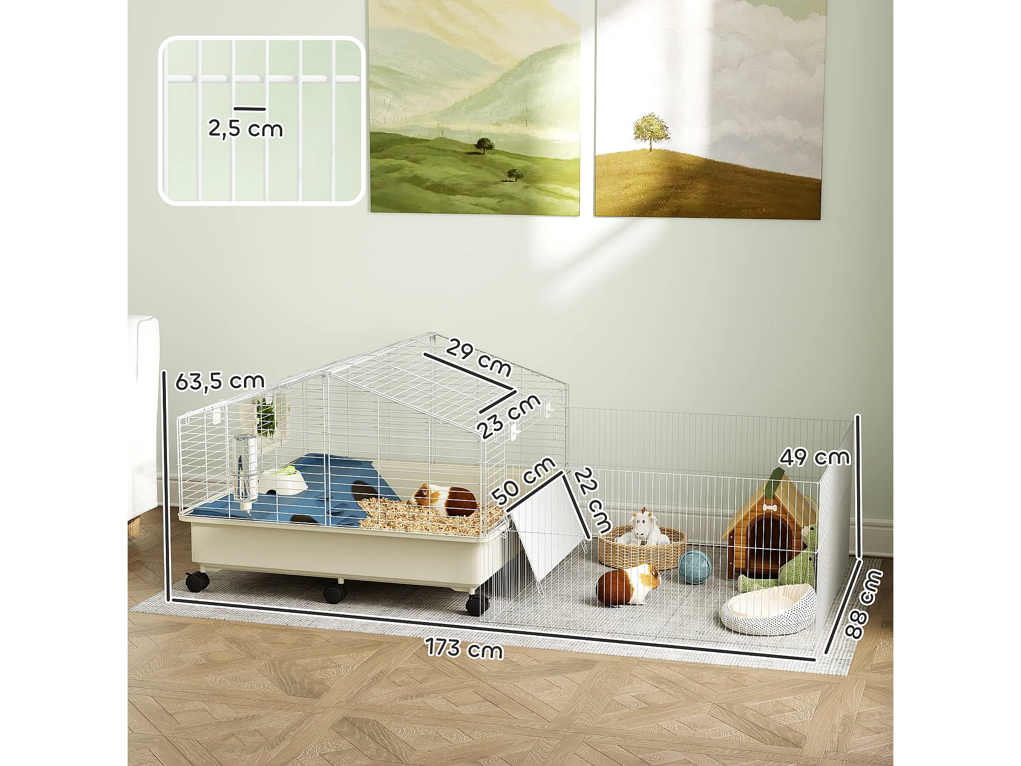 Cage pour petits animaux à deux niveaux avec parc, plastique, multicolore, équipée de rampe, abreuvoir et mangeoire (173x88x63 cm)