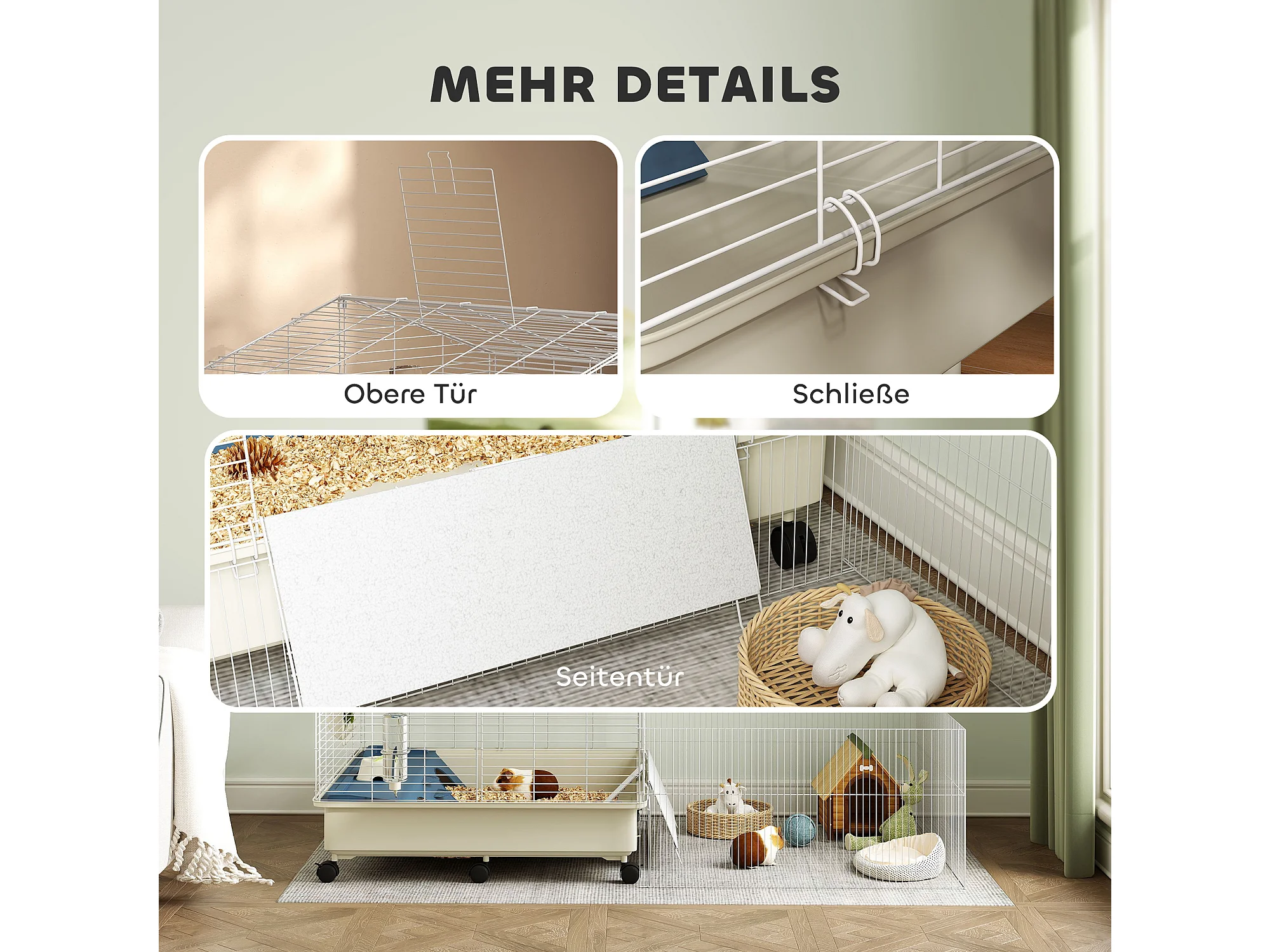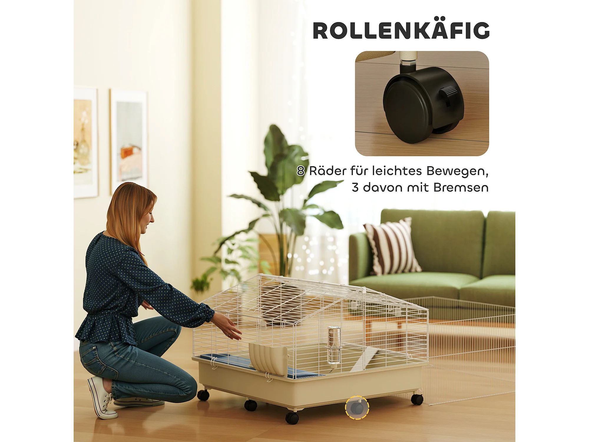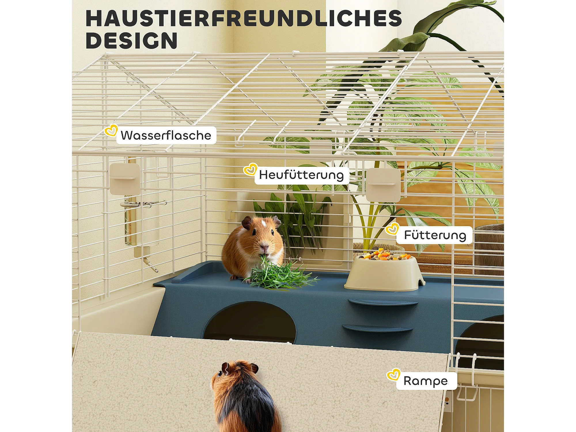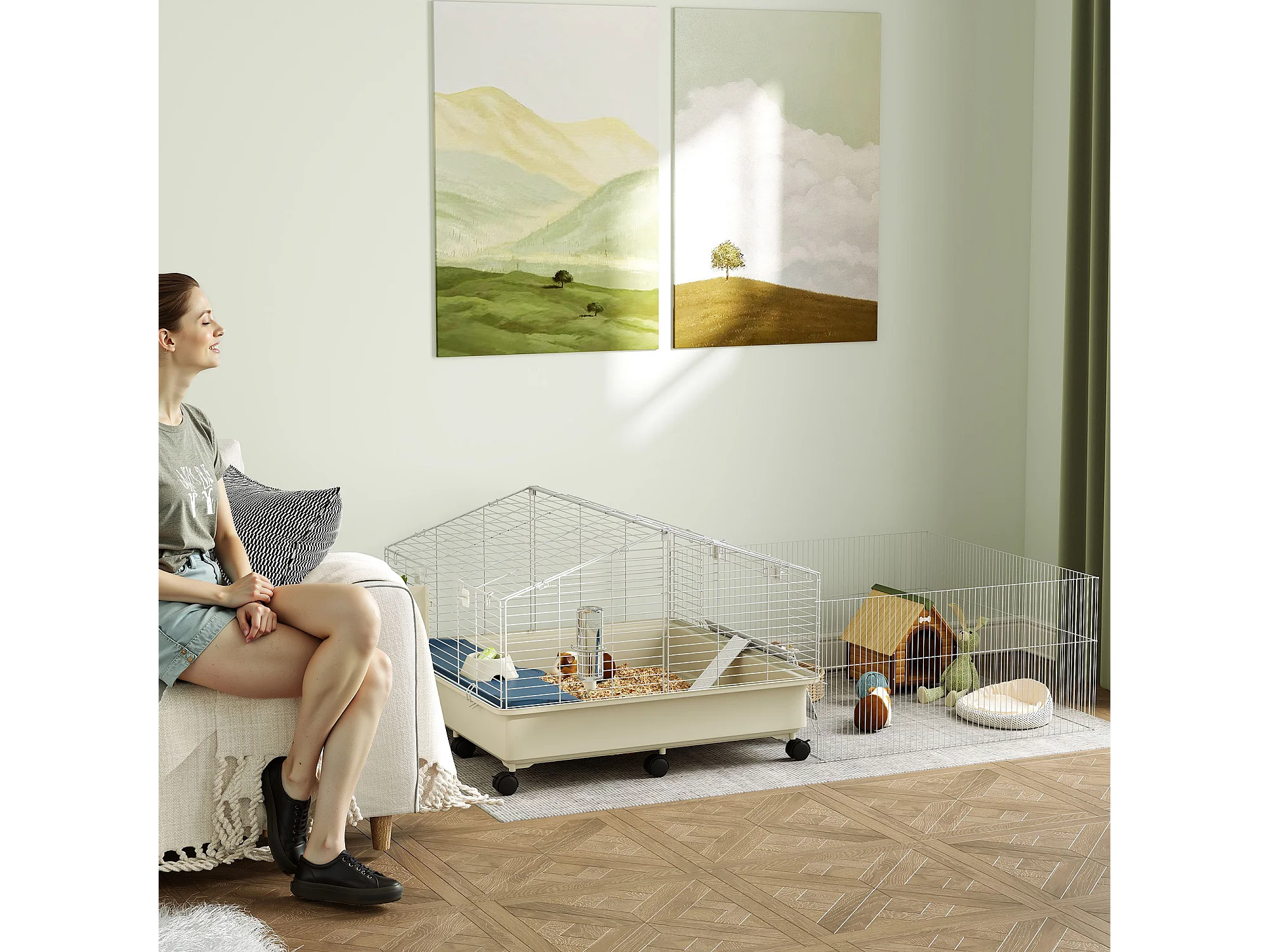 Cage pour petits animaux à deux niveaux avec parc, plastique, multicolore, équipée de rampe, abreuvoir et mangeoire (173x88x63 cm)