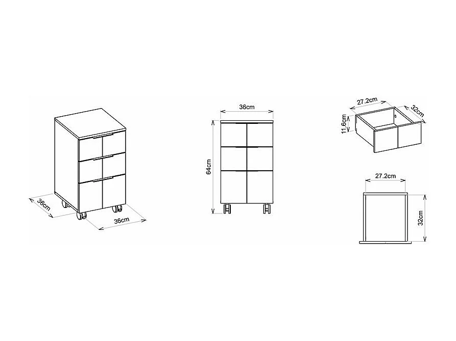 Caisson Roulant 3 Tiroirs Gris Mat 4 Roulettes L 36 H 64 P 36 cm