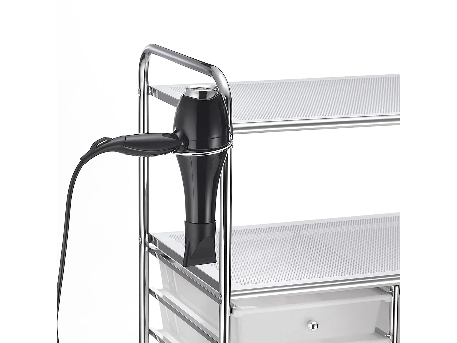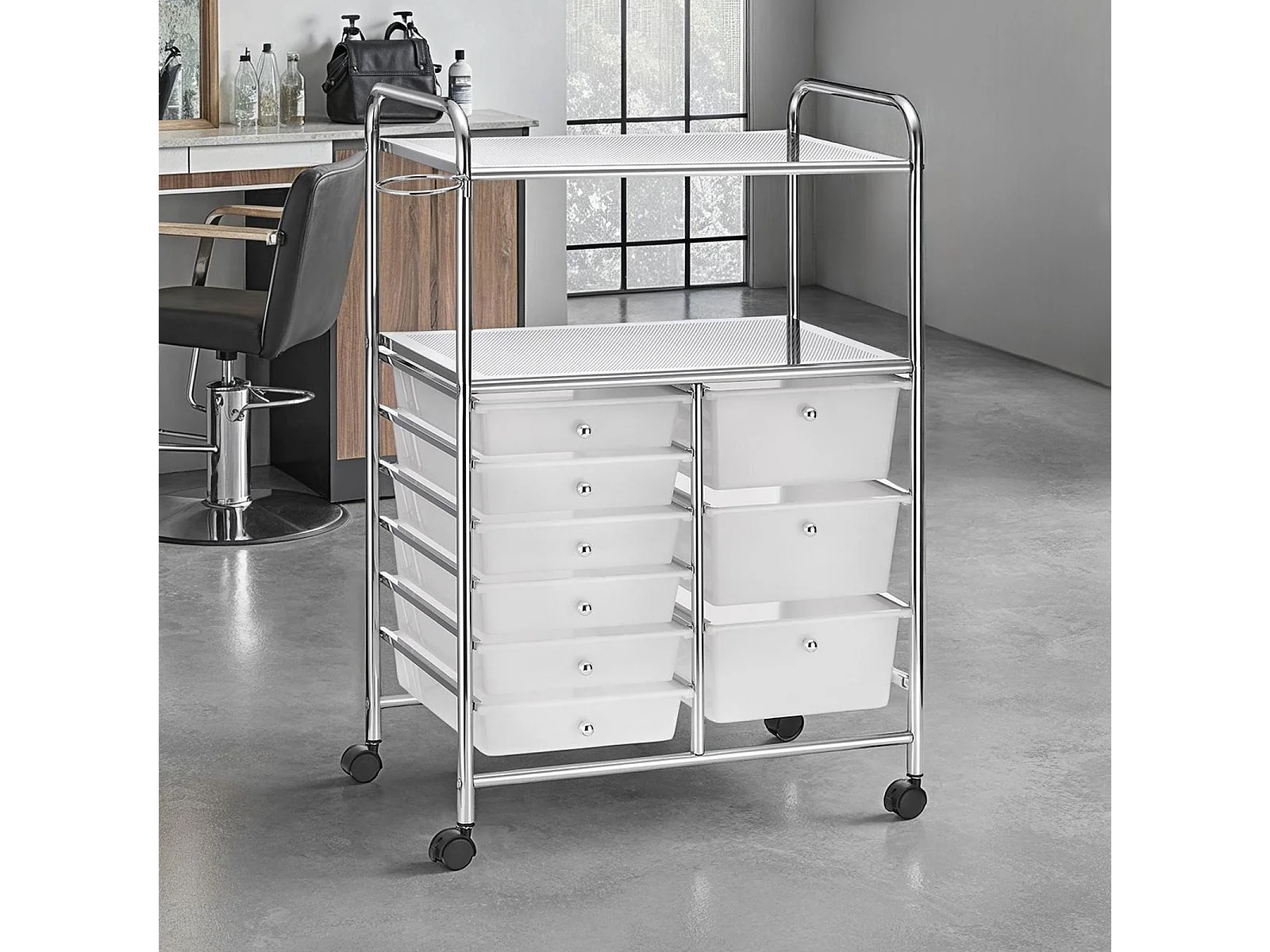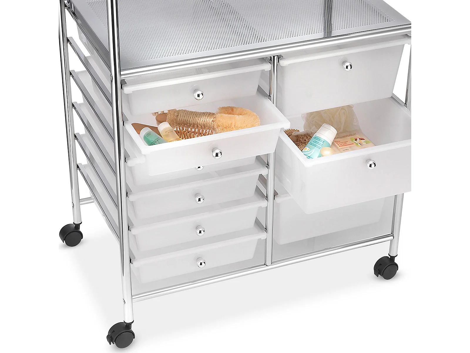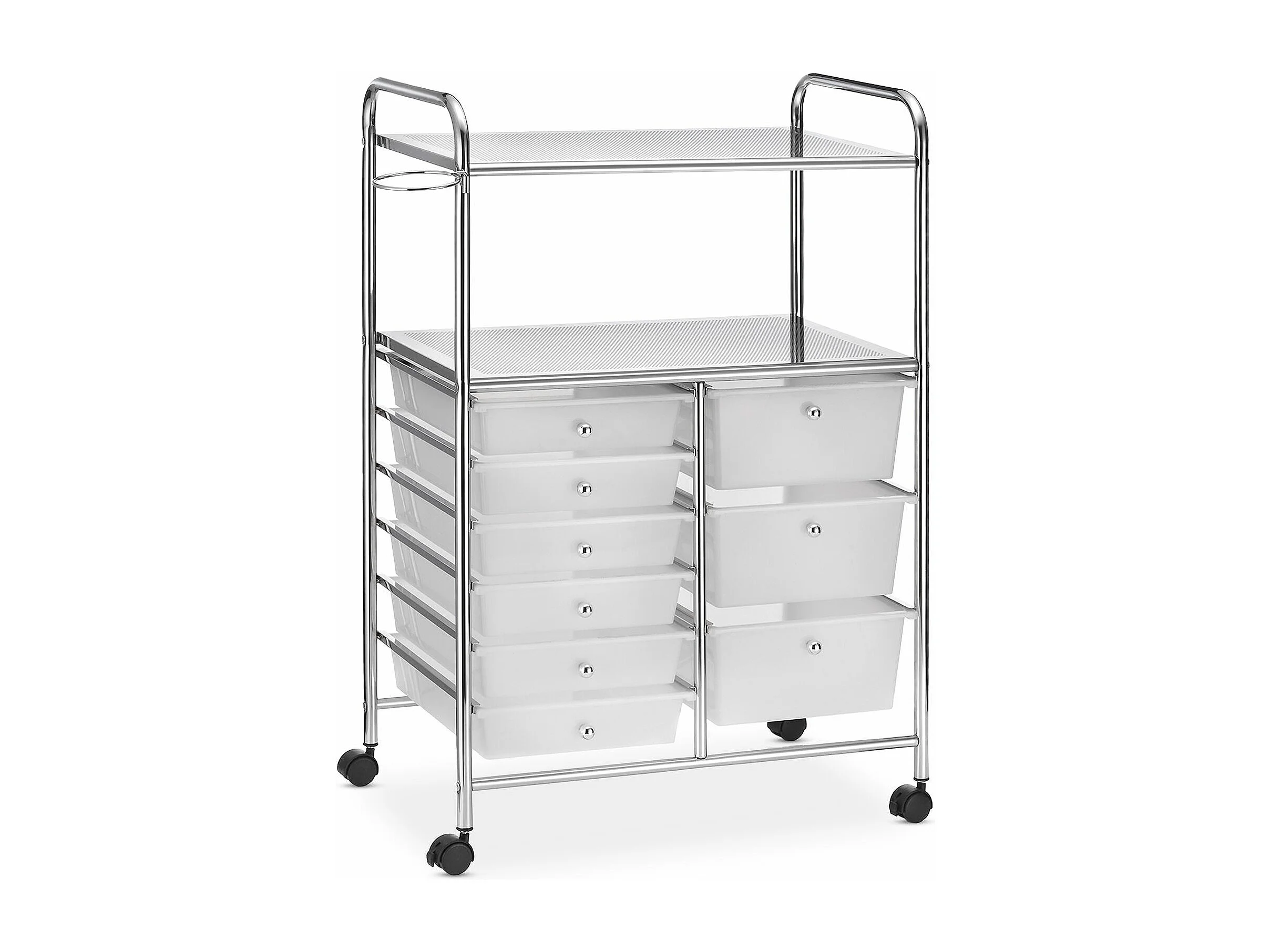 Caisson sur roulettes MARITA chariot 9 tiroirs en plastique blanc transparent et 2 étagères, rangement salle de bain en métal chromé