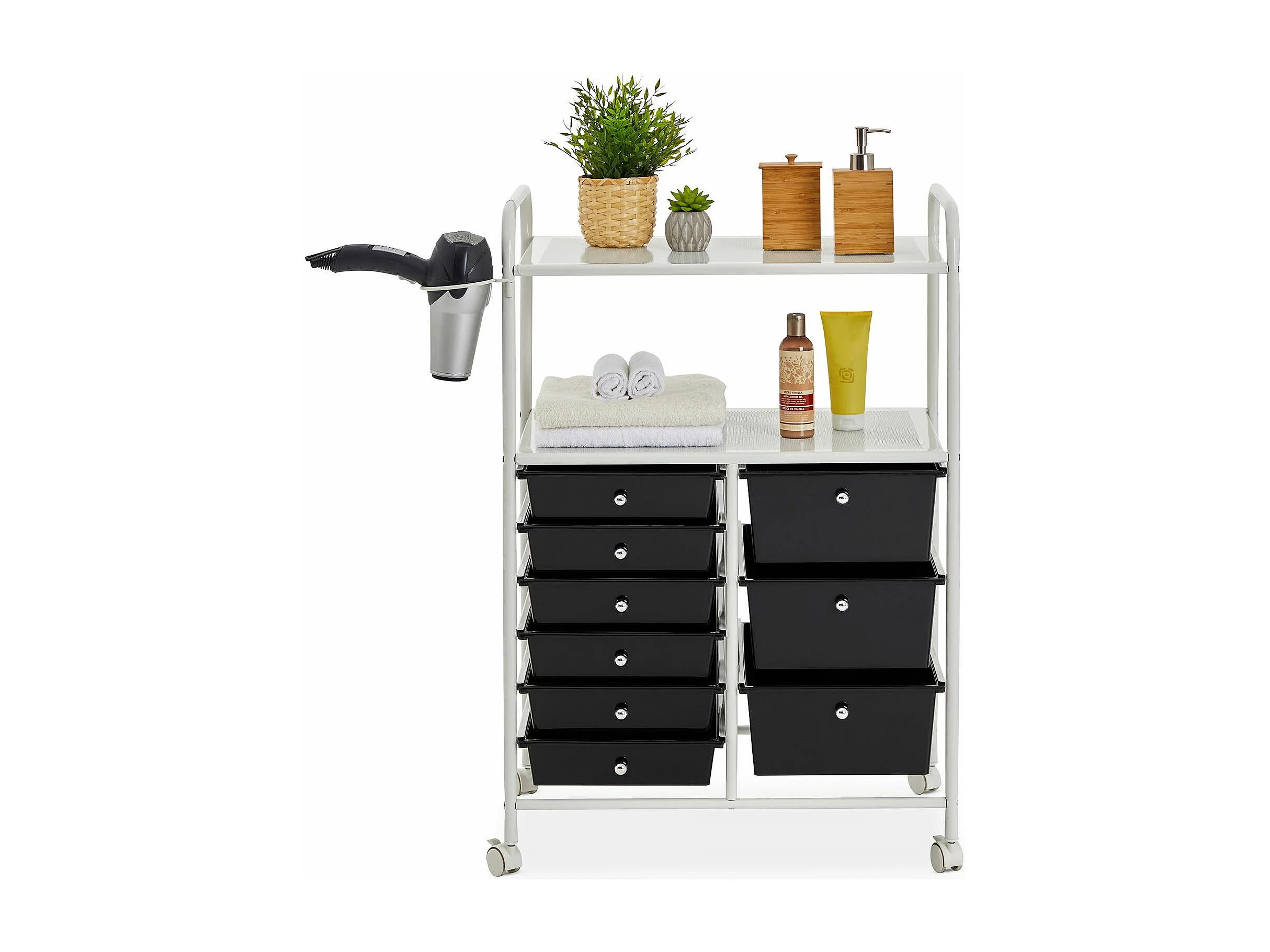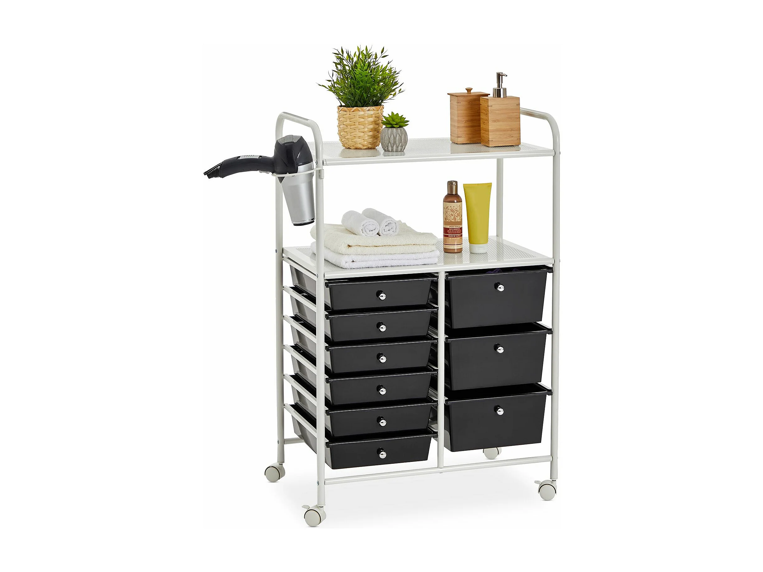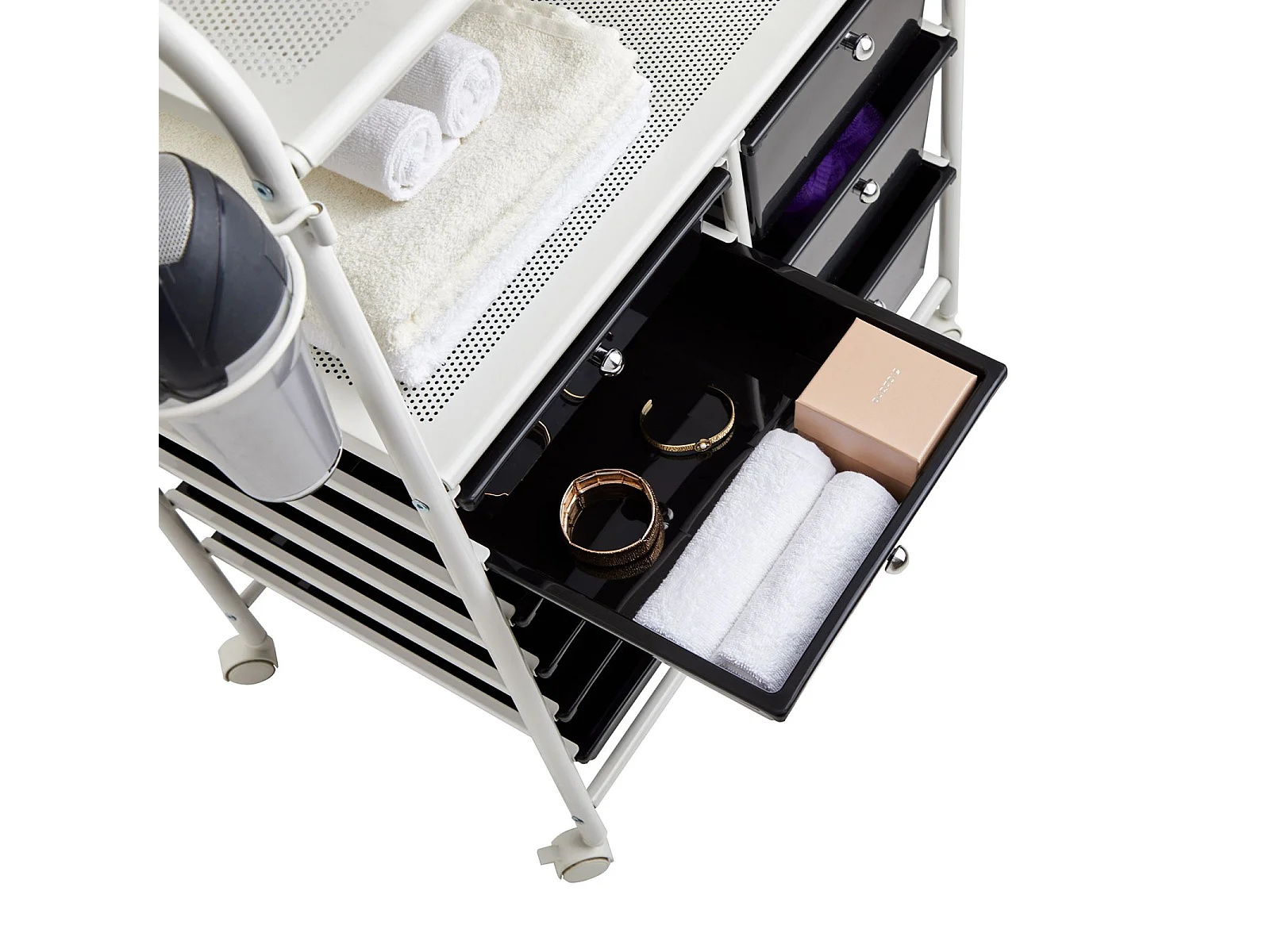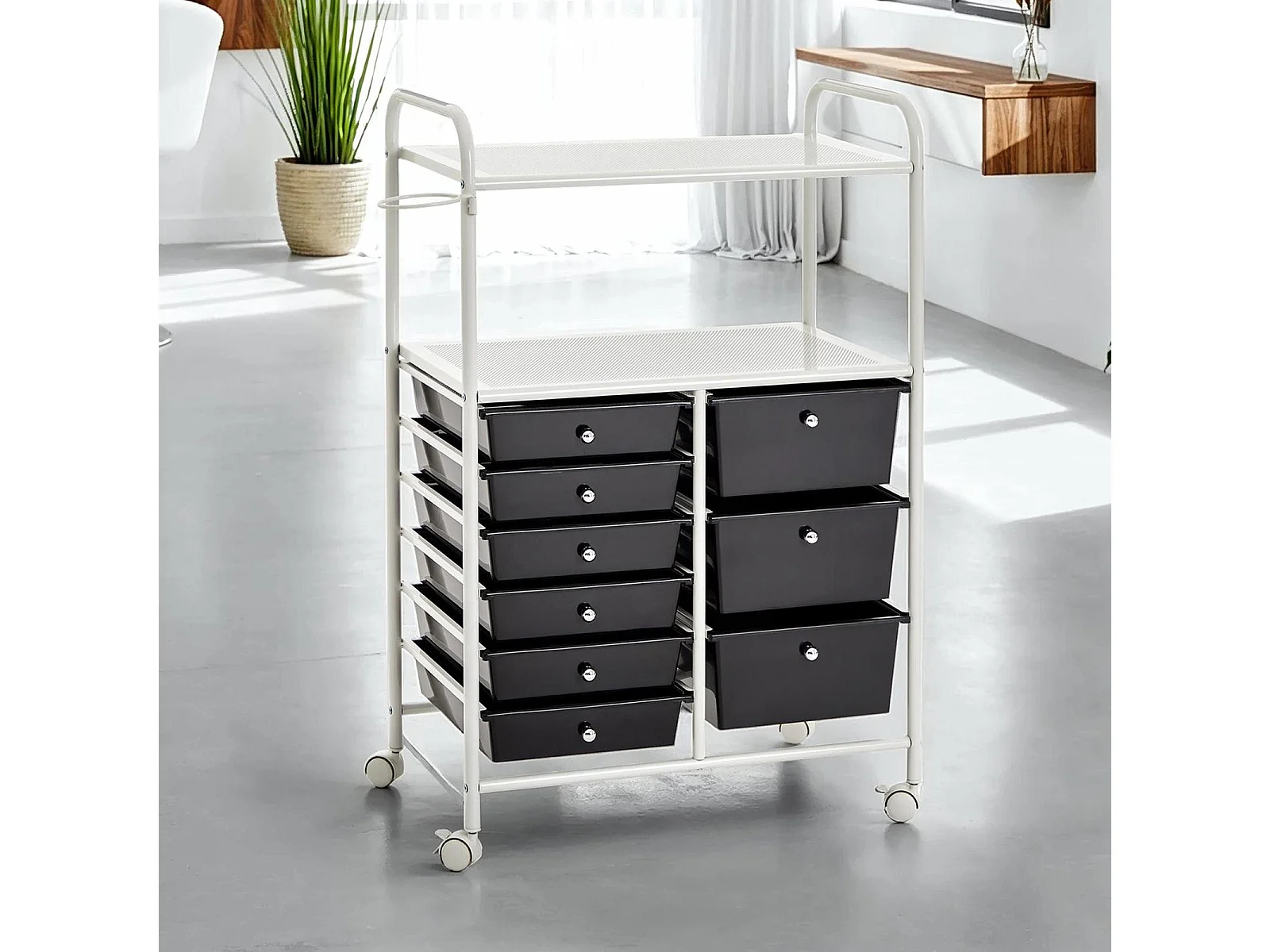 Caisson sur roulettes MARITA chariot 9 tiroirs en plastique noir et 2 étagères, rangement salle de bain en métal blanc