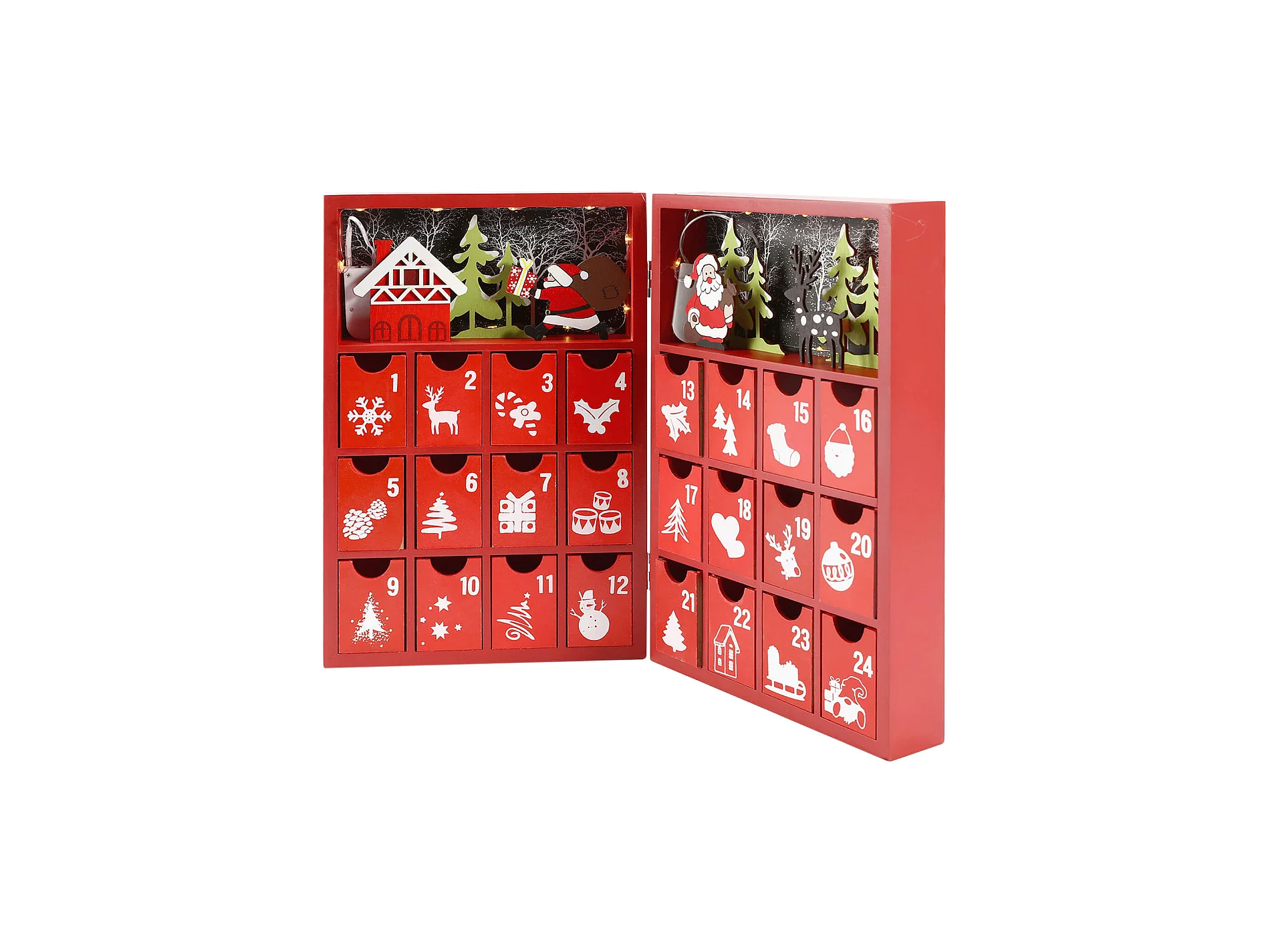 Calendrier de l'Avent LED en bois - 24 tiroirs à remplir - villages, montagnes, forêts, rennes, étoiles - rouge