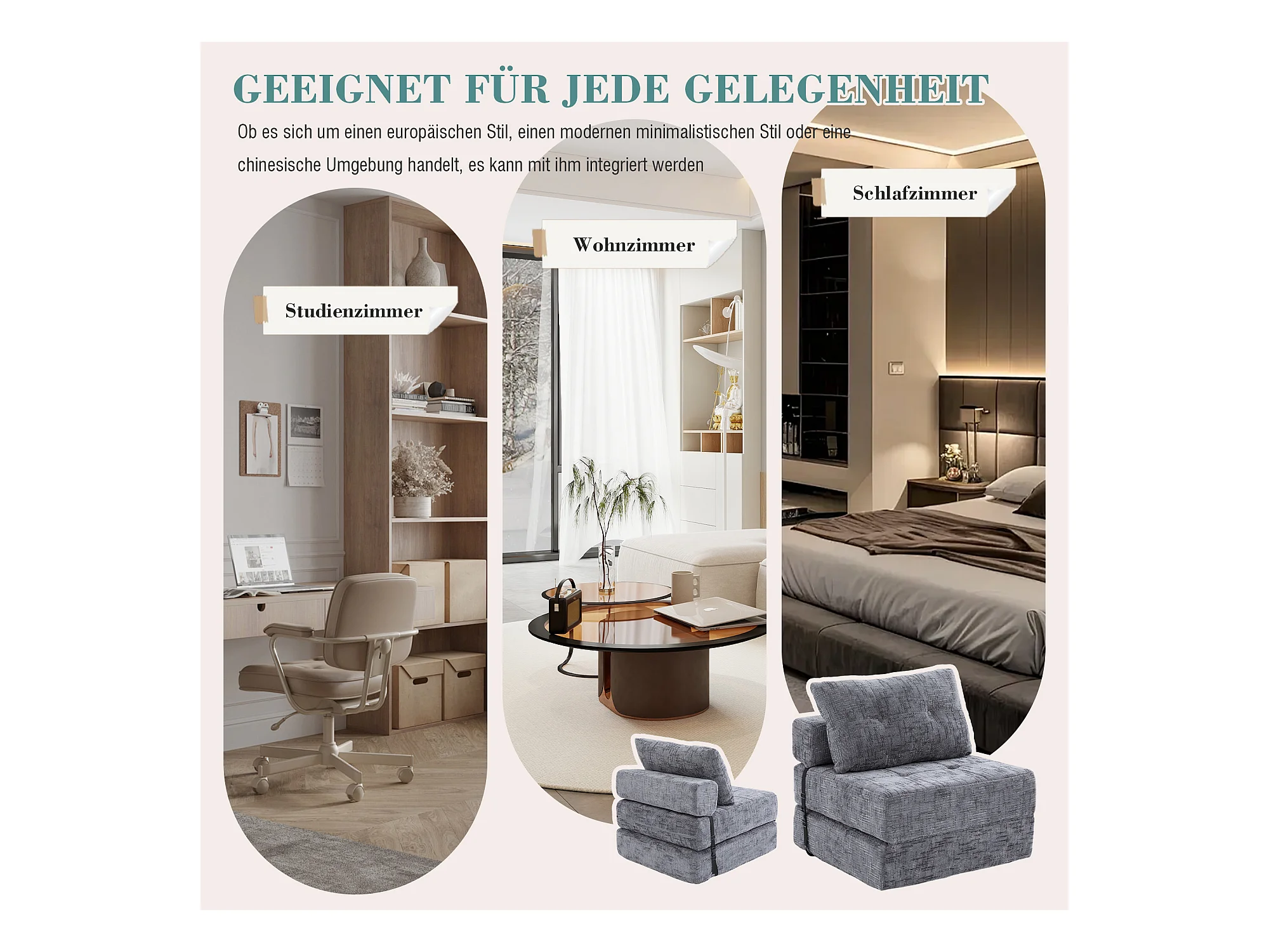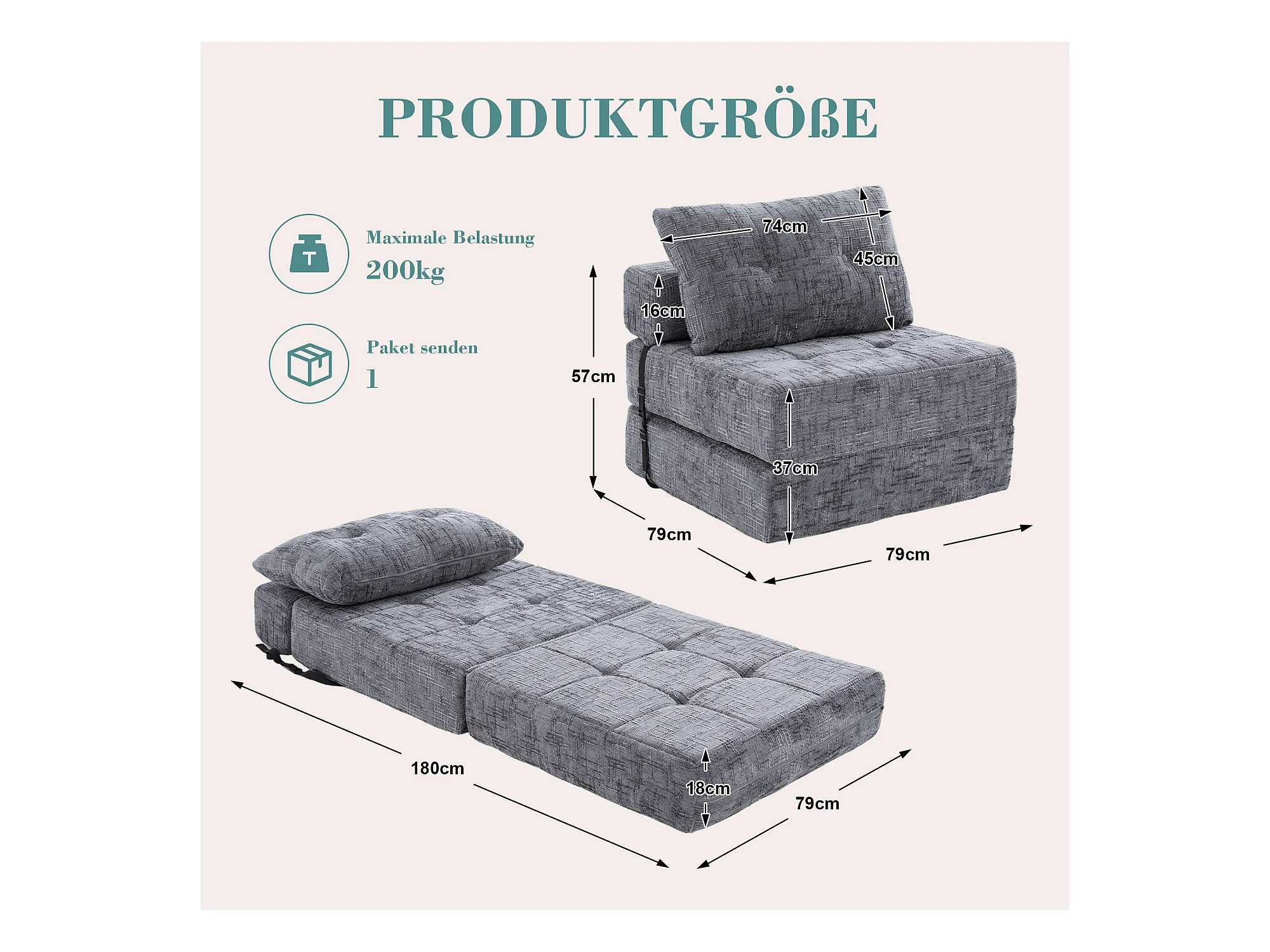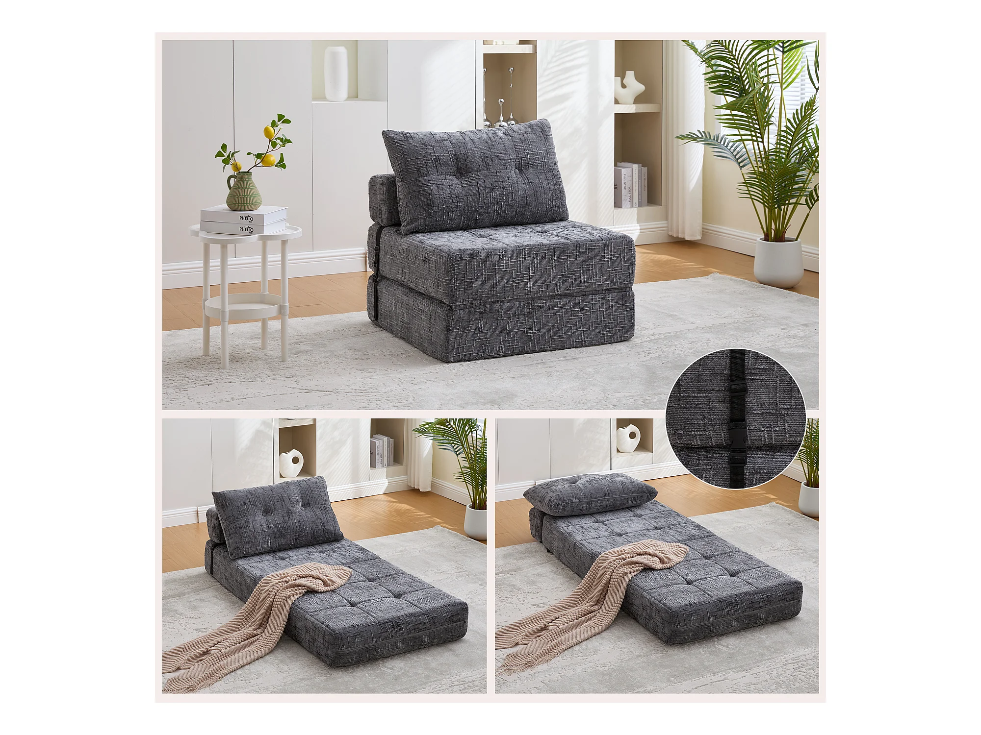 Canapé 1 place convertible en tissu chenille gris - Canapé lit 2 en 1 - Assise haute résilience - pour salon, studio ou chambre d’amis