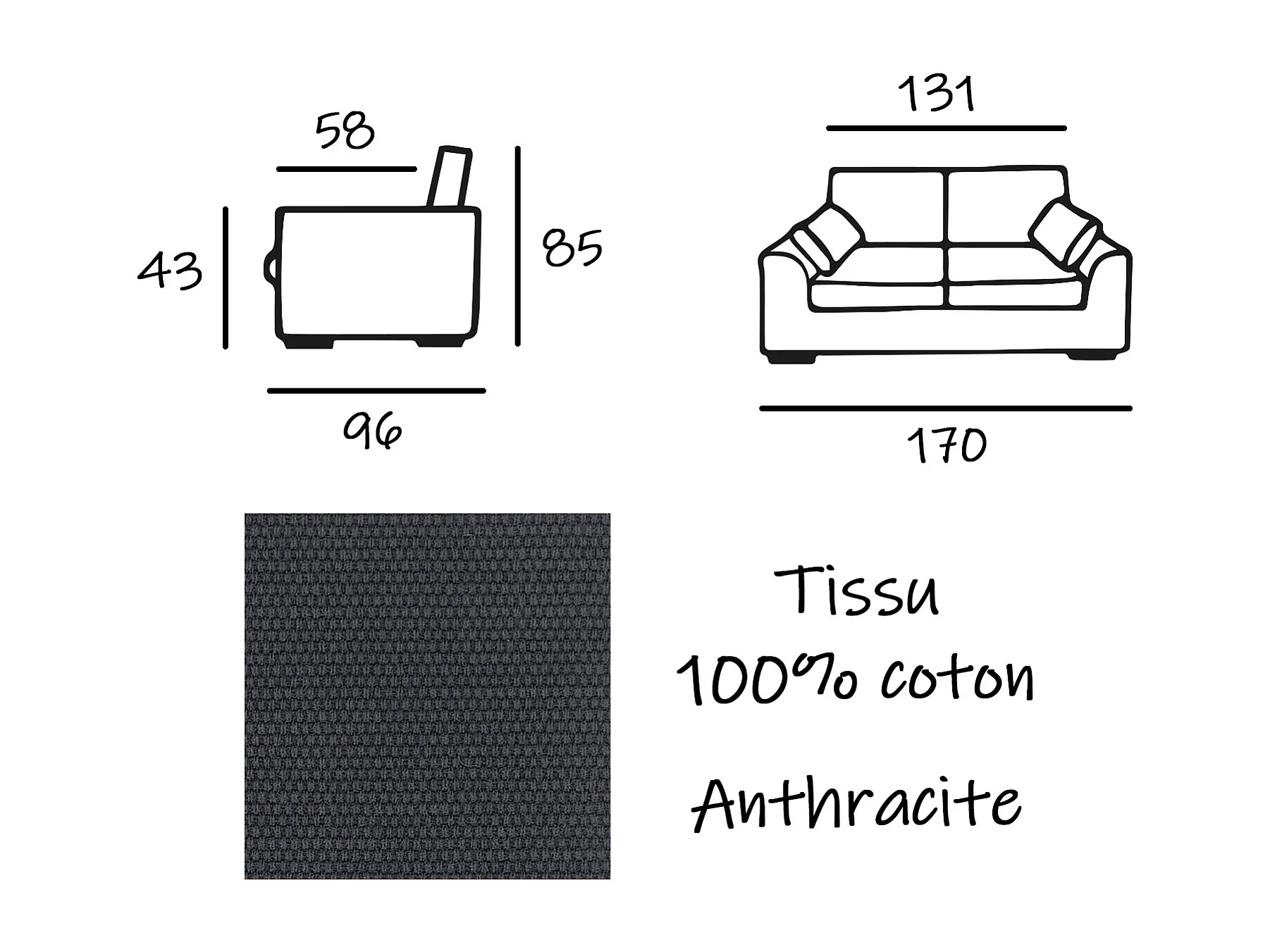 Canapé 2 pl TRESSIN 170 cm fixe tissu coton Anthracite - 100% déhoussable - Fab. France