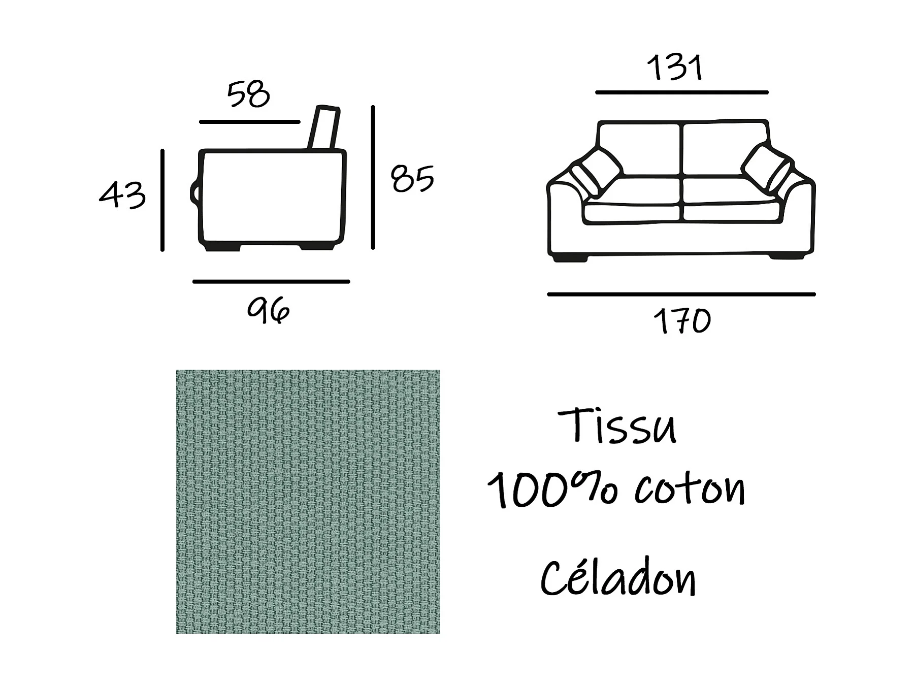 Canapé 2 pl TRESSIN 170 cm fixe tissu coton Céladon - 100% déhoussable - Fab. France