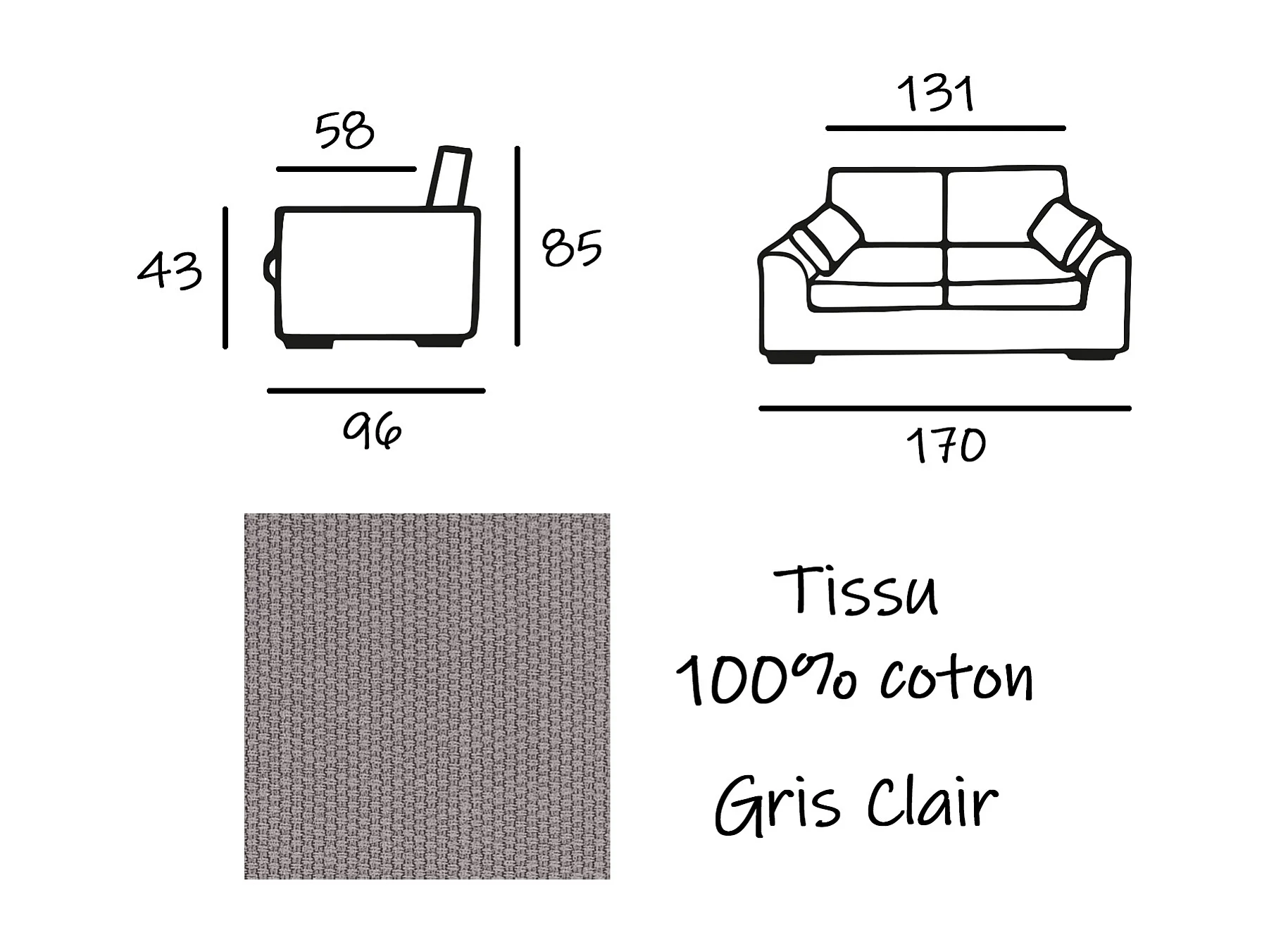 Canapé 2 pl TRESSIN 170 cm fixe tissu coton Gris Clair - 100% déhoussable - Fab. France