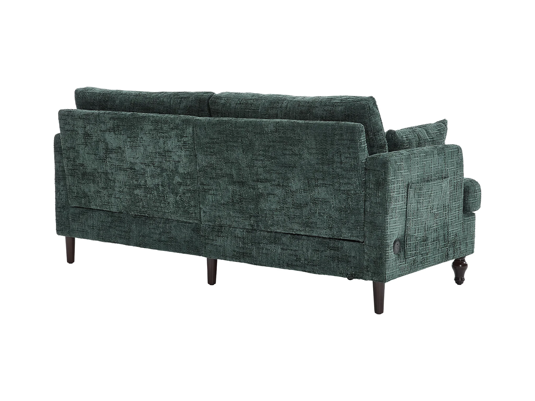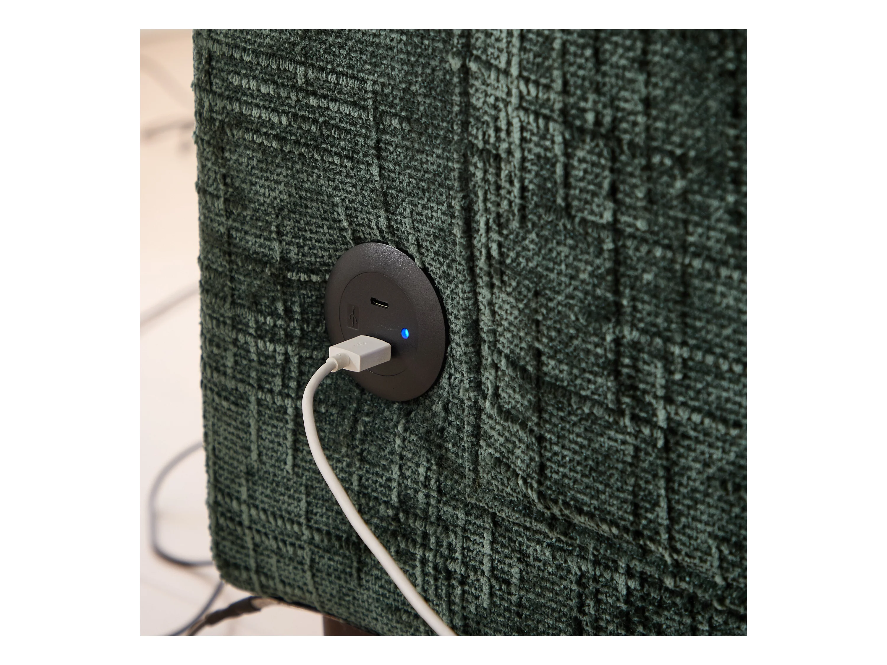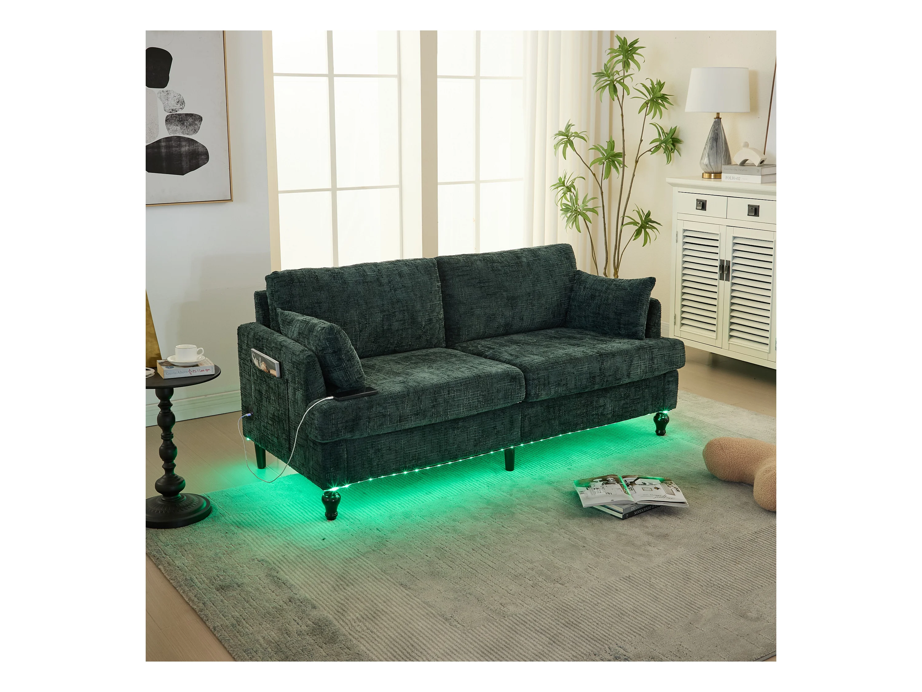 Canapé 2 places avec éclairage LED et port USB, pieds en bois - tissu chenille vert foncé