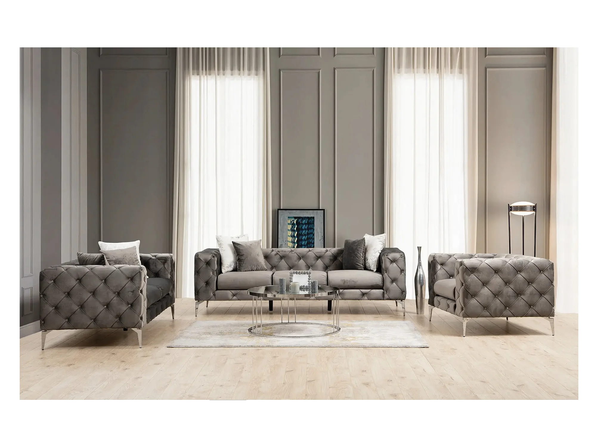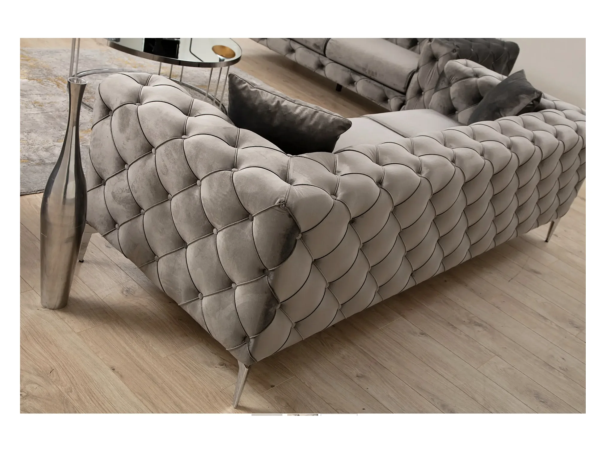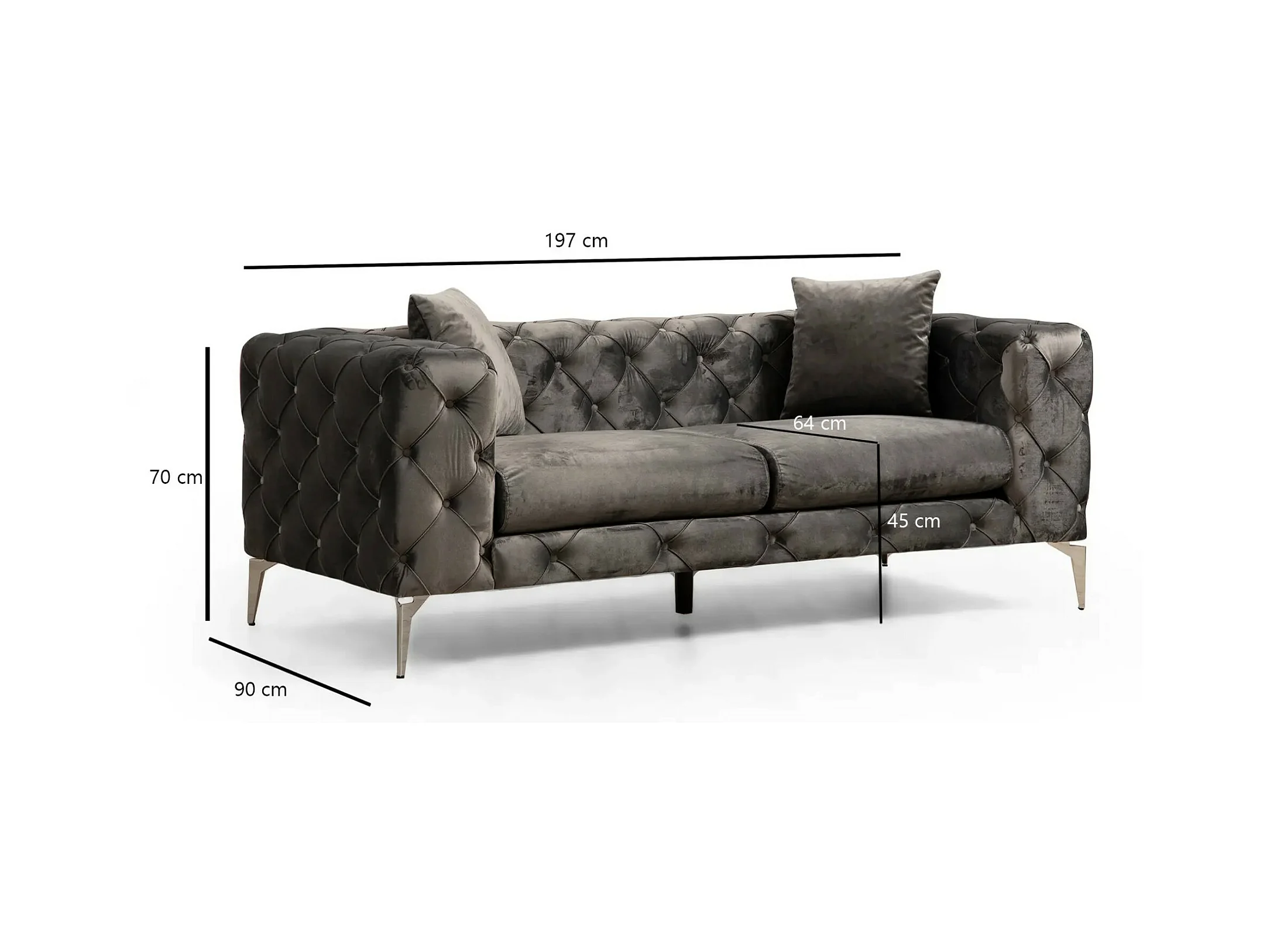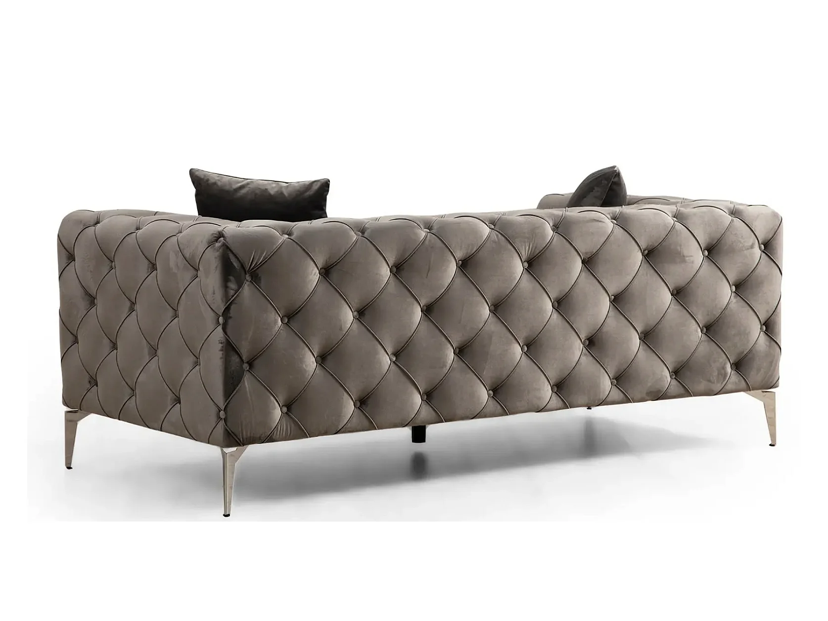 Canapé 2 places capitonné velours gris foncé et pieds chromés Herakles 197cm