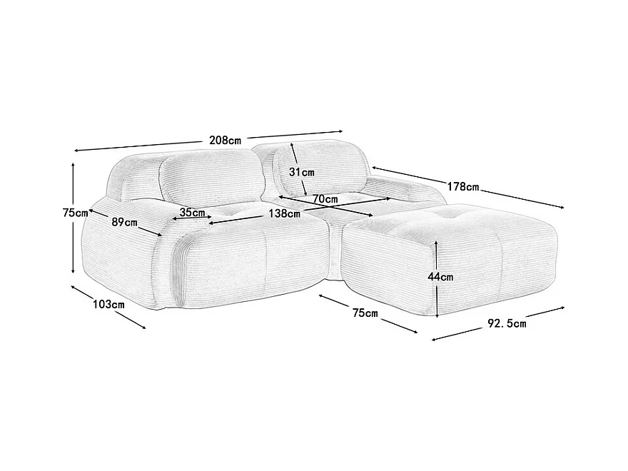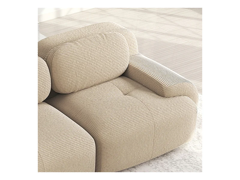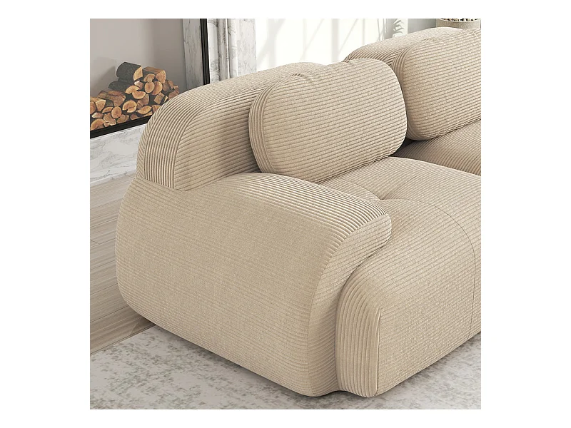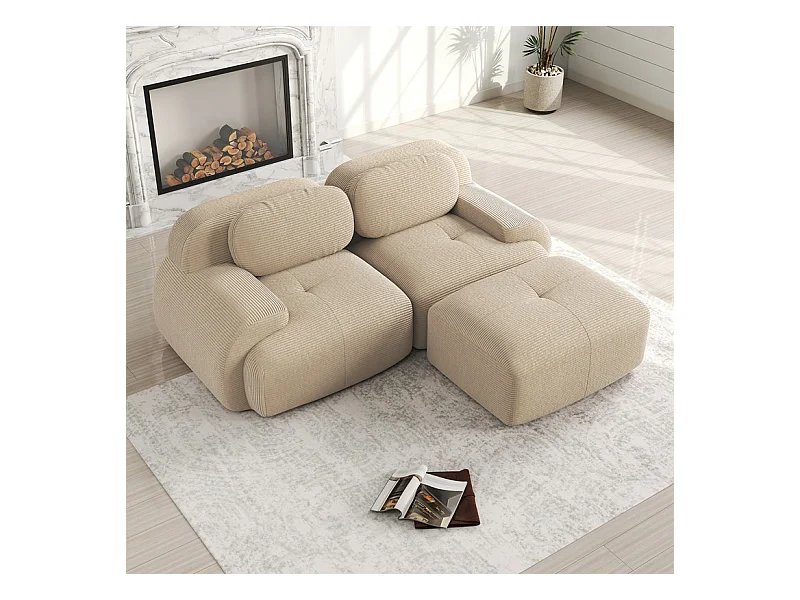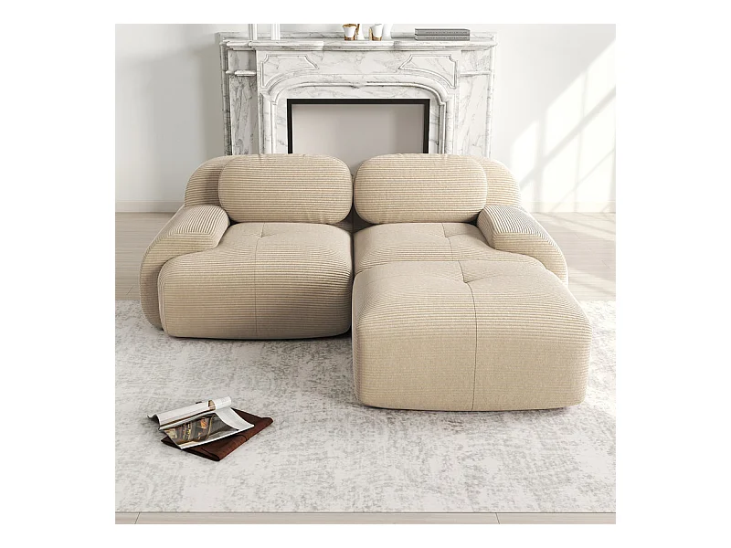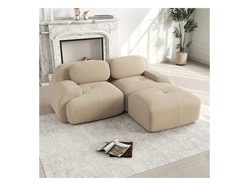 Canapé 2 places d'angle modulable - en Velours côtelé - avec 2 oreillers et pouf - ergonomique- 208x178x75cm - Beige