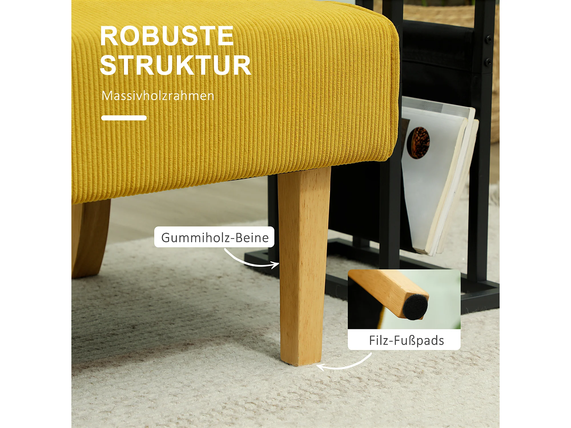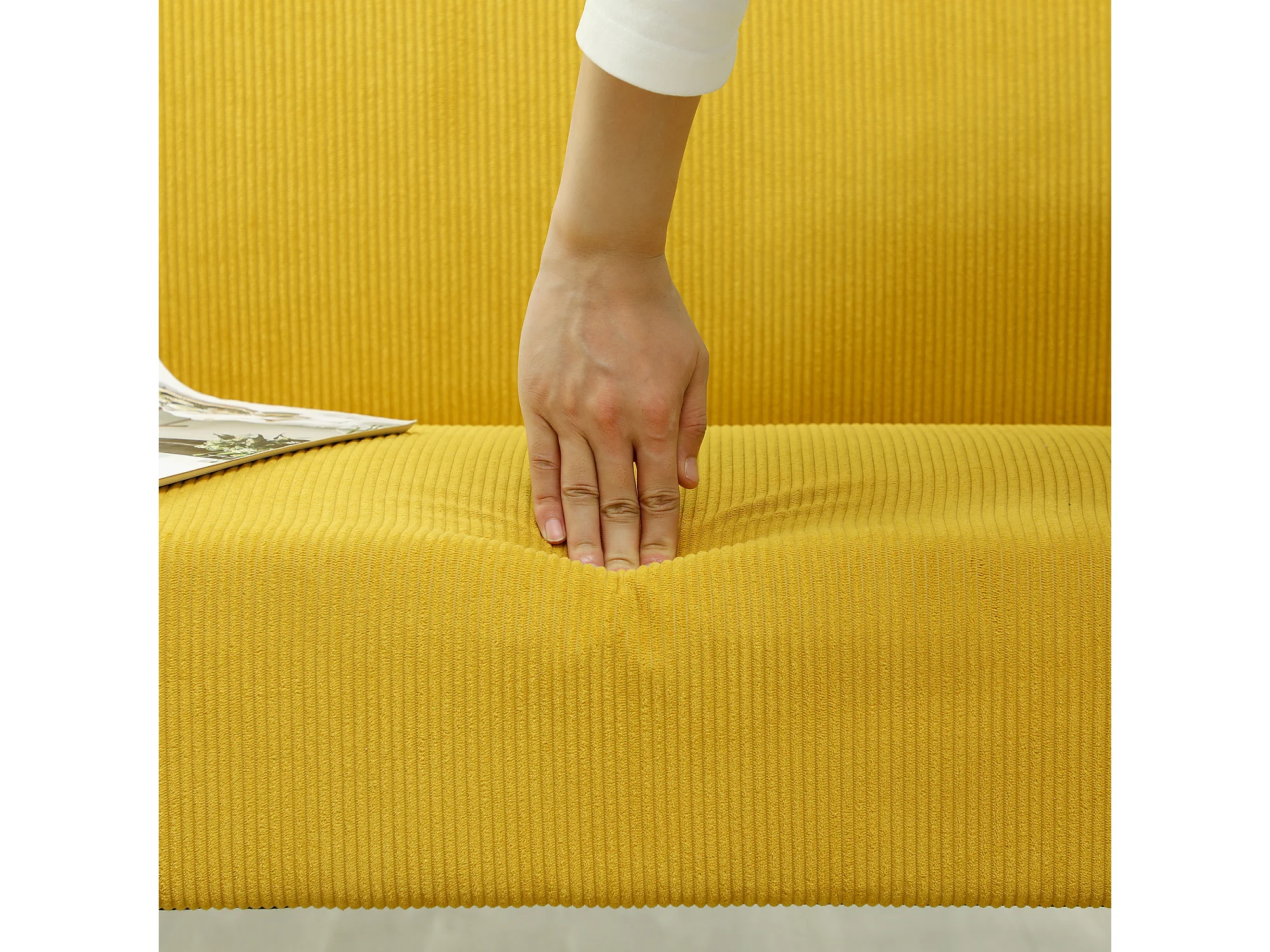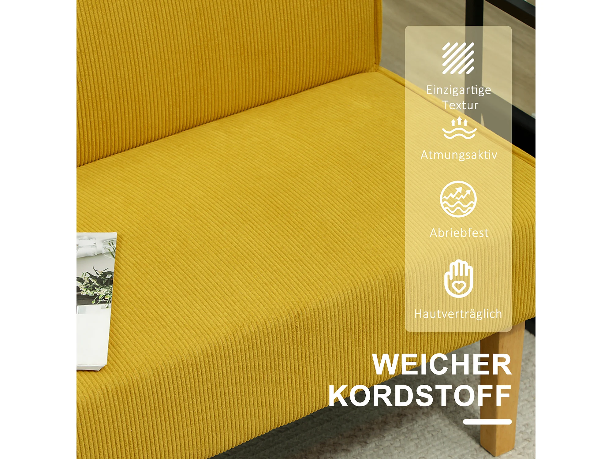 Canapé 2 places en velours côtelé, structure bois, jaune (110x62x85cm)