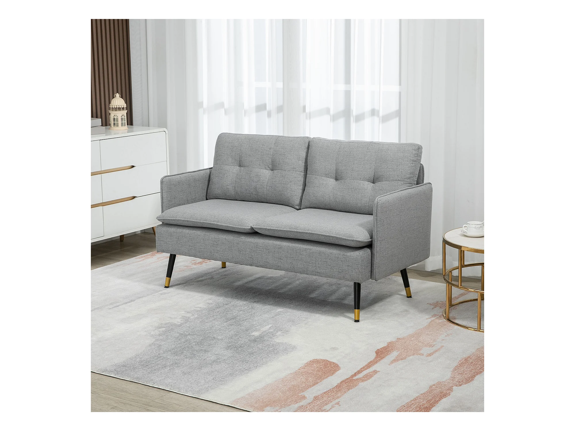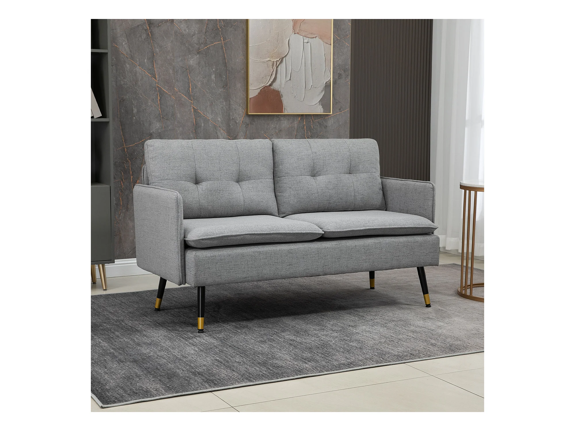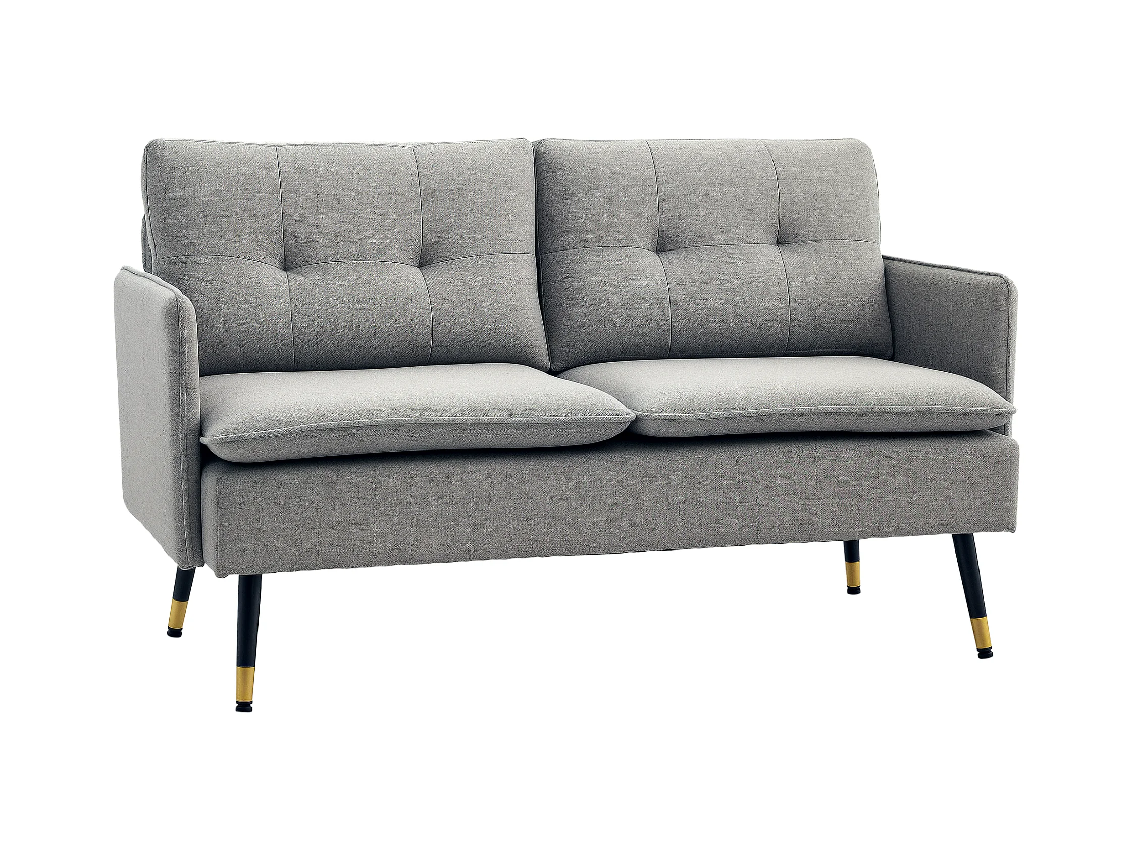 Canapé 2 places style art-déco dossier effet capitonné piètement incliné effilé métal noir extrémités dorées tissu gris