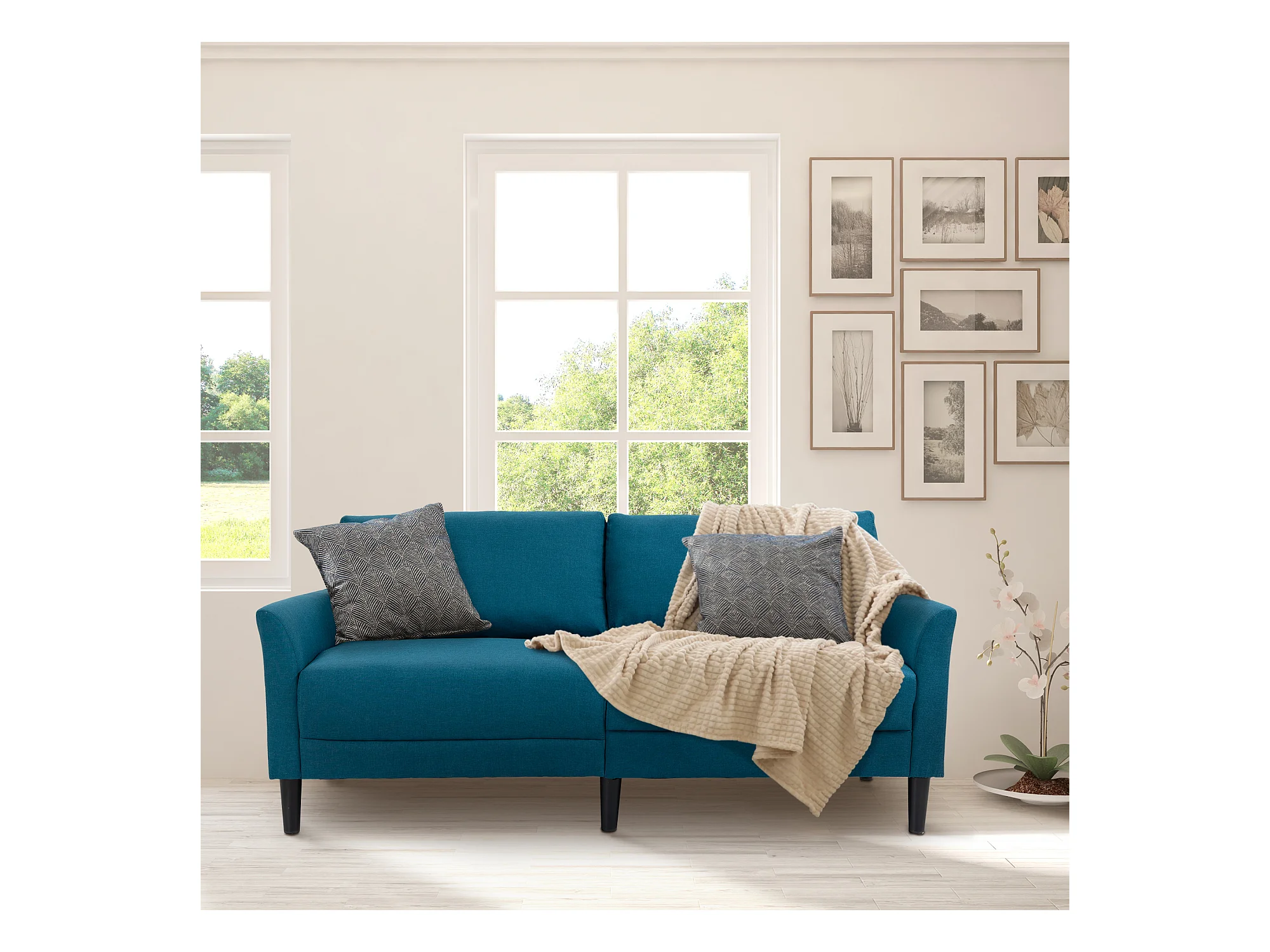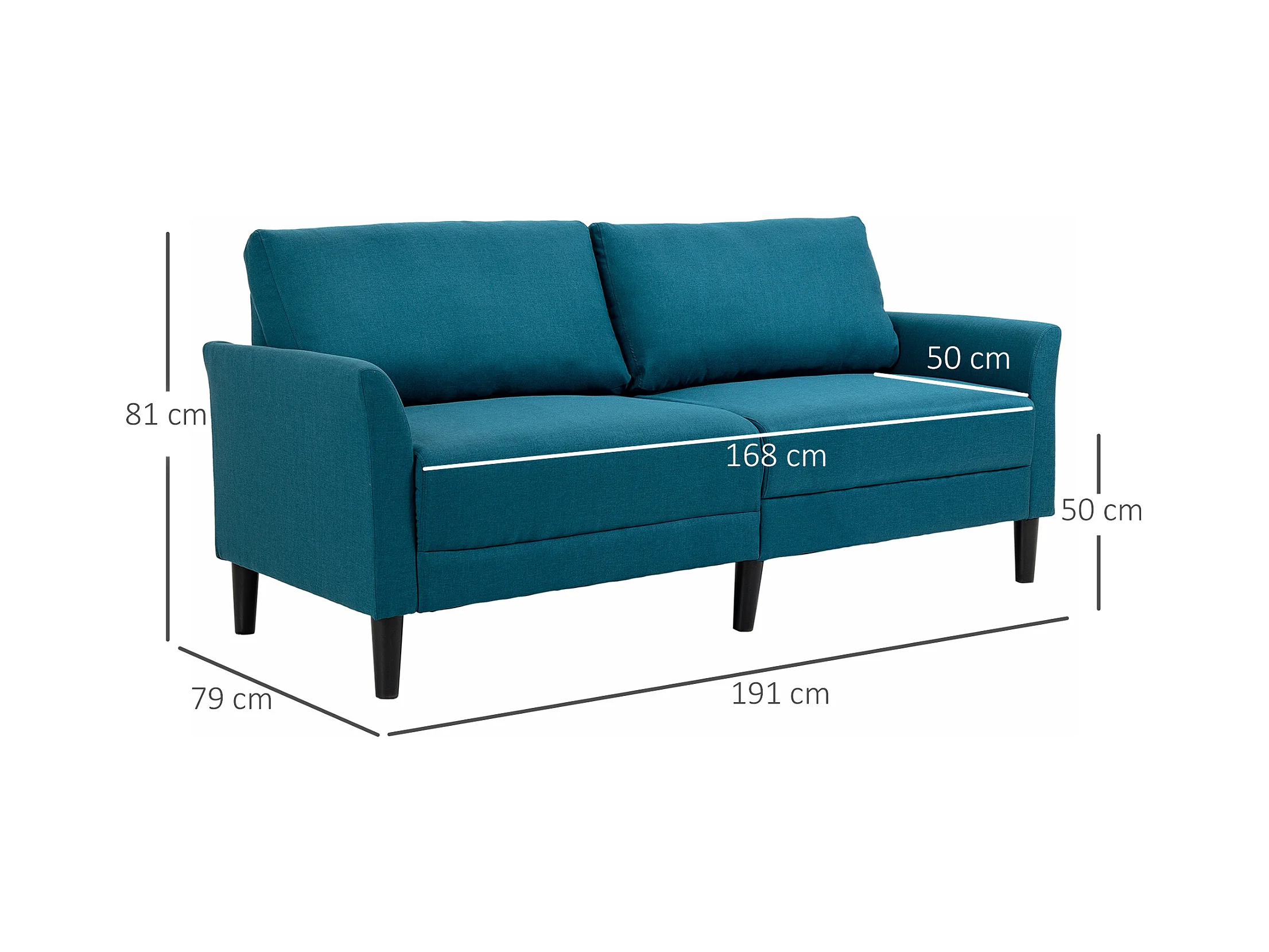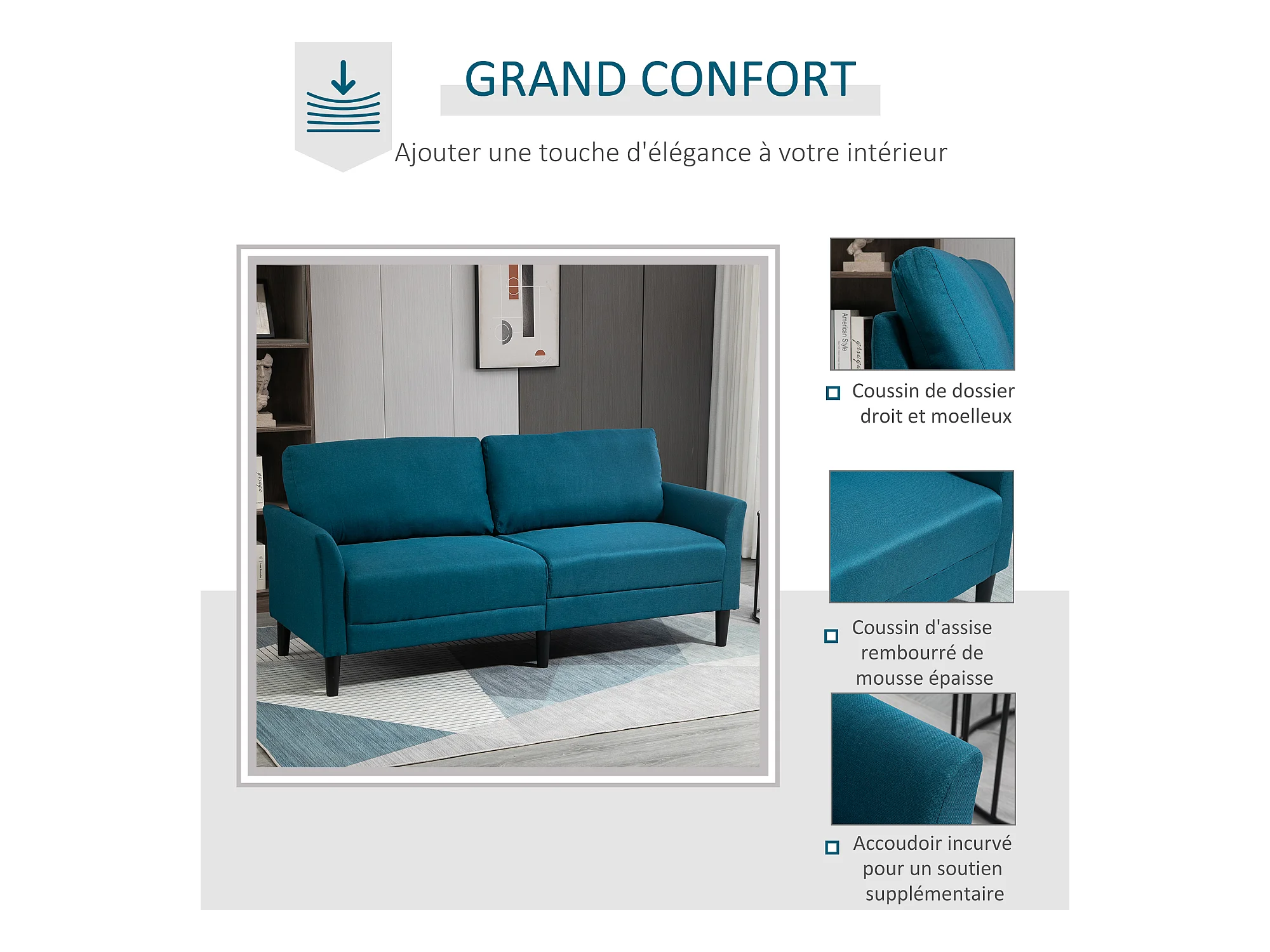 Canapé 2 places style contemporain assises larges profondes accoudoirs courbés piètement effilé bois hévéa noir polyester bleu canard