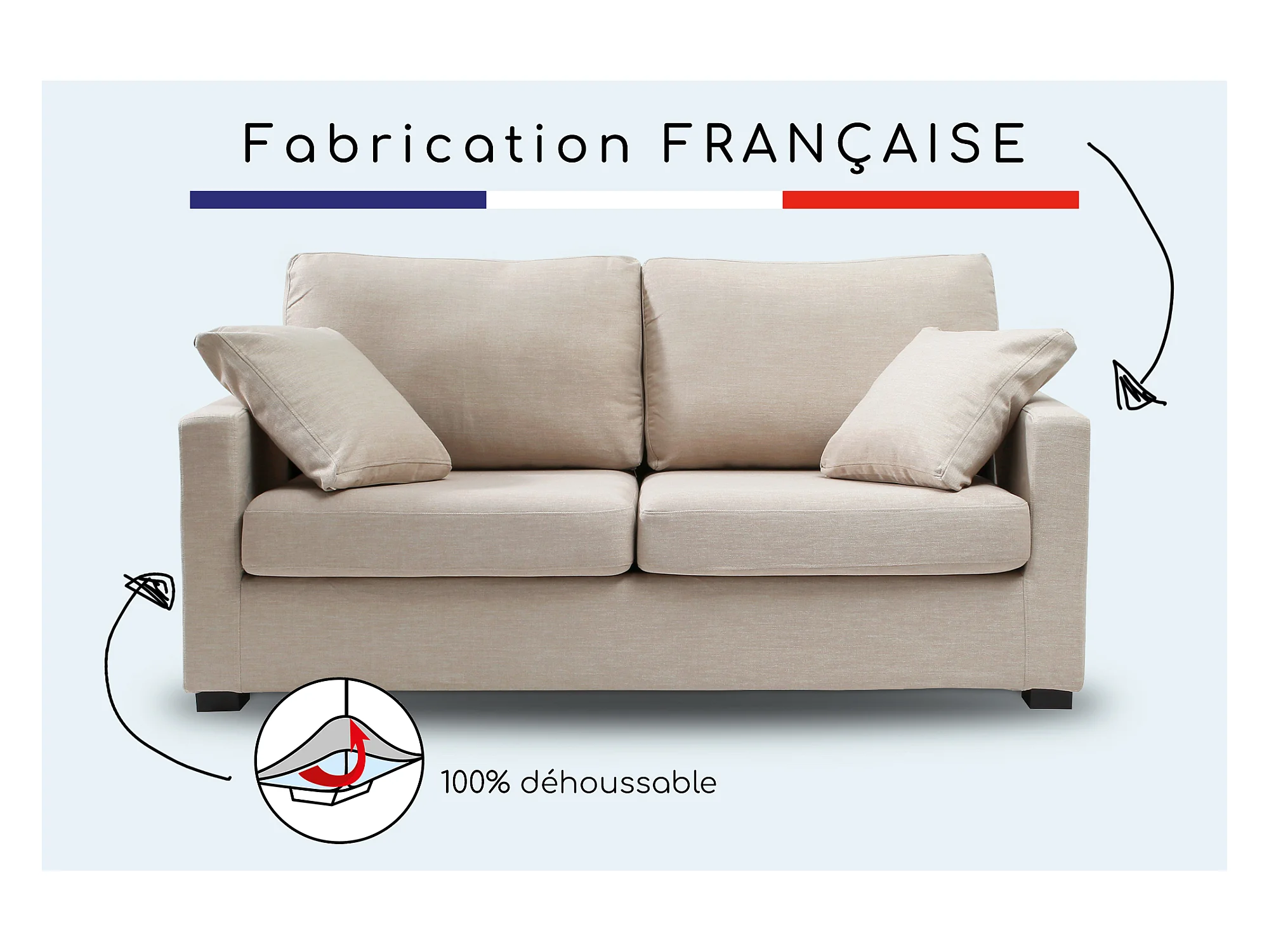 Canapé 3 pl LYS 175 cm fixe tissu Tradition Beige - 100% déhoussable - Fab. France