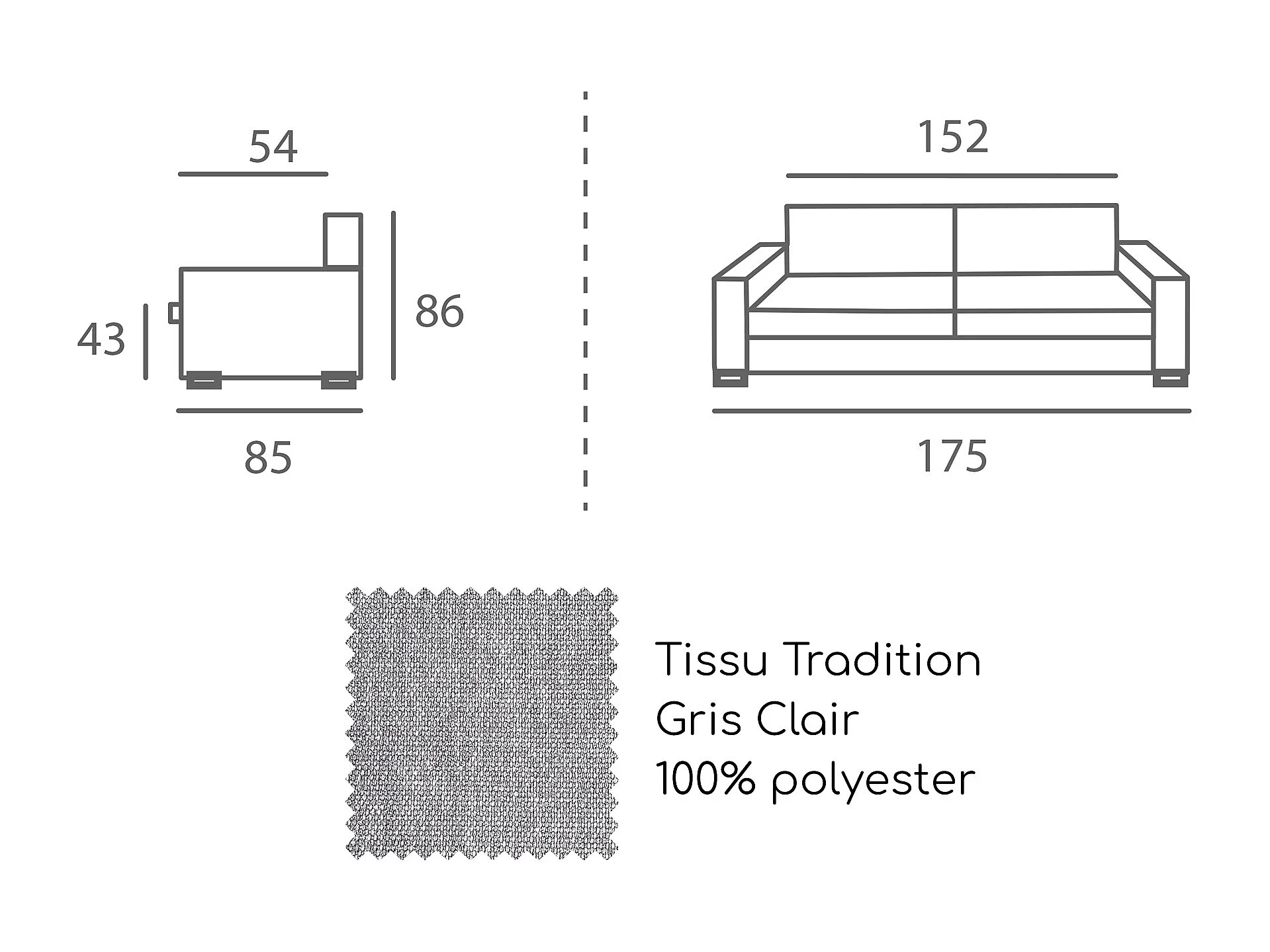Canapé 3 pl LYS 175 cm fixe tissu Tradition Gris Clair - 100% déhoussable - Fab. France