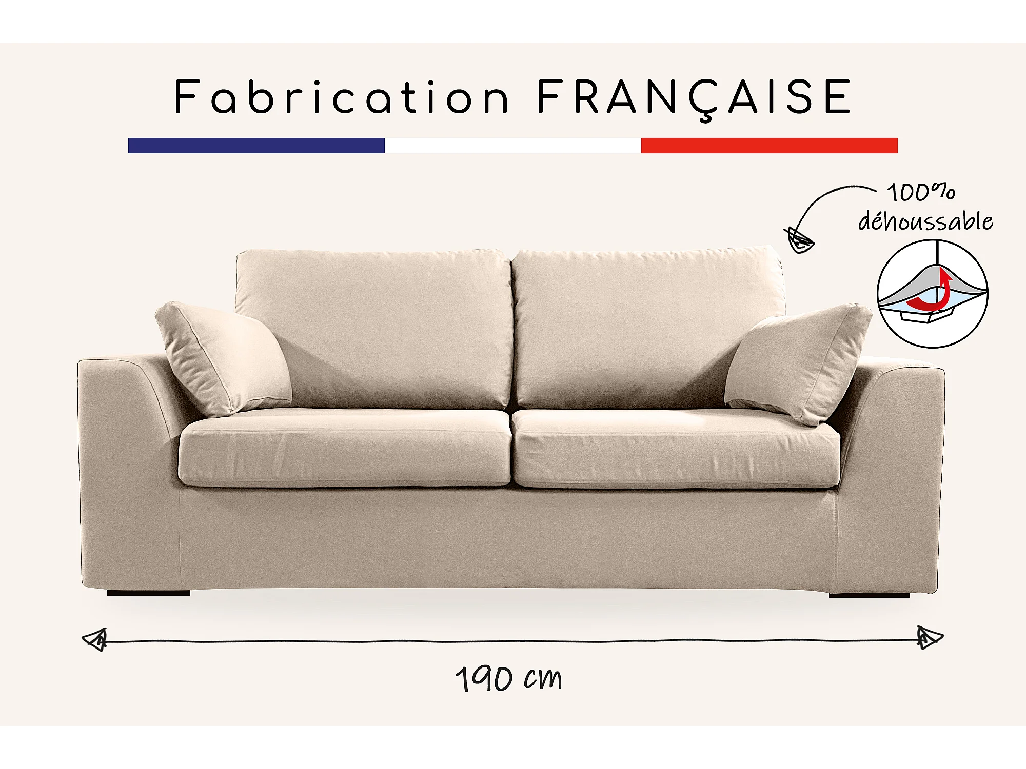 Canapé 3 pl TRESSIN 170 cm fixe tissu coton Taupe - 100% déhoussable - Fab. France