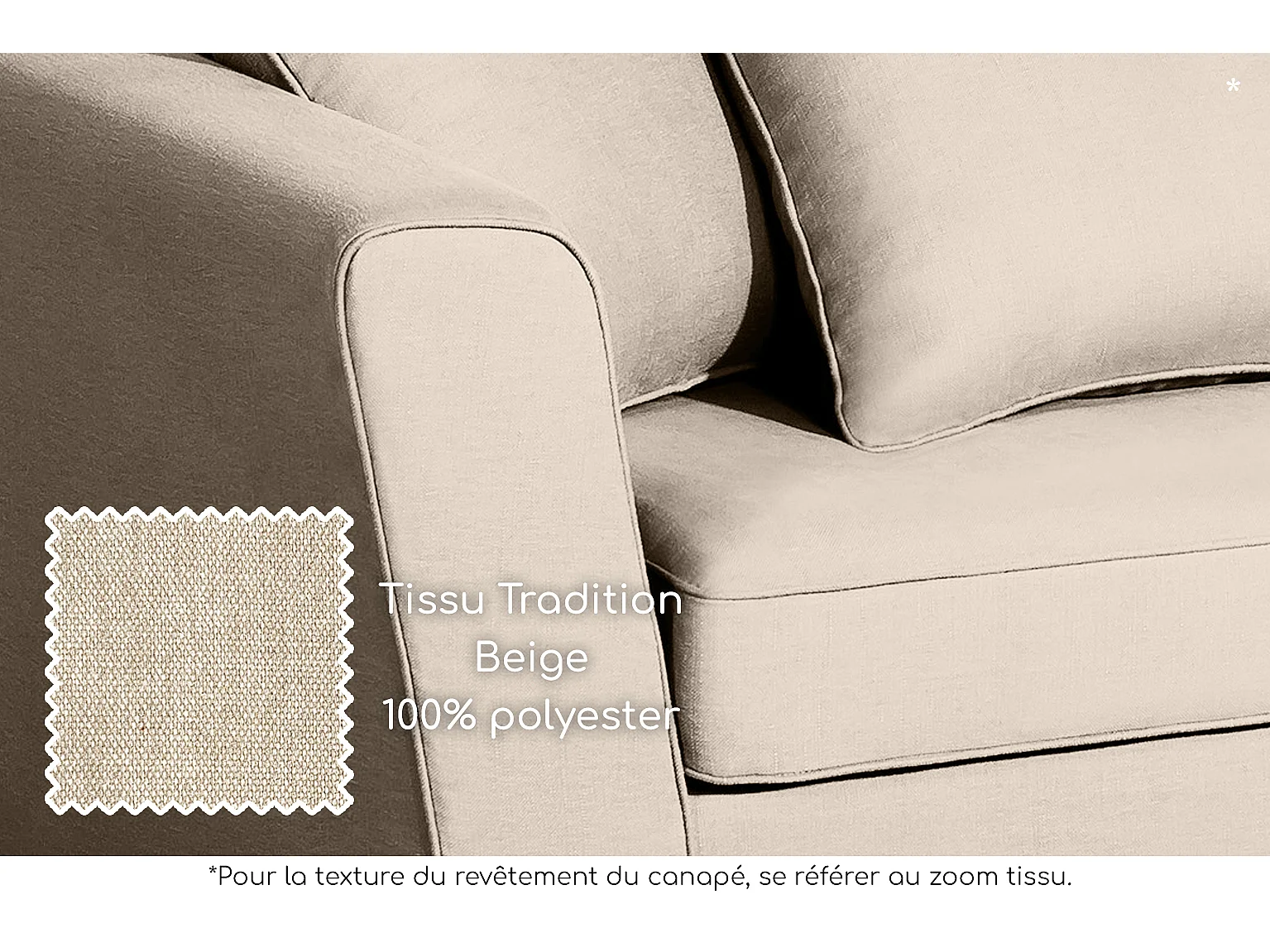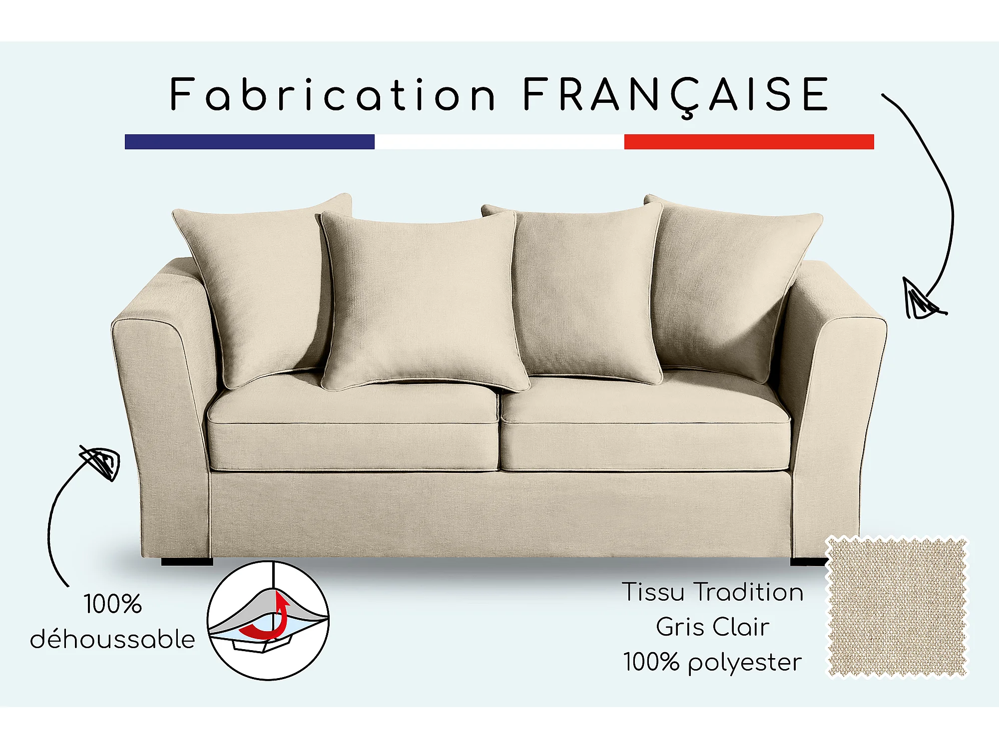 Canapé 3 pl YSER 200 cm fixe tissu Tradition Beige - 100% déhoussable - Fab. France