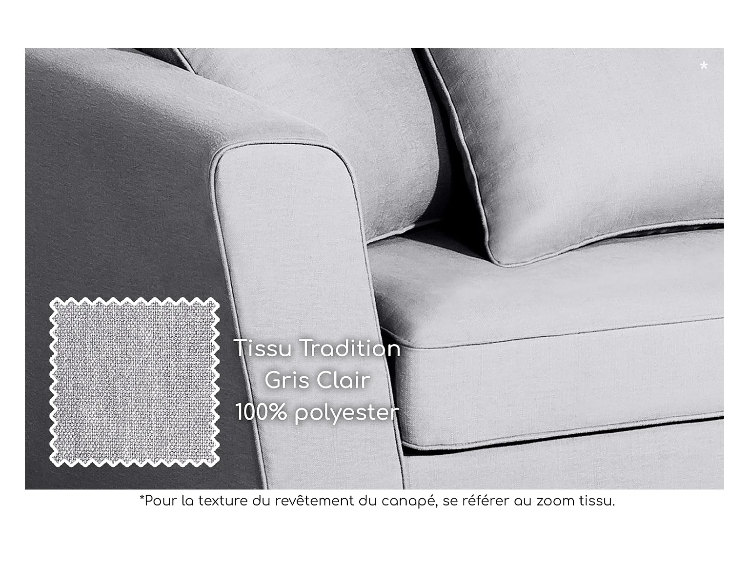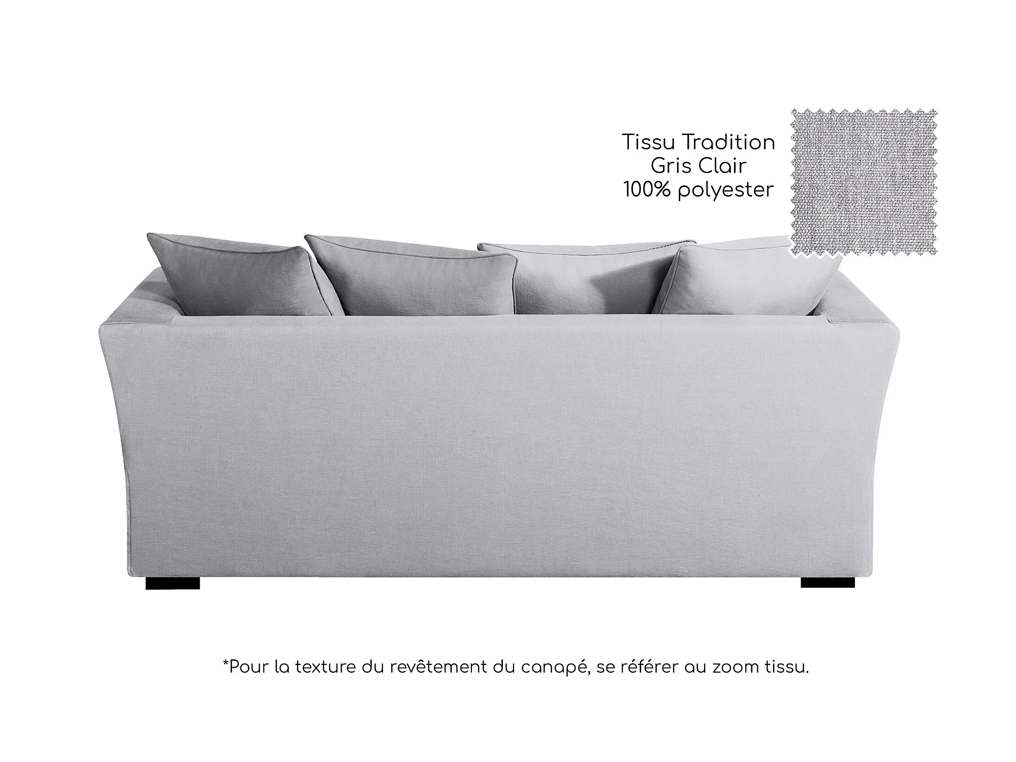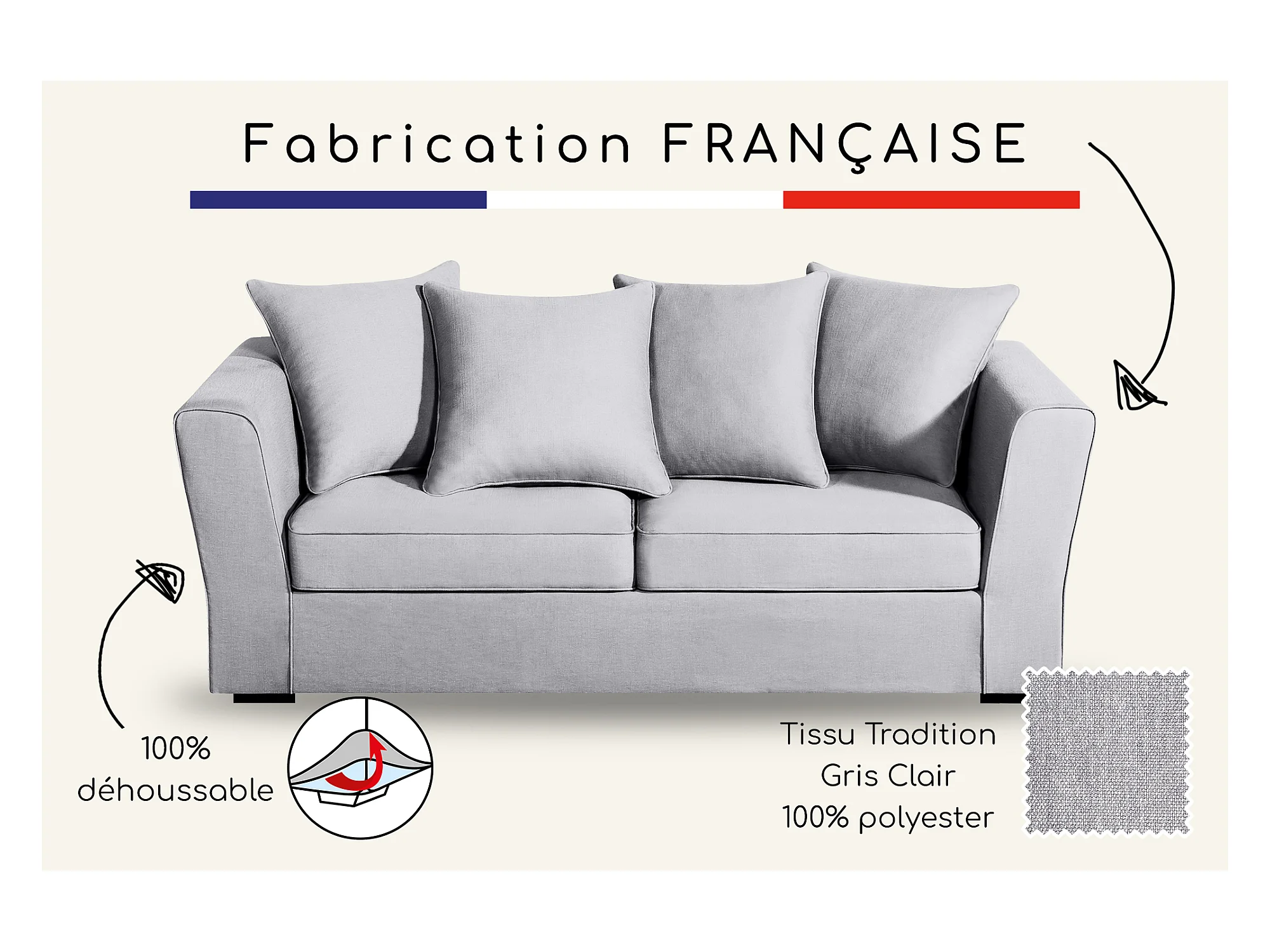 Canapé 3 pl YSER 200 cm fixe tissu Tradition Gris Clair - 100% déhoussable - Fab. France