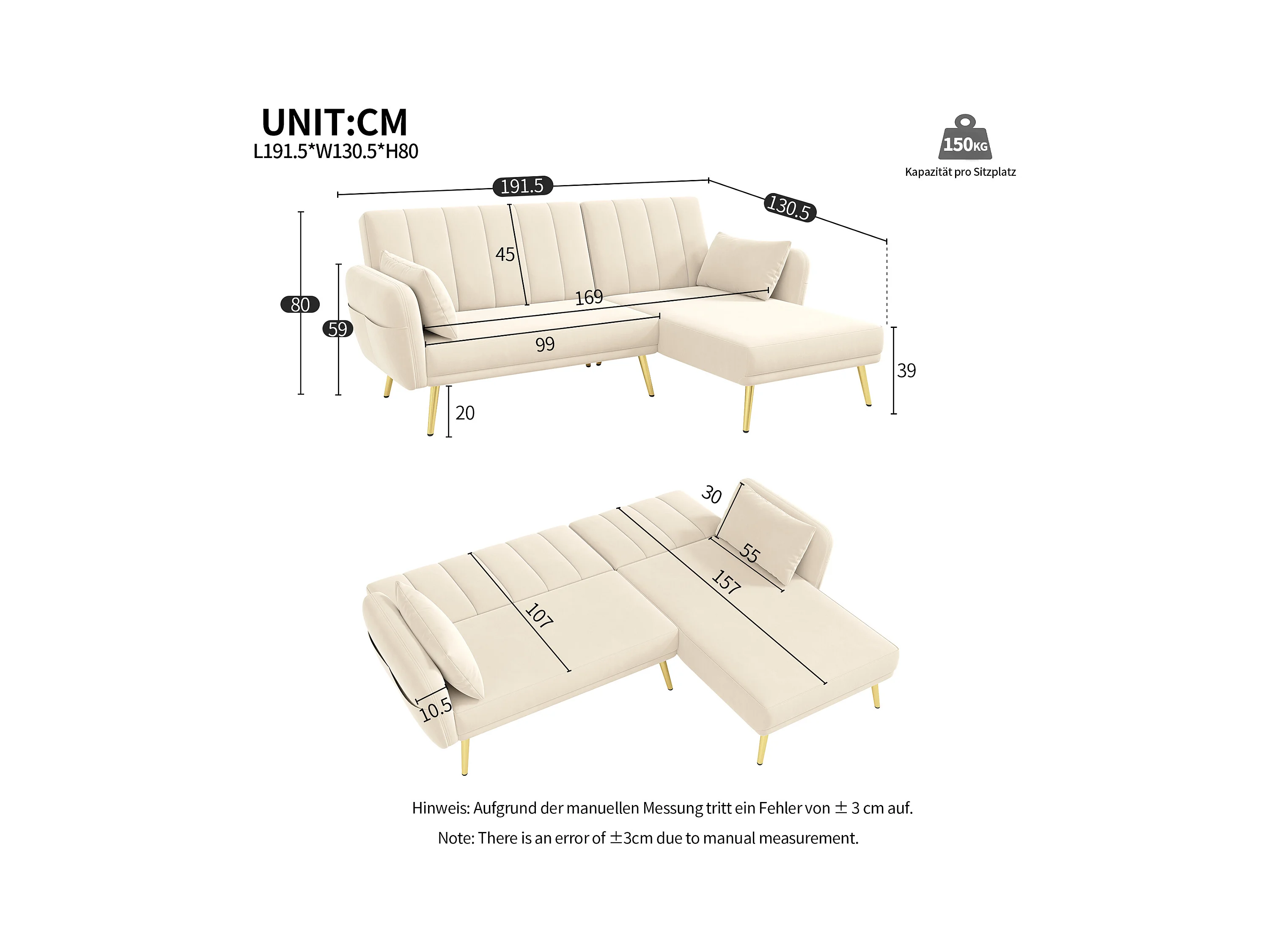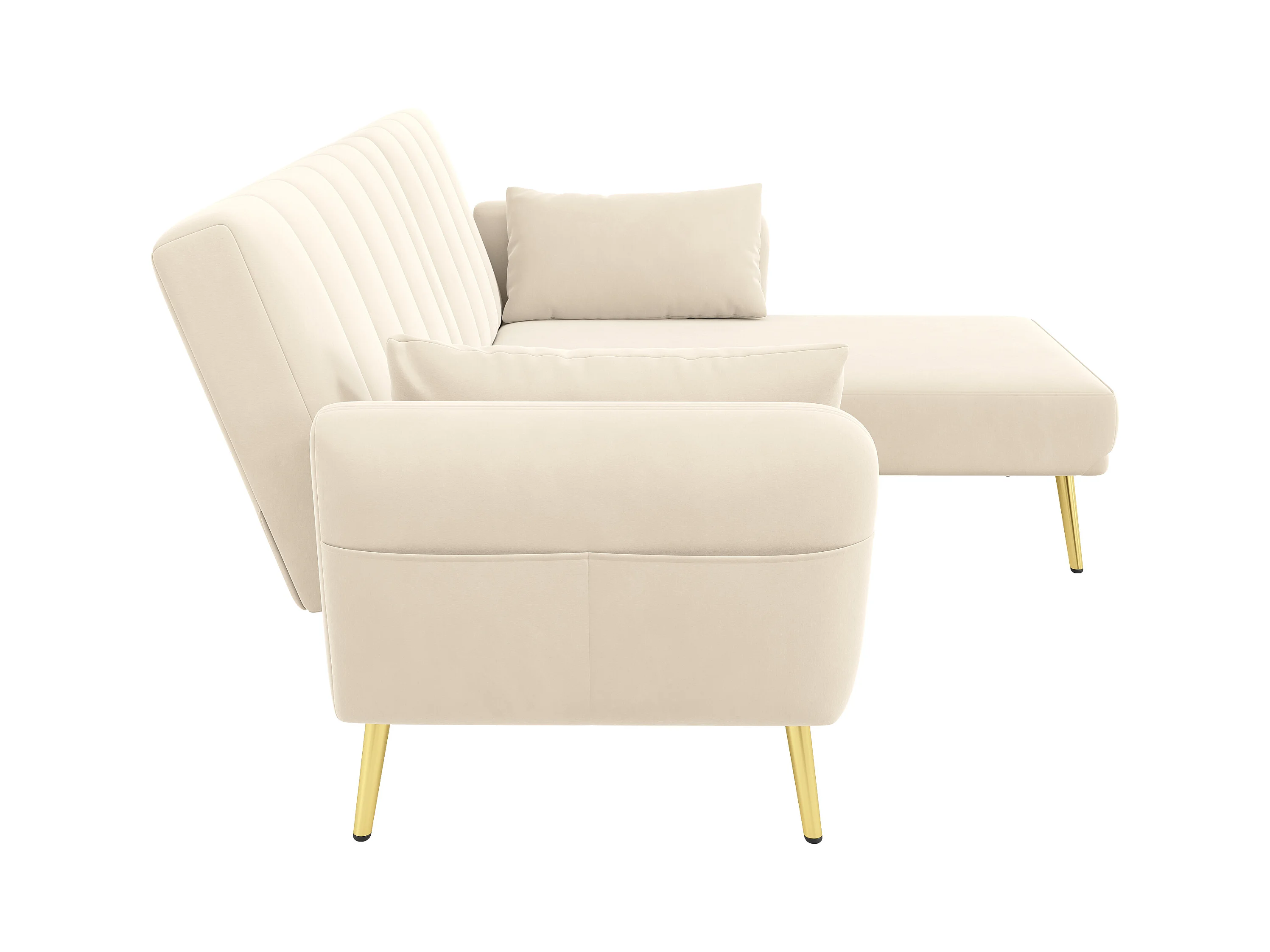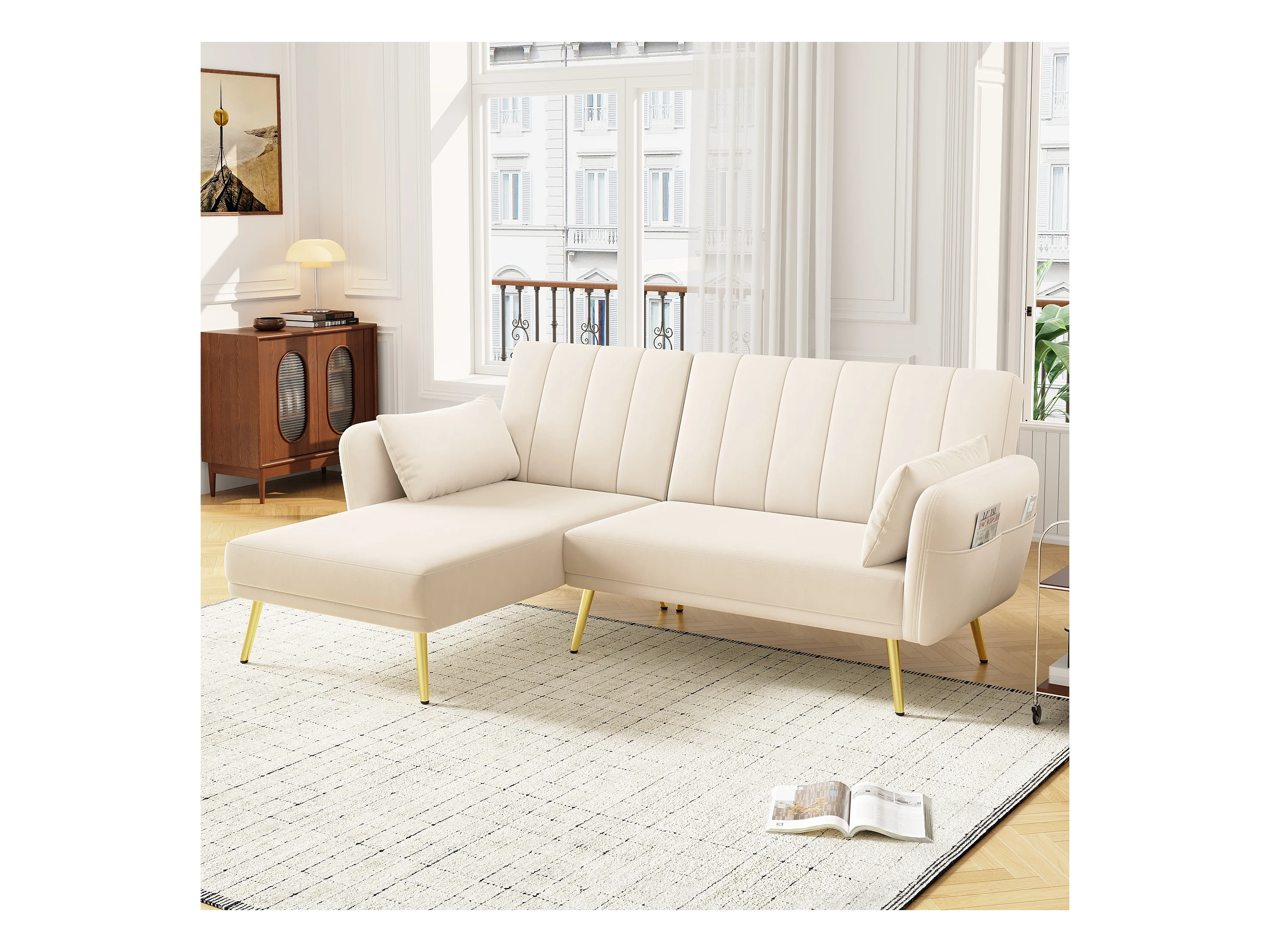 Canapé 3 places avec poches latérales et dossier réglable, pieds dorés - velours beige