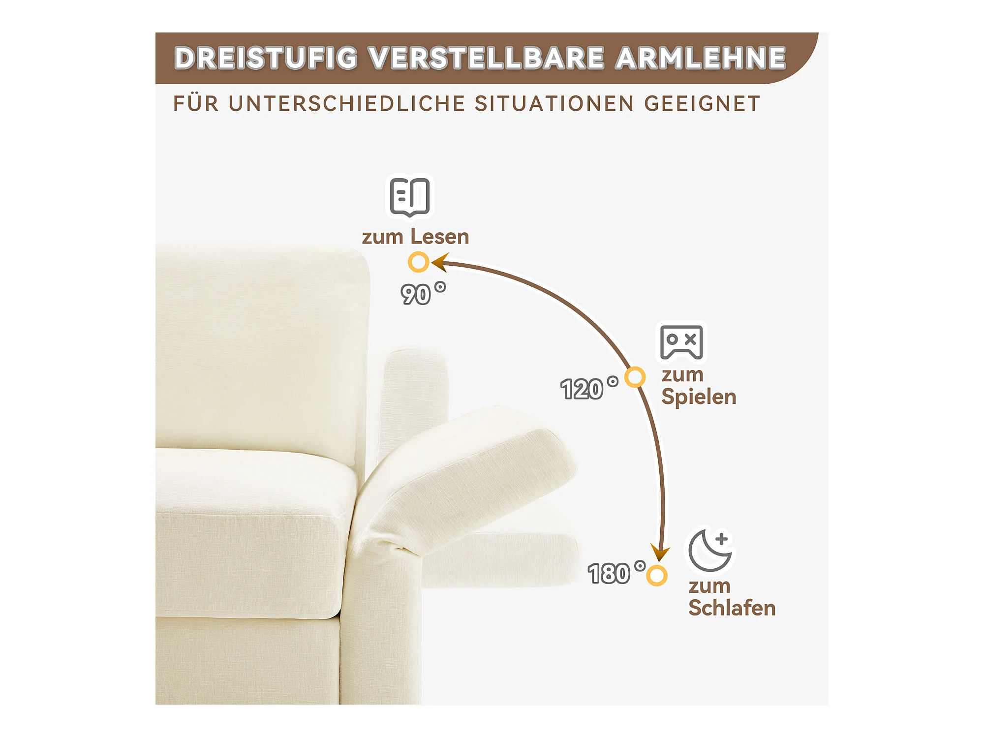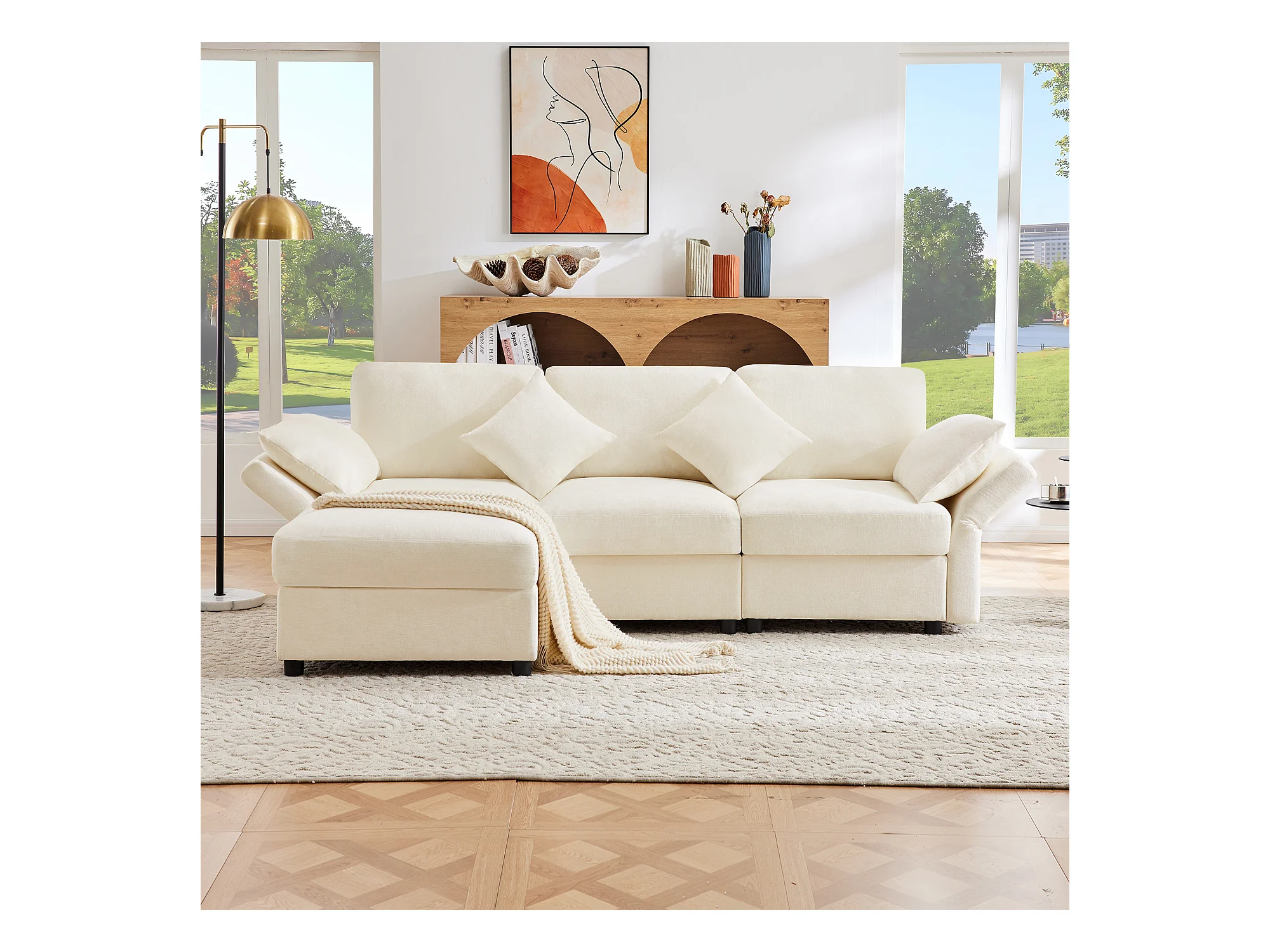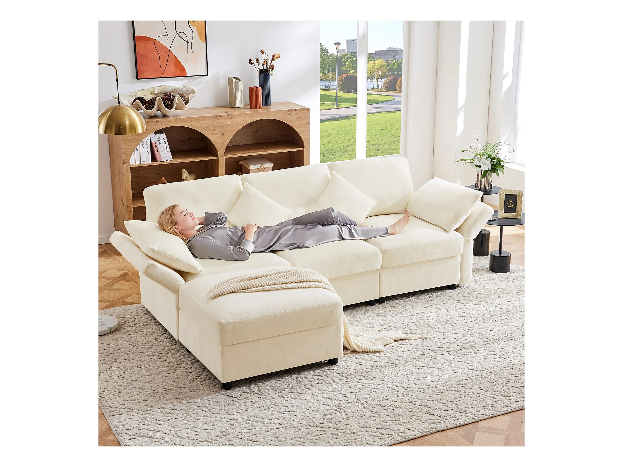 Canapé 3 places avec repose-pieds + 4 coussins - 218 x 156.5 x 86 cm - accoudoirs réglables - velours - beige