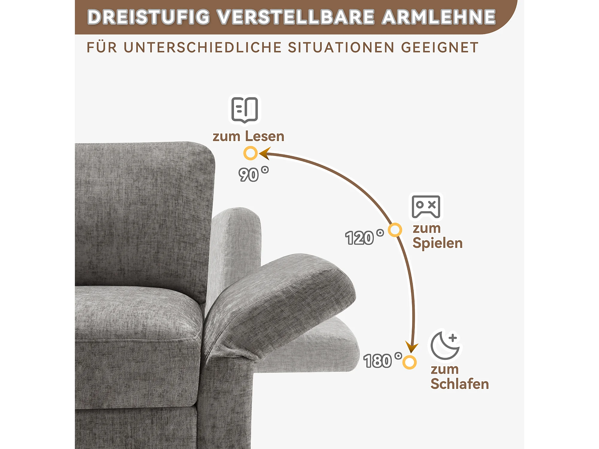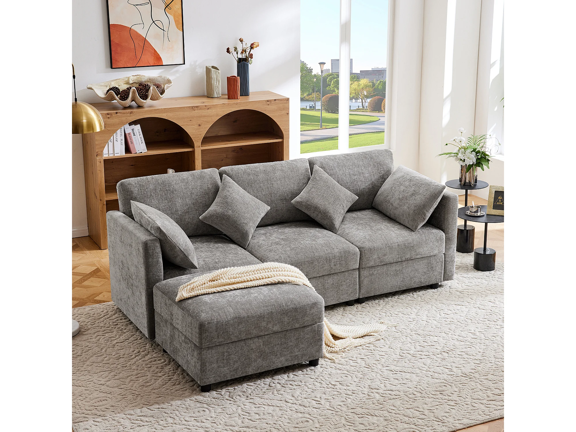 Canapé 3 places avec repose-pieds + 4 coussins - 218 x 156.5 x 86 cm - accoudoirs réglables - velours - gris