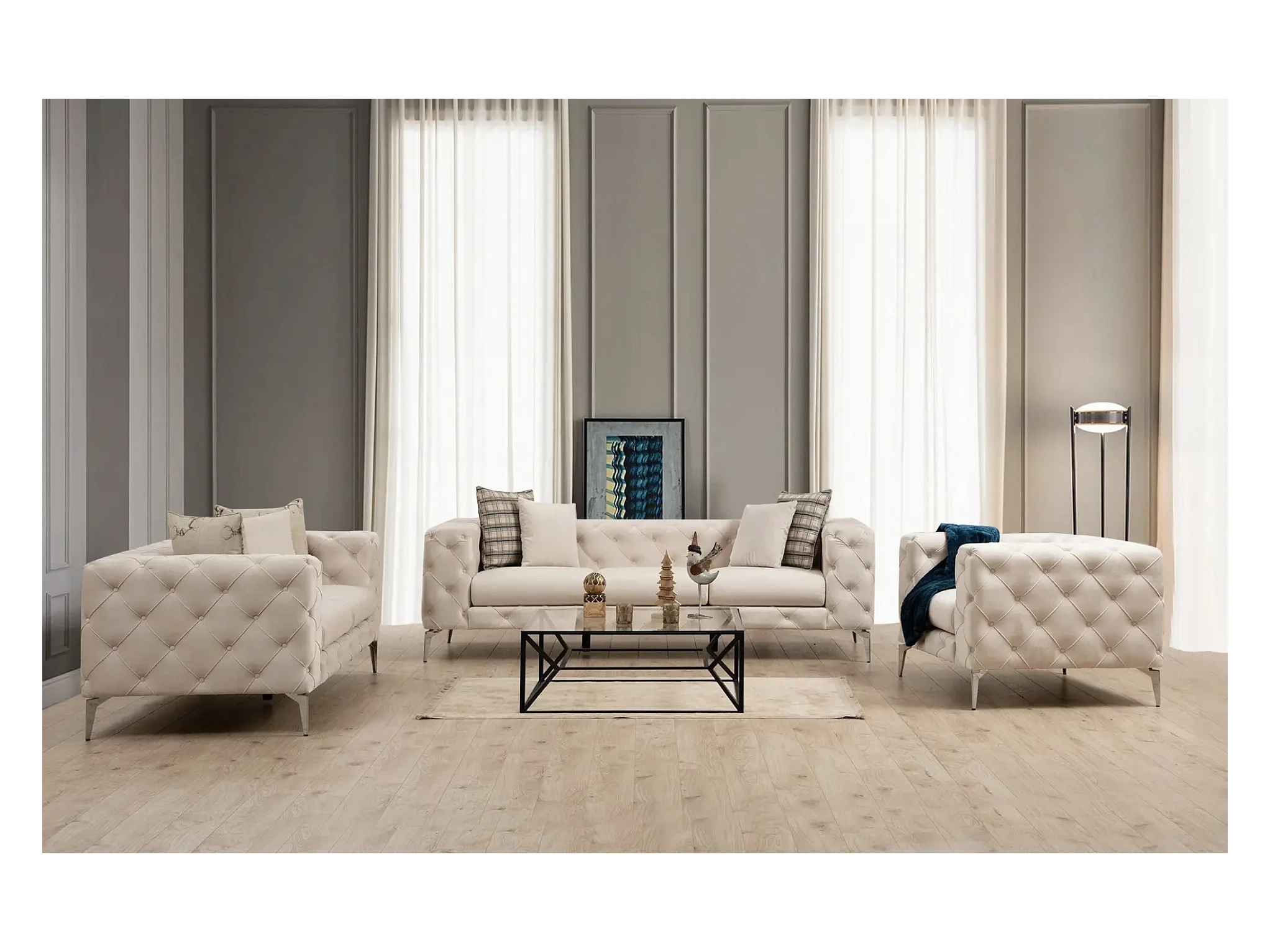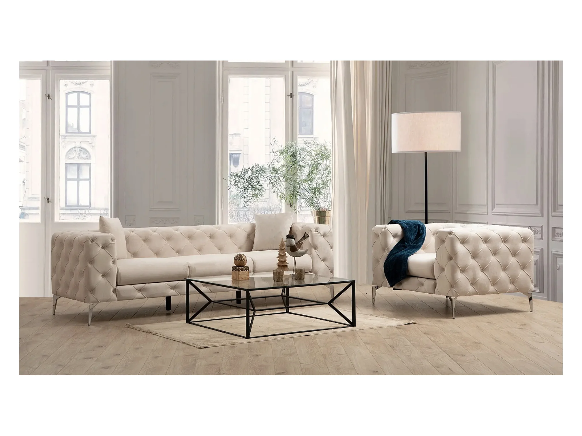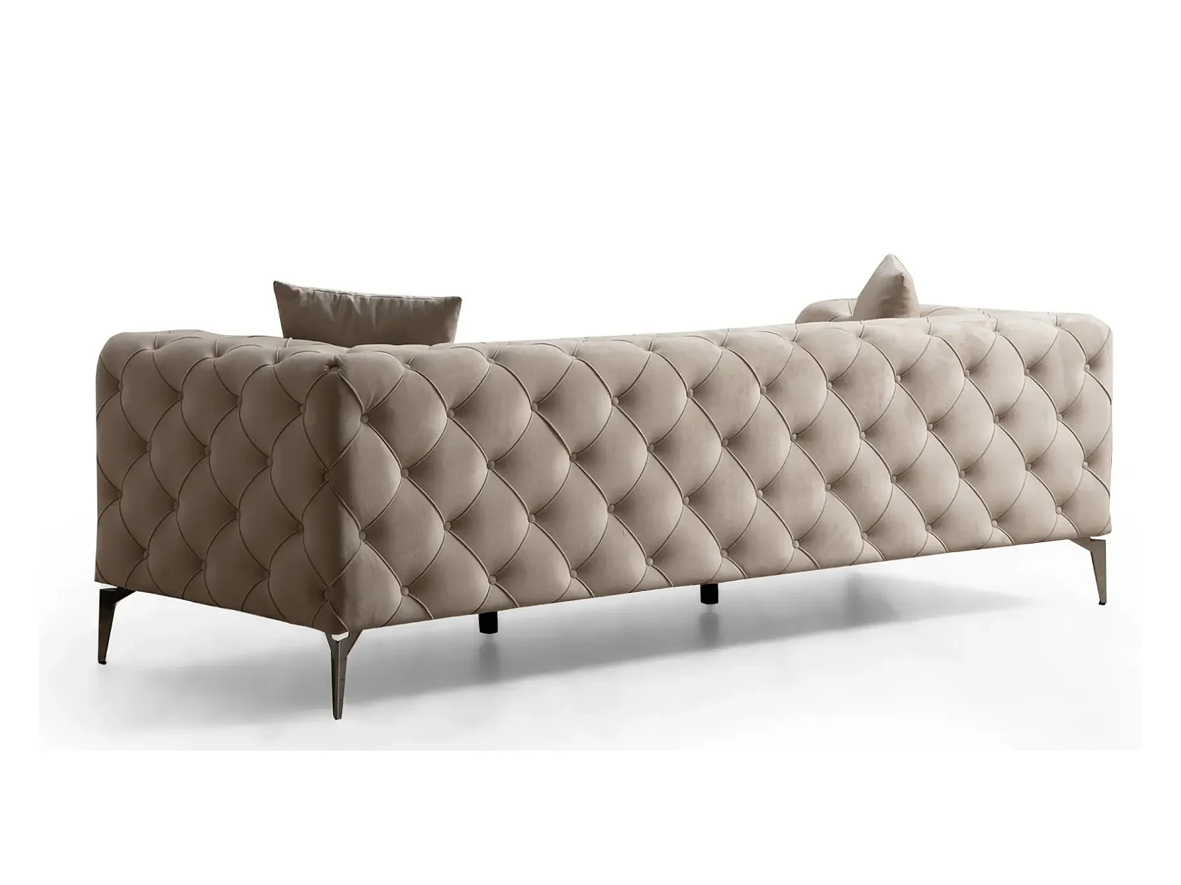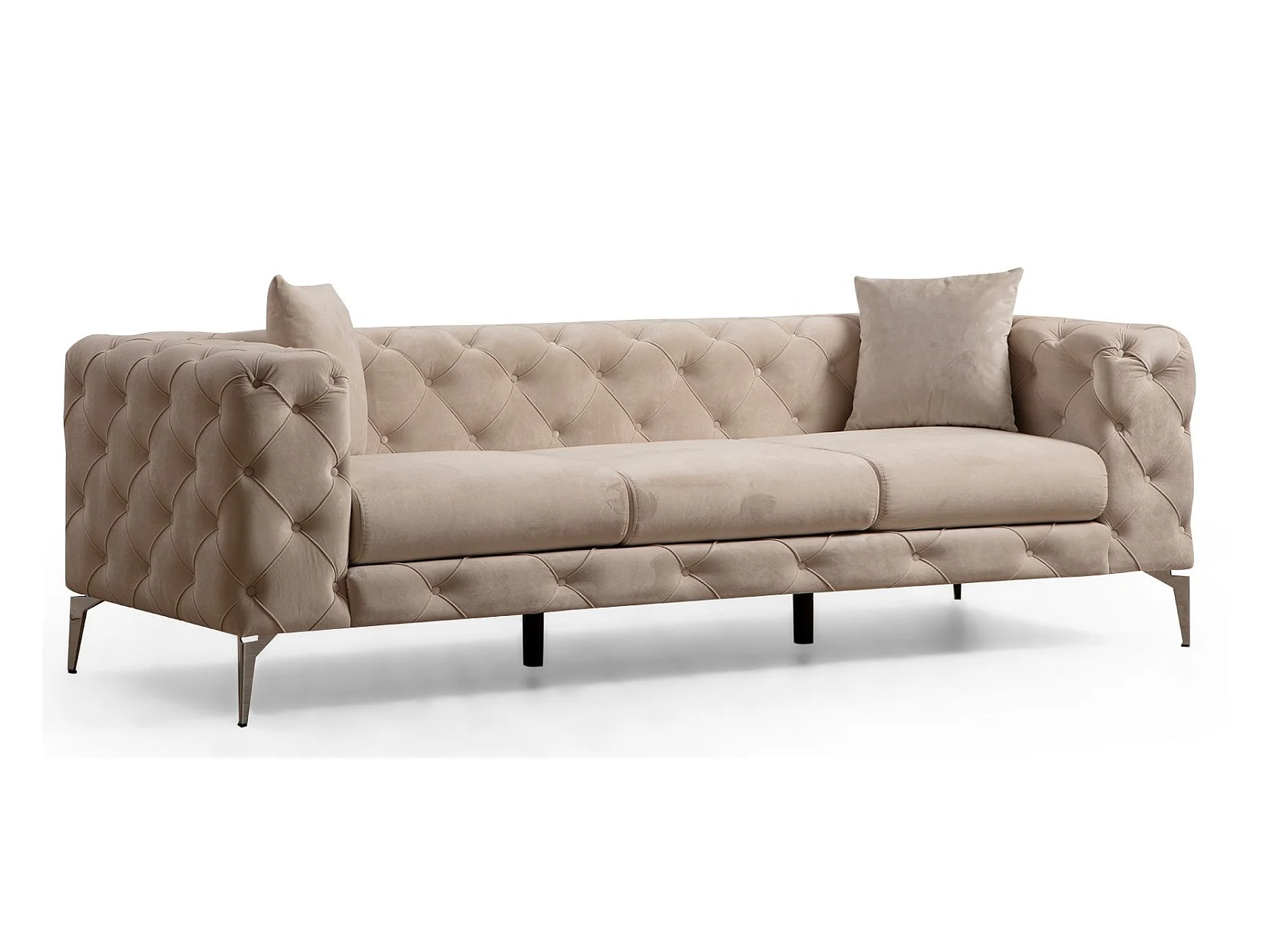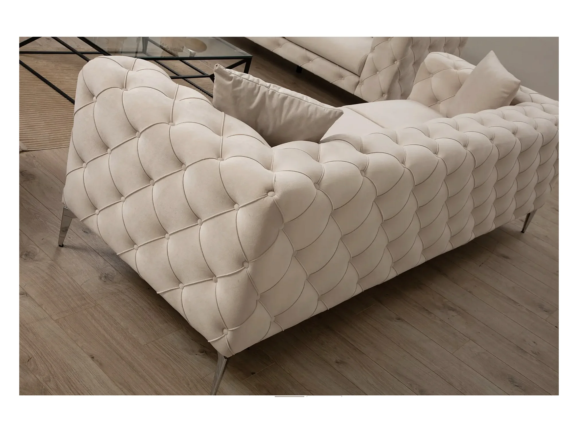 Canapé 3 places capitonné velours beige clair et pieds chromé Herakles 237cm