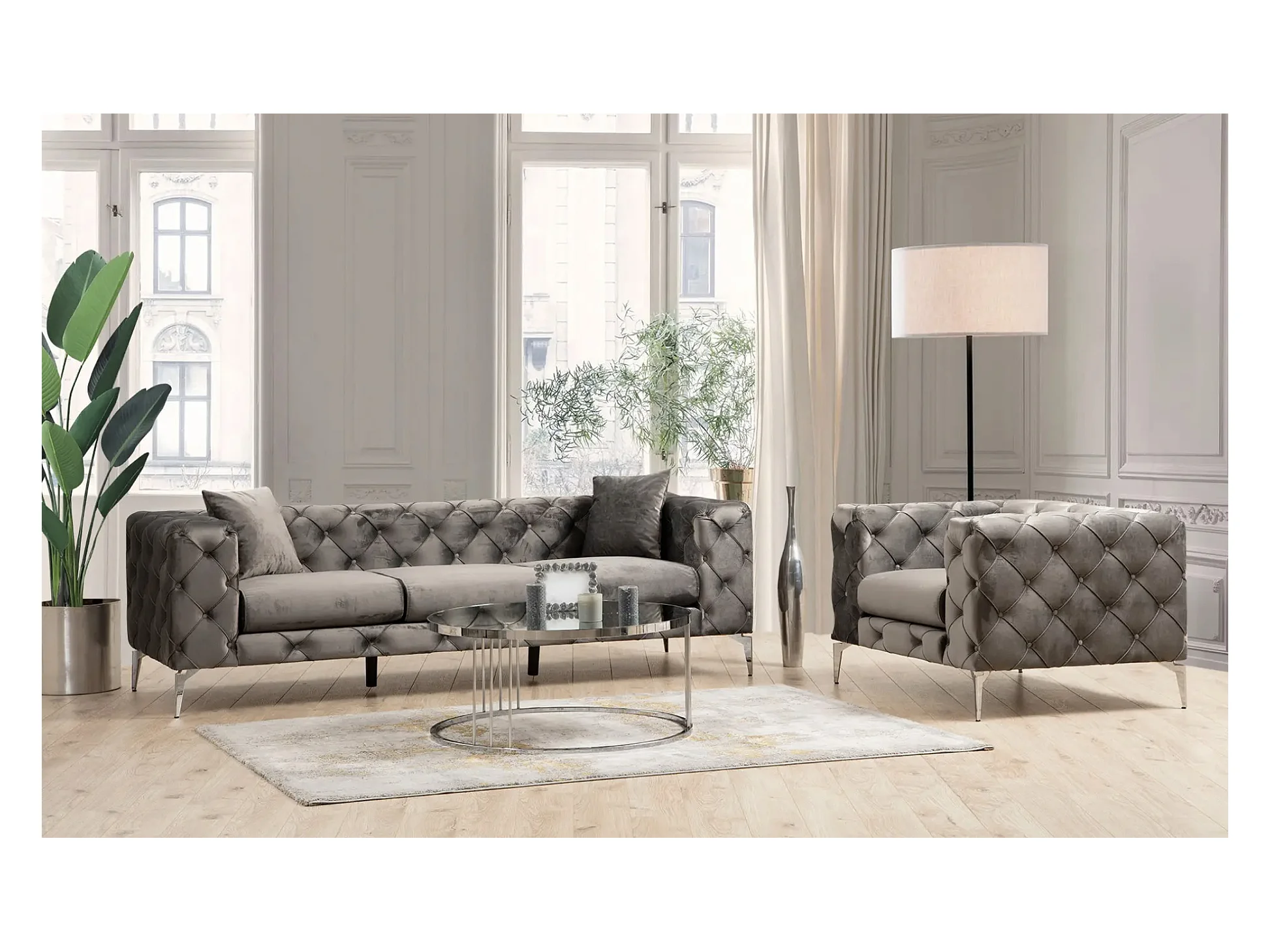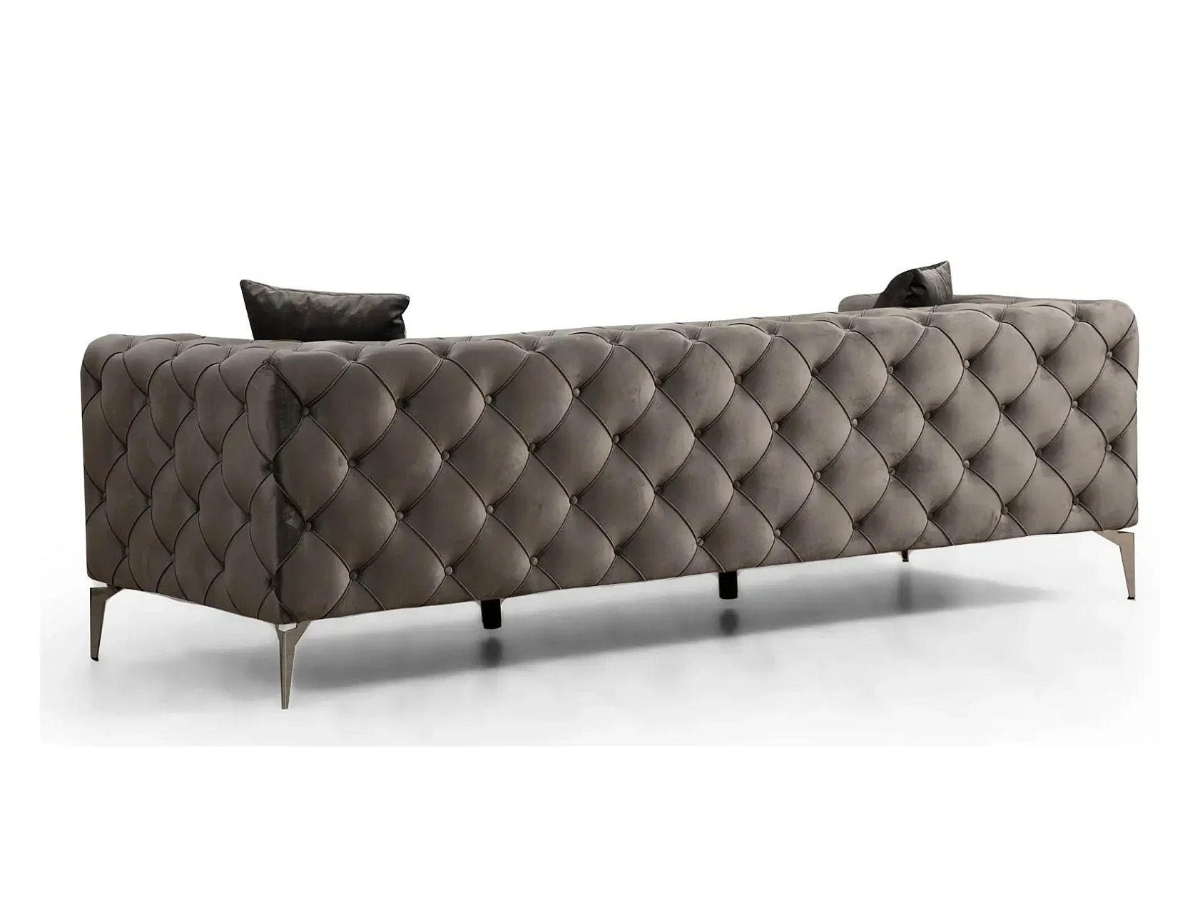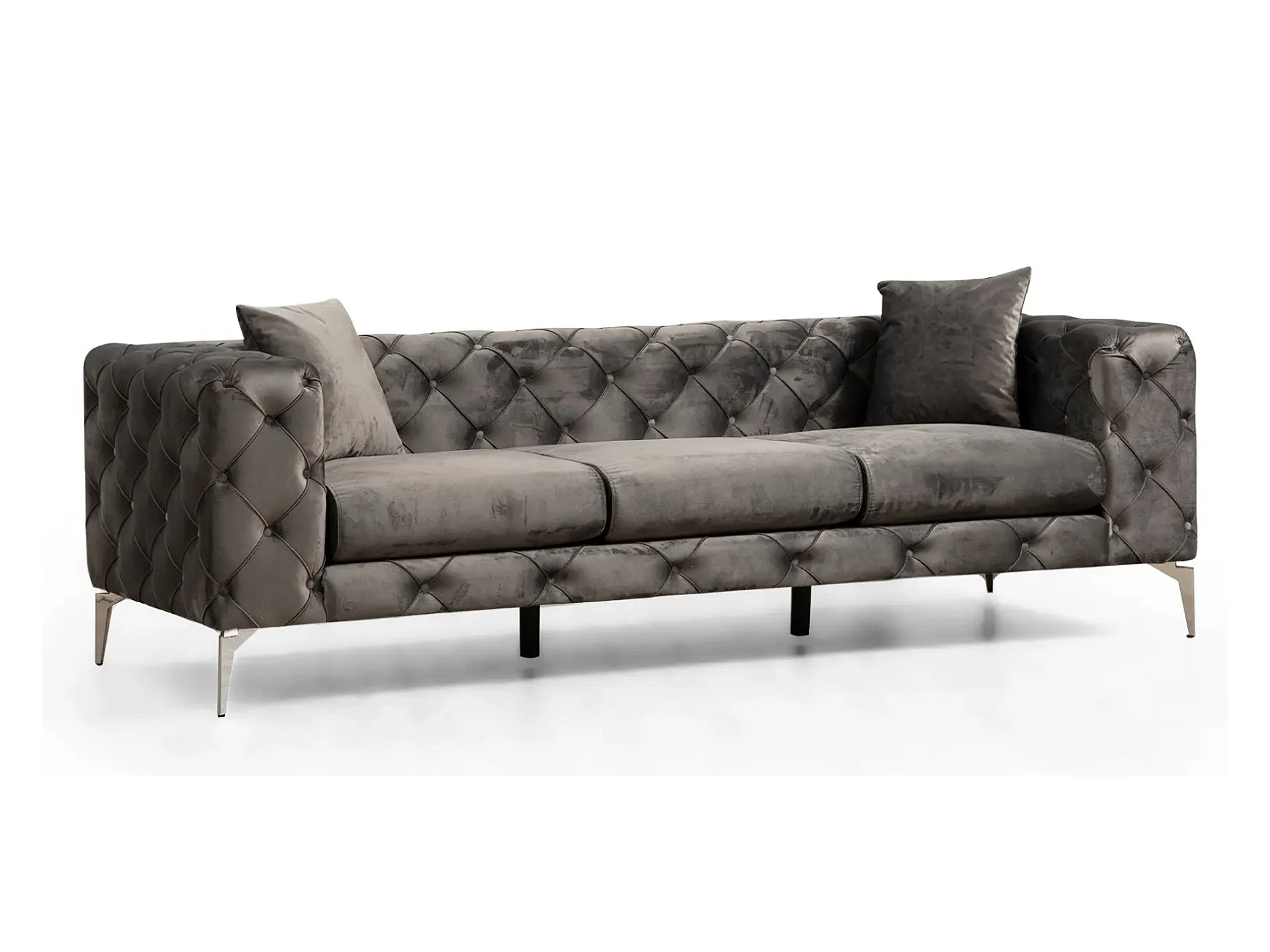 Canapé 3 places capitonné velours gris foncé et pieds chromés Herakles 237cm