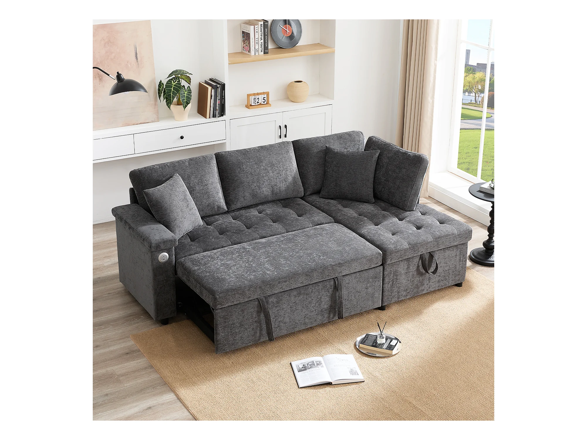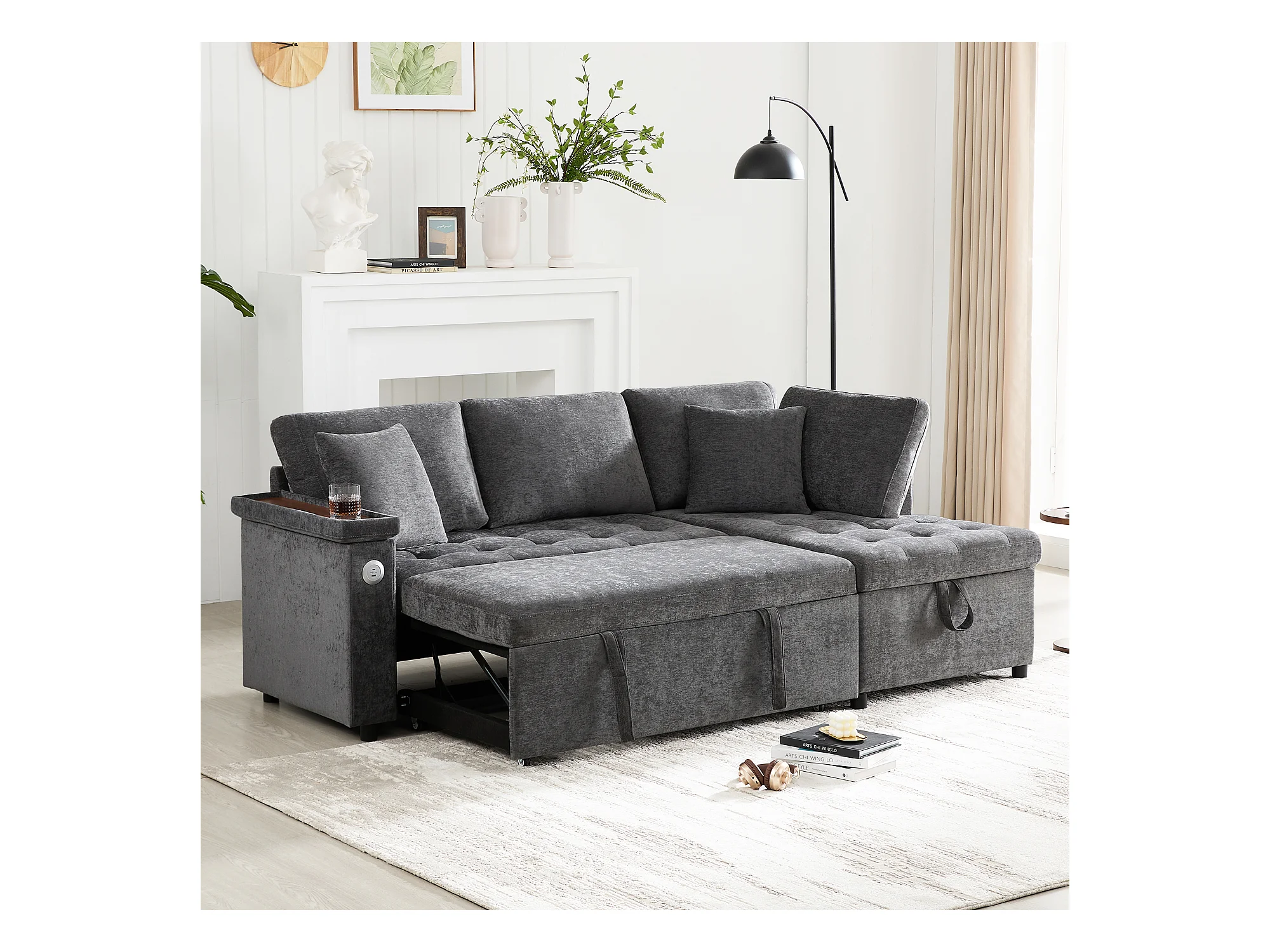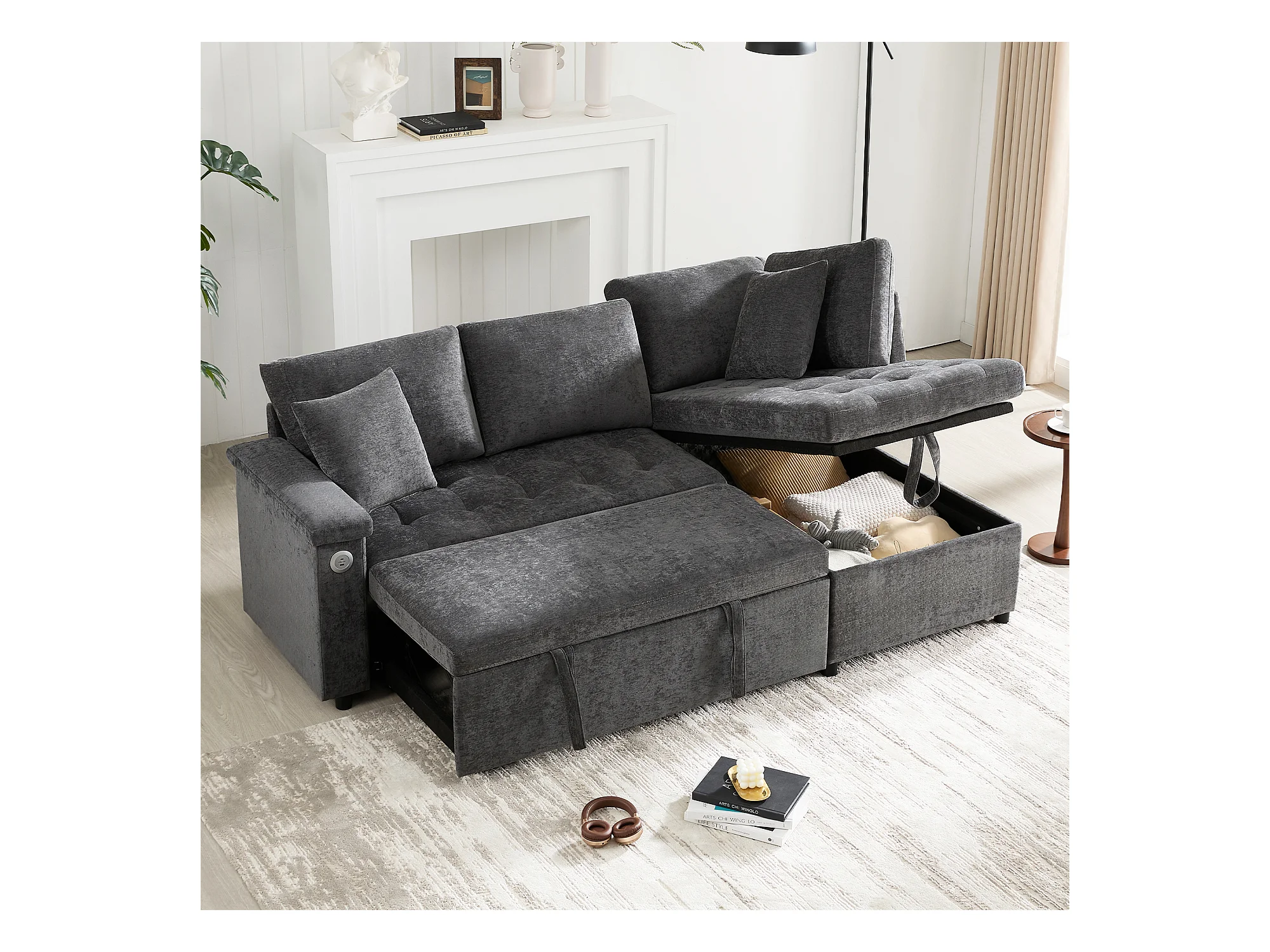 Canapé 3 places convertible gigogne avec rangement - 209 x 130 x 84 cm - avec USB + 2 oreillers - velours - gris