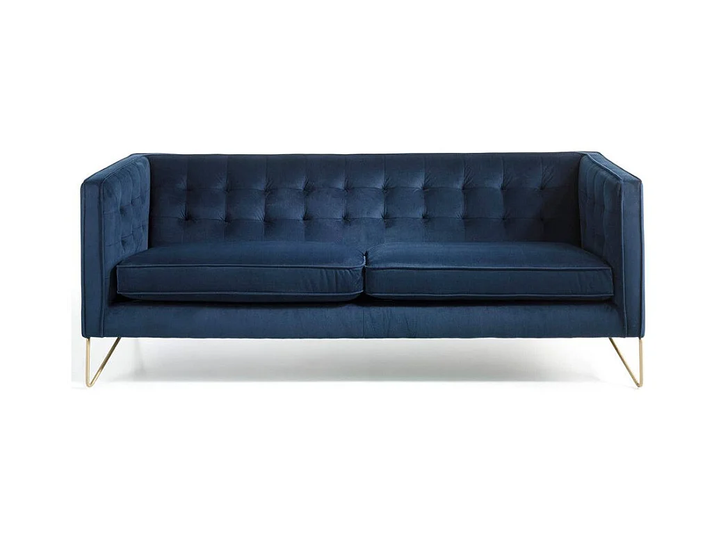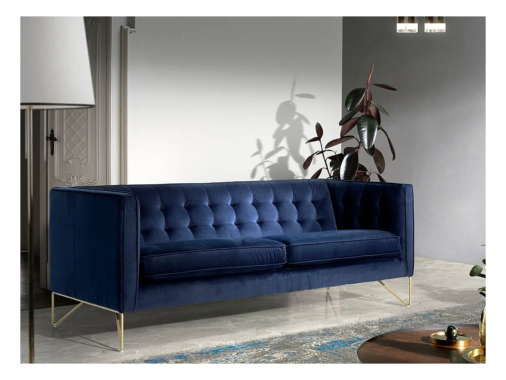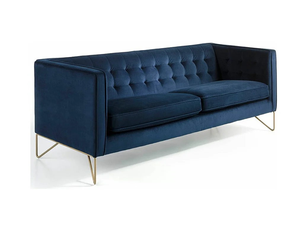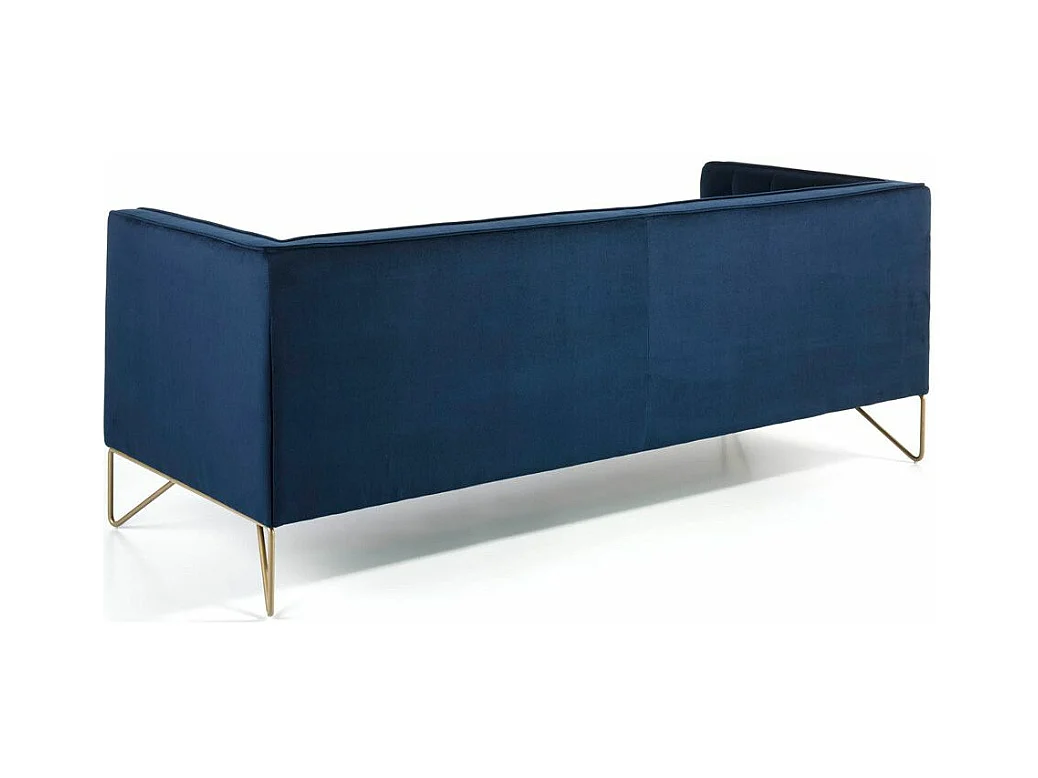 Canapé 3 places effet velours bleu et pieds métal doré Arkane