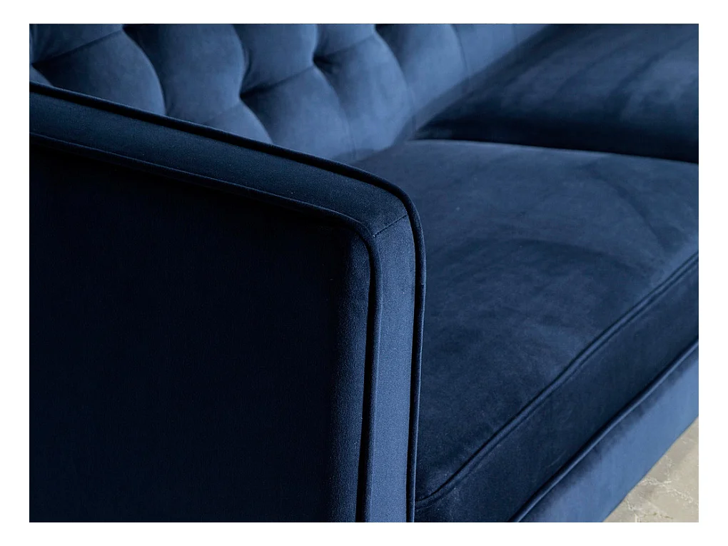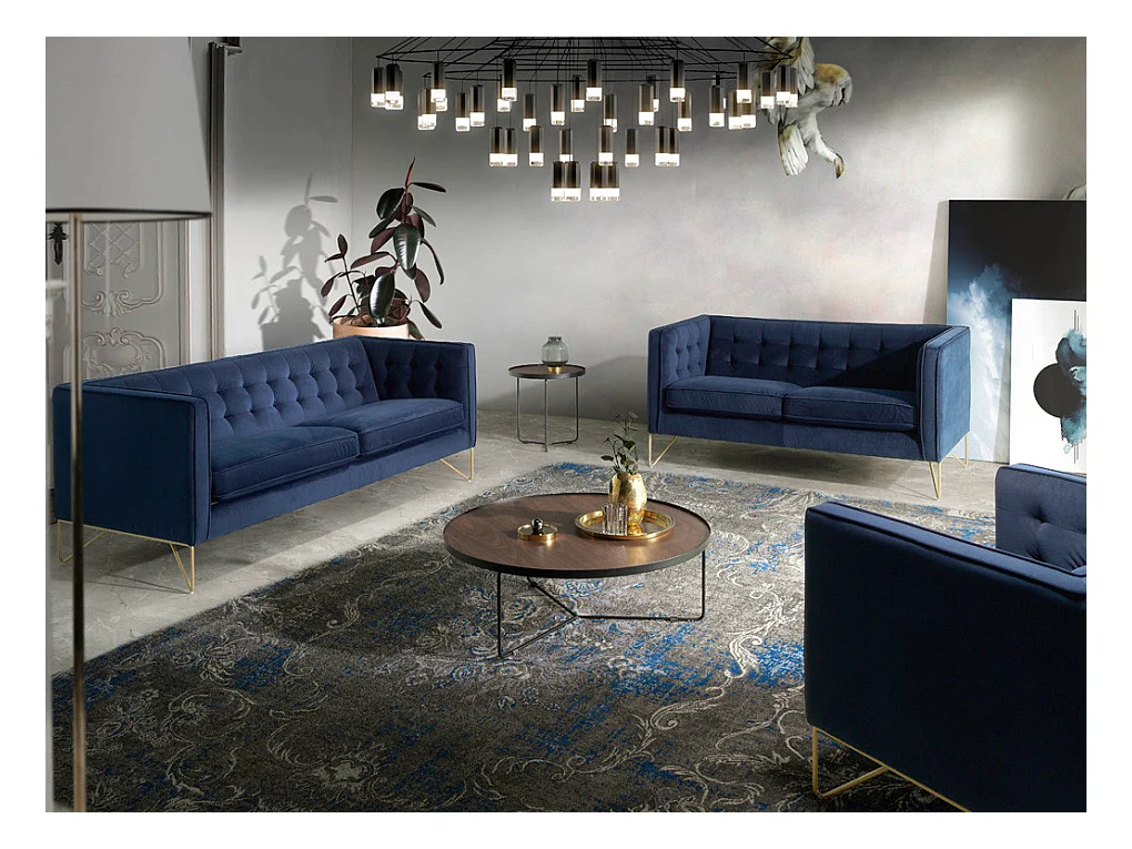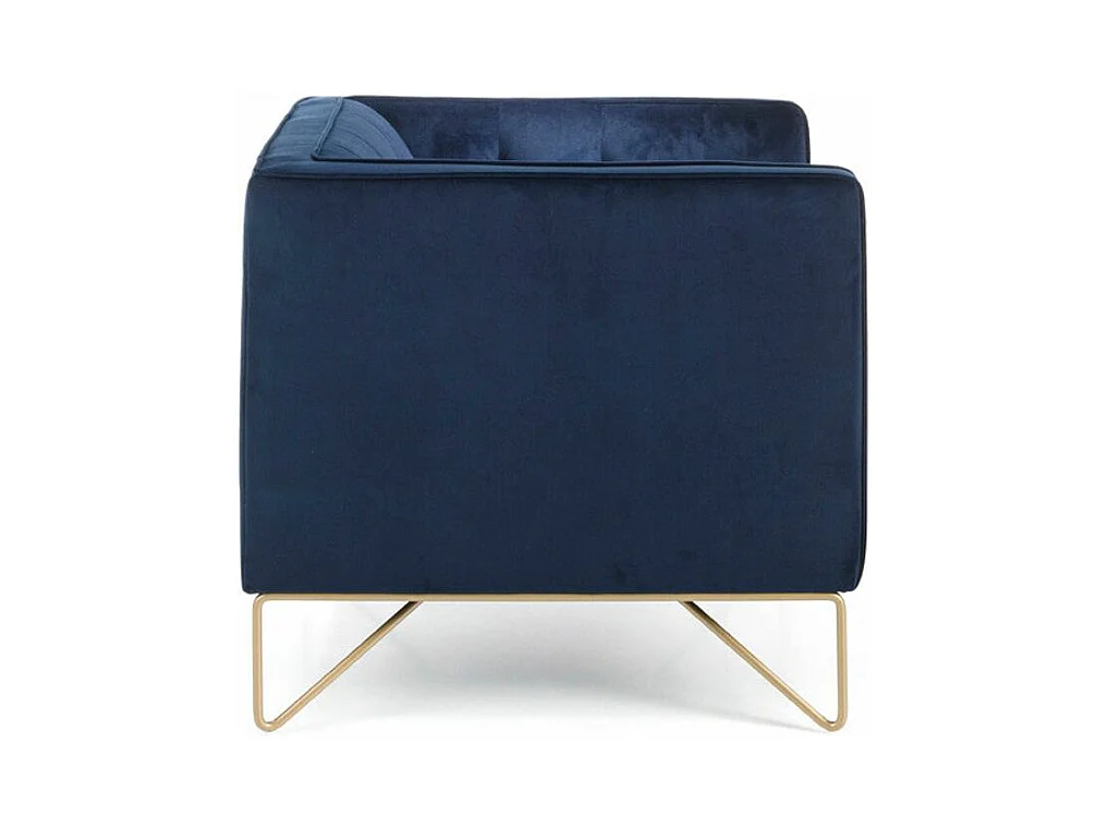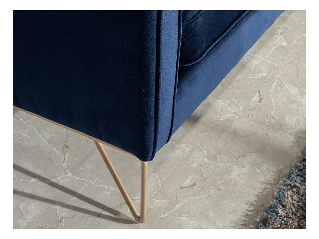 Canapé 3 places effet velours bleu et pieds métal doré Arkane