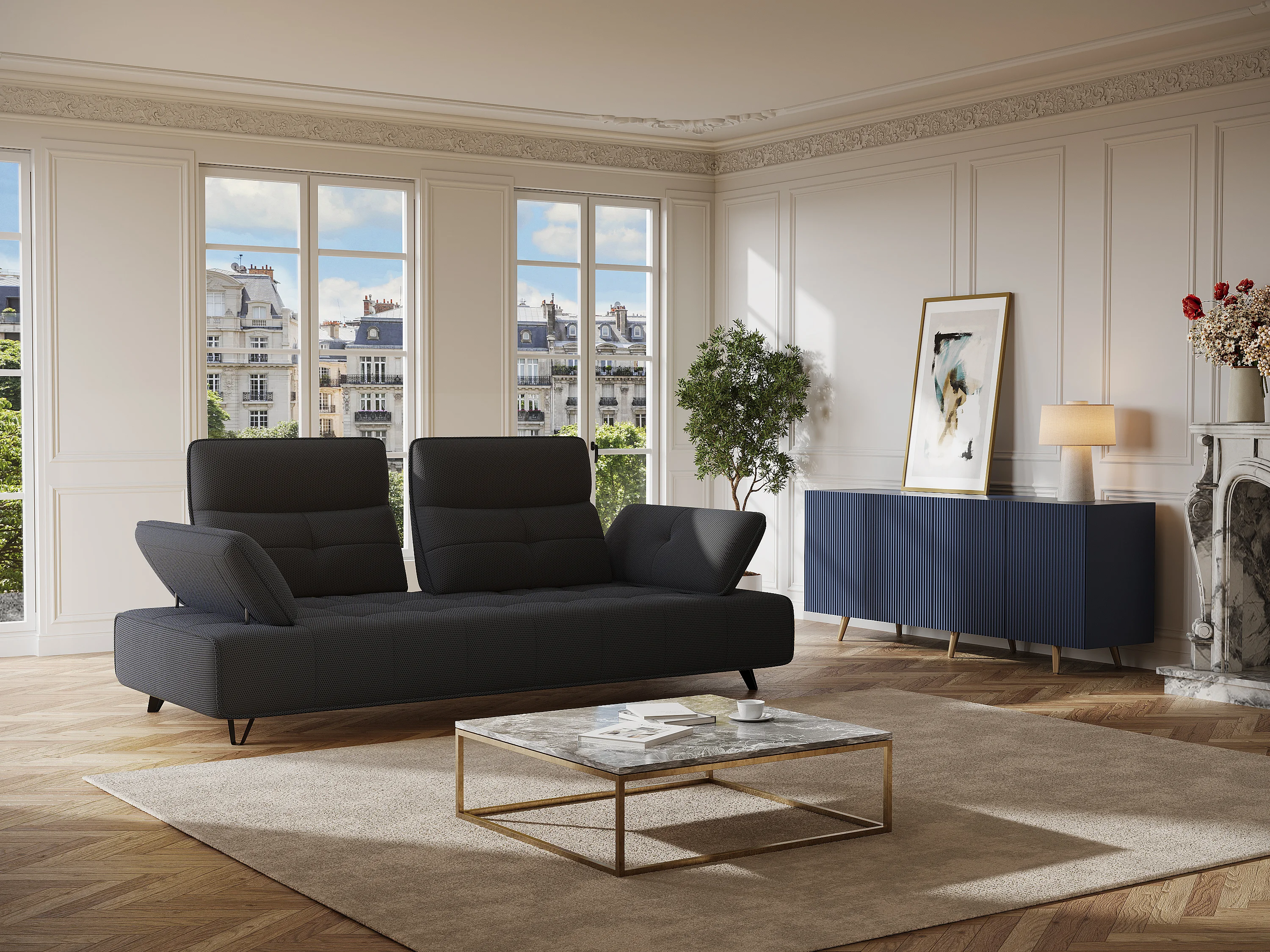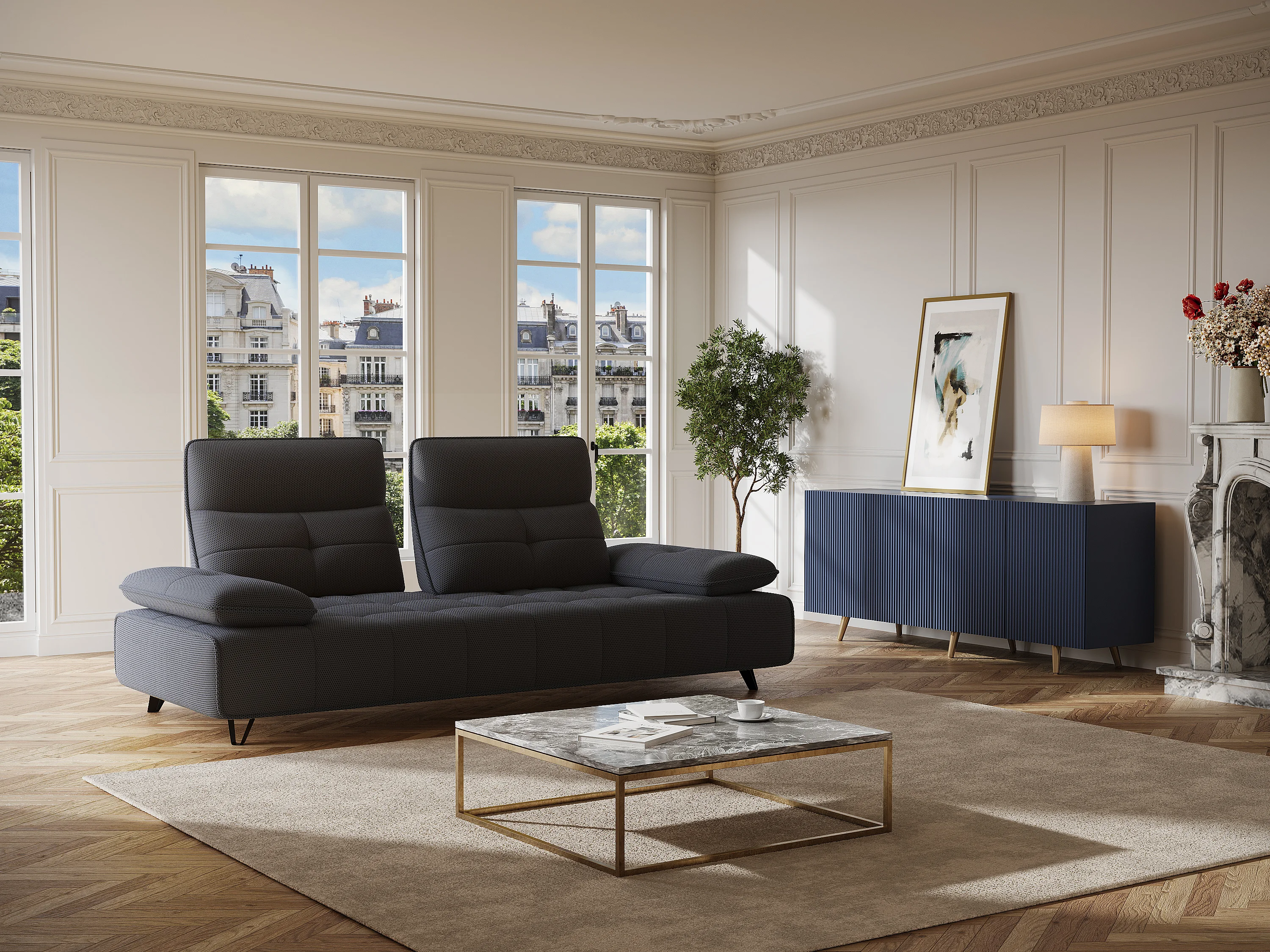 Canapé 3 places en tissu 3D gris anthracite avec dossier avance-recule MERCOTA