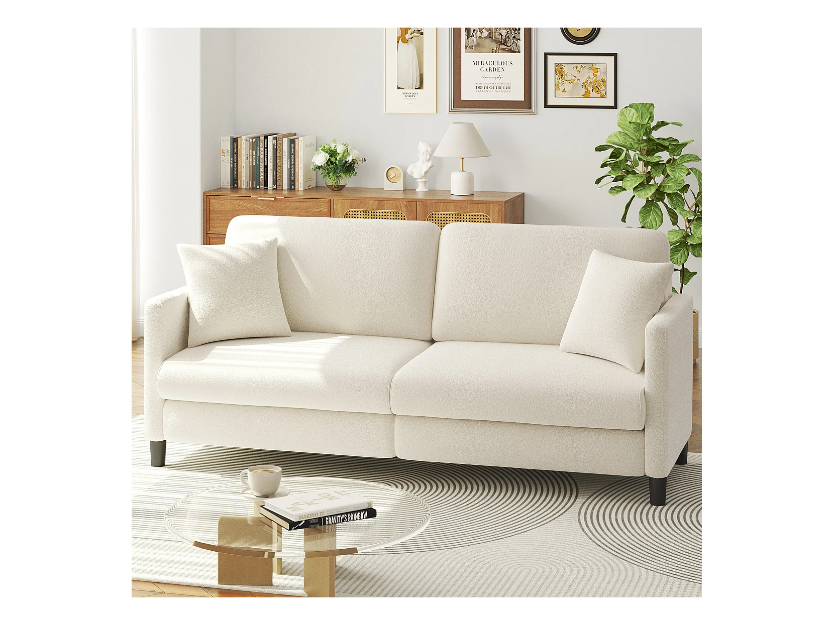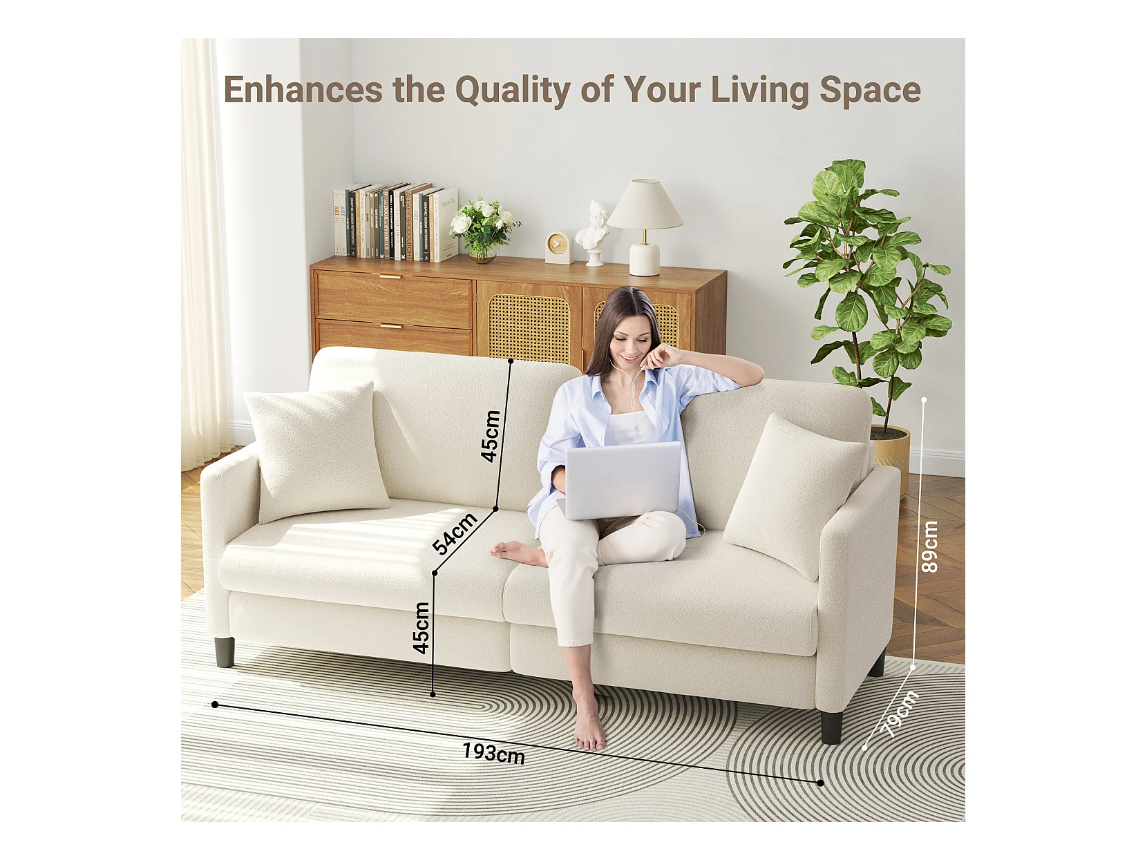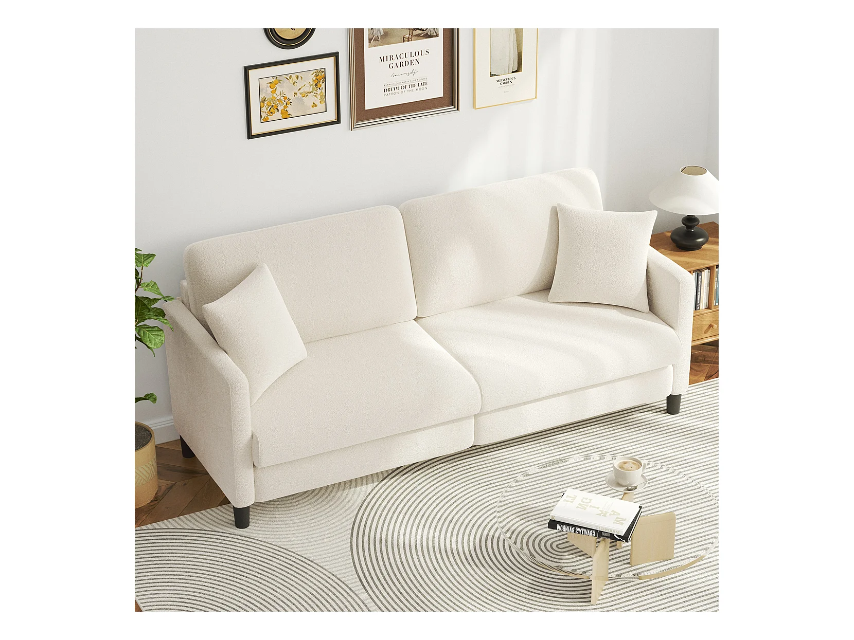 Canapé 3 Places en Velours Teddy,Canapé Droit Confort en Bois Massif,Loveseat avec Accoudoirs,193x79x89cm,Beige