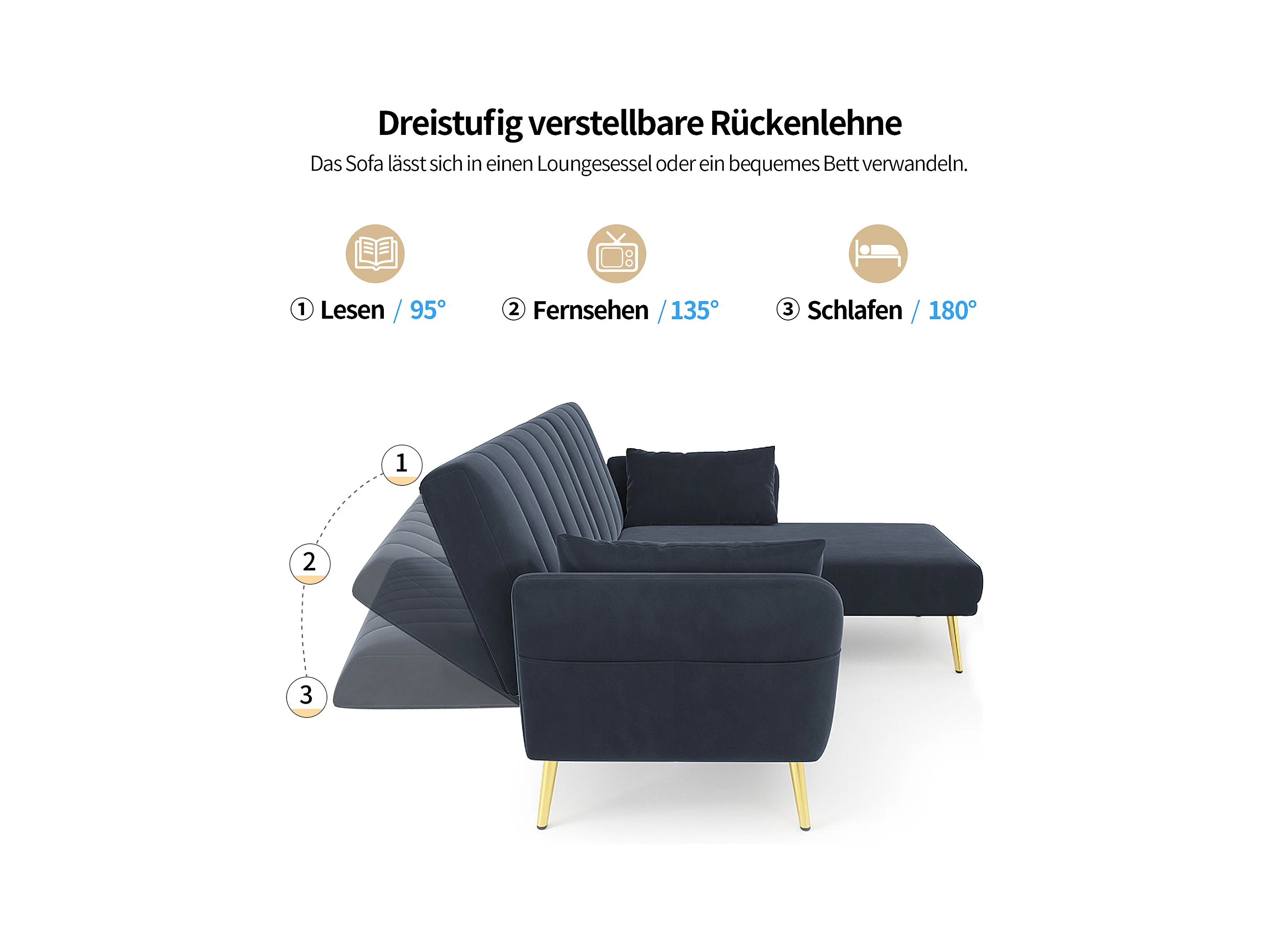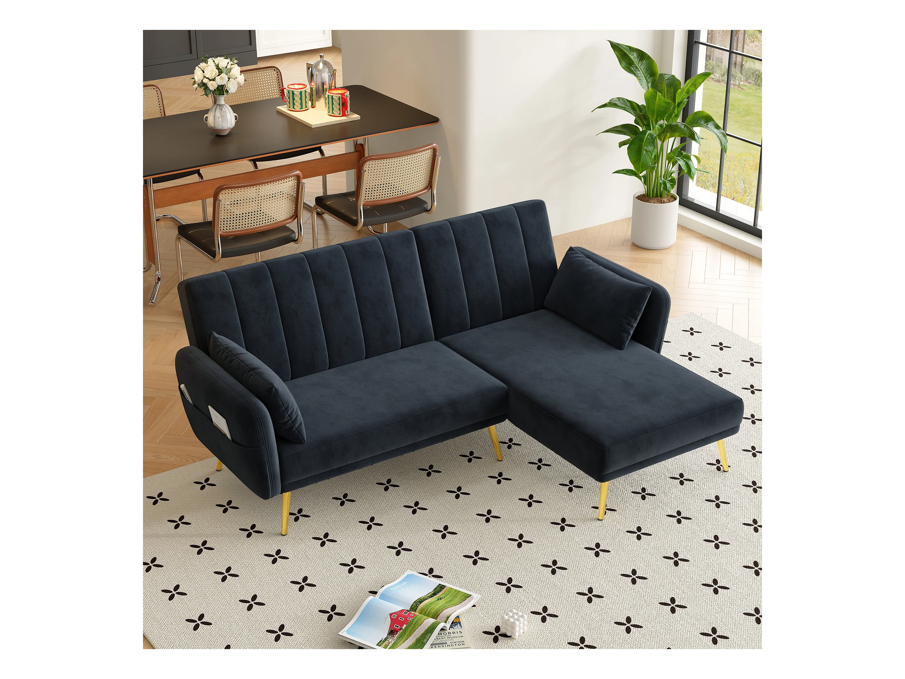 Canapé 3 places pliant - 191.5 x 130 x 80 cm - canapé d'angle avec fonction couchage - velours - noir